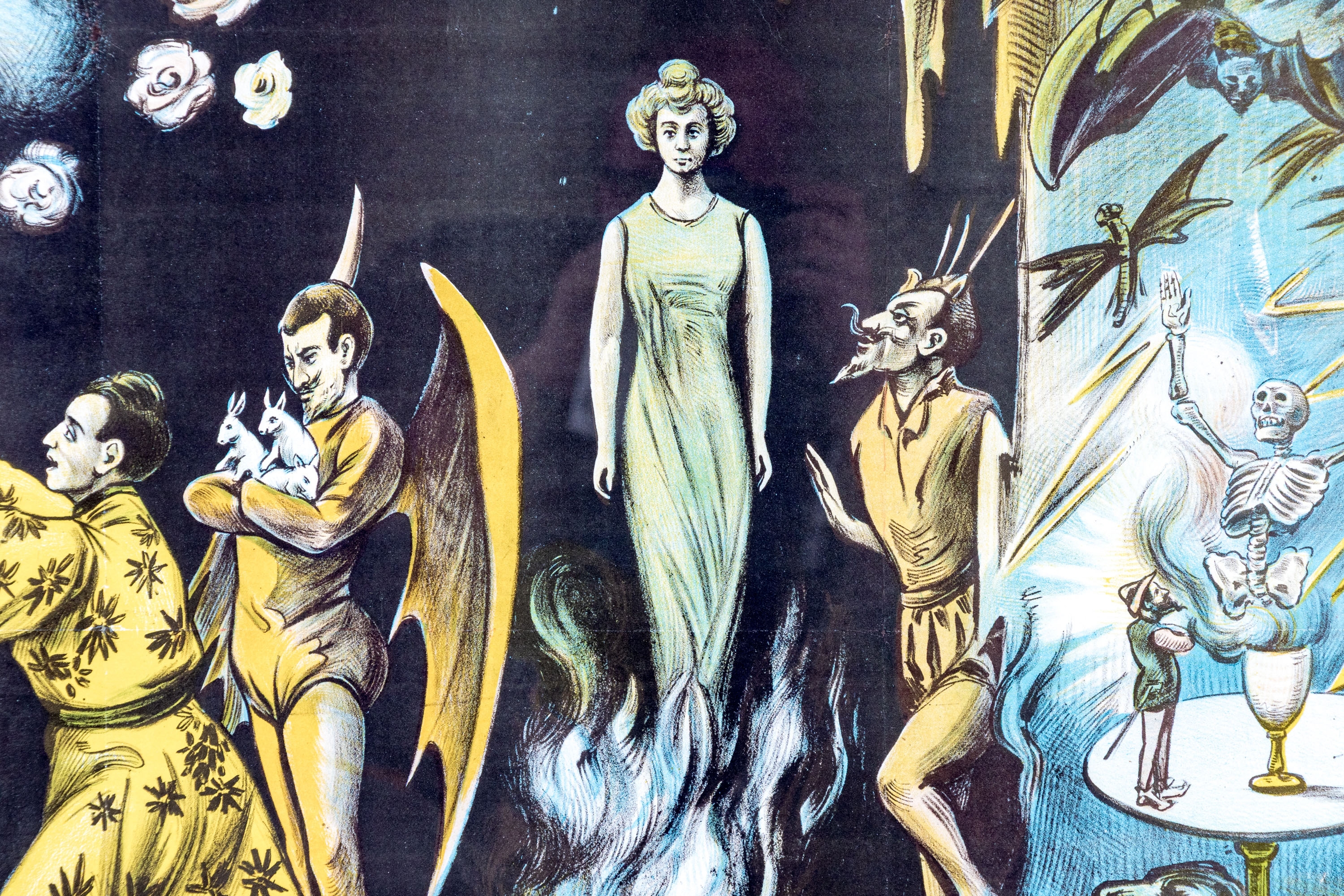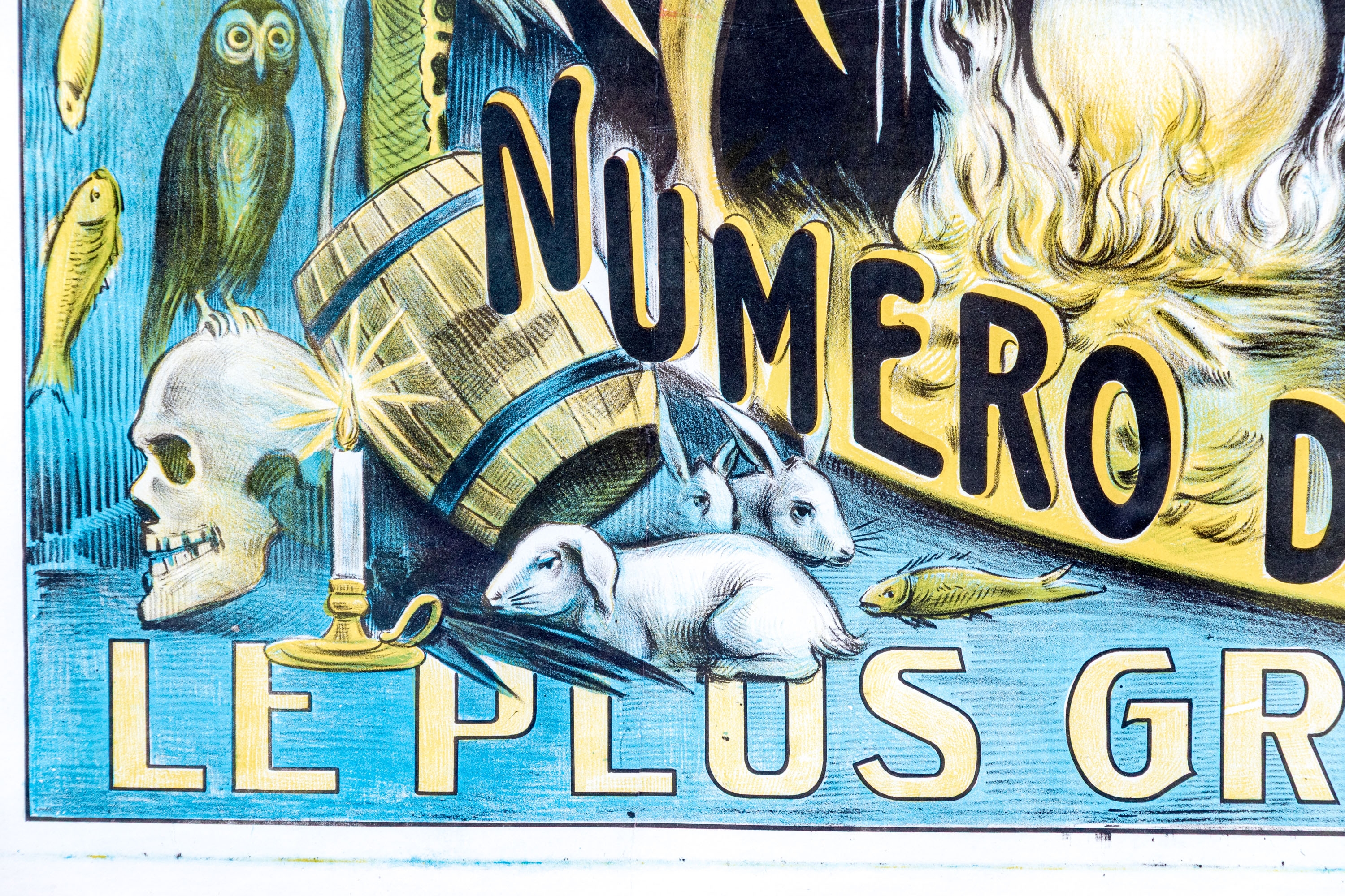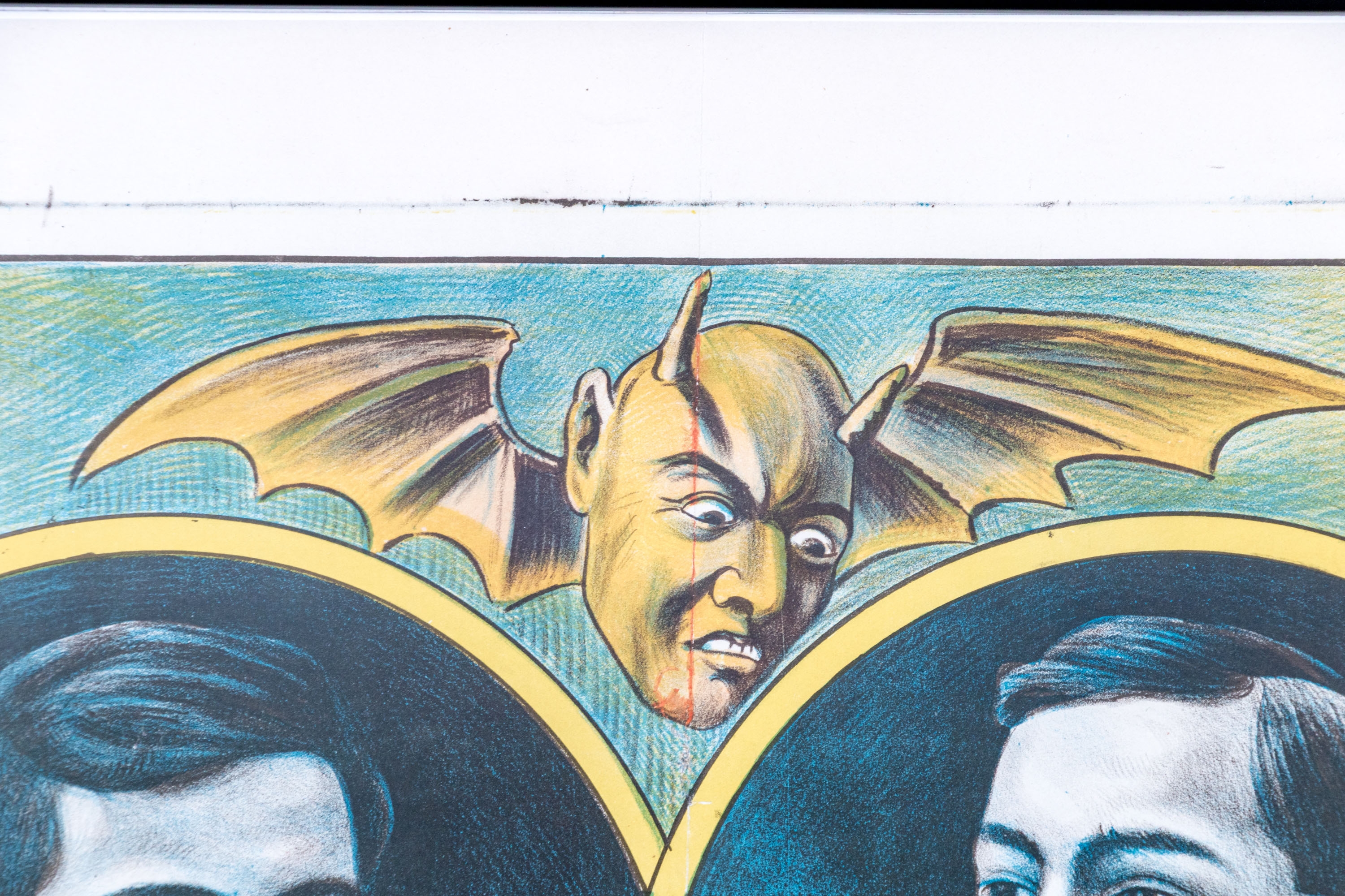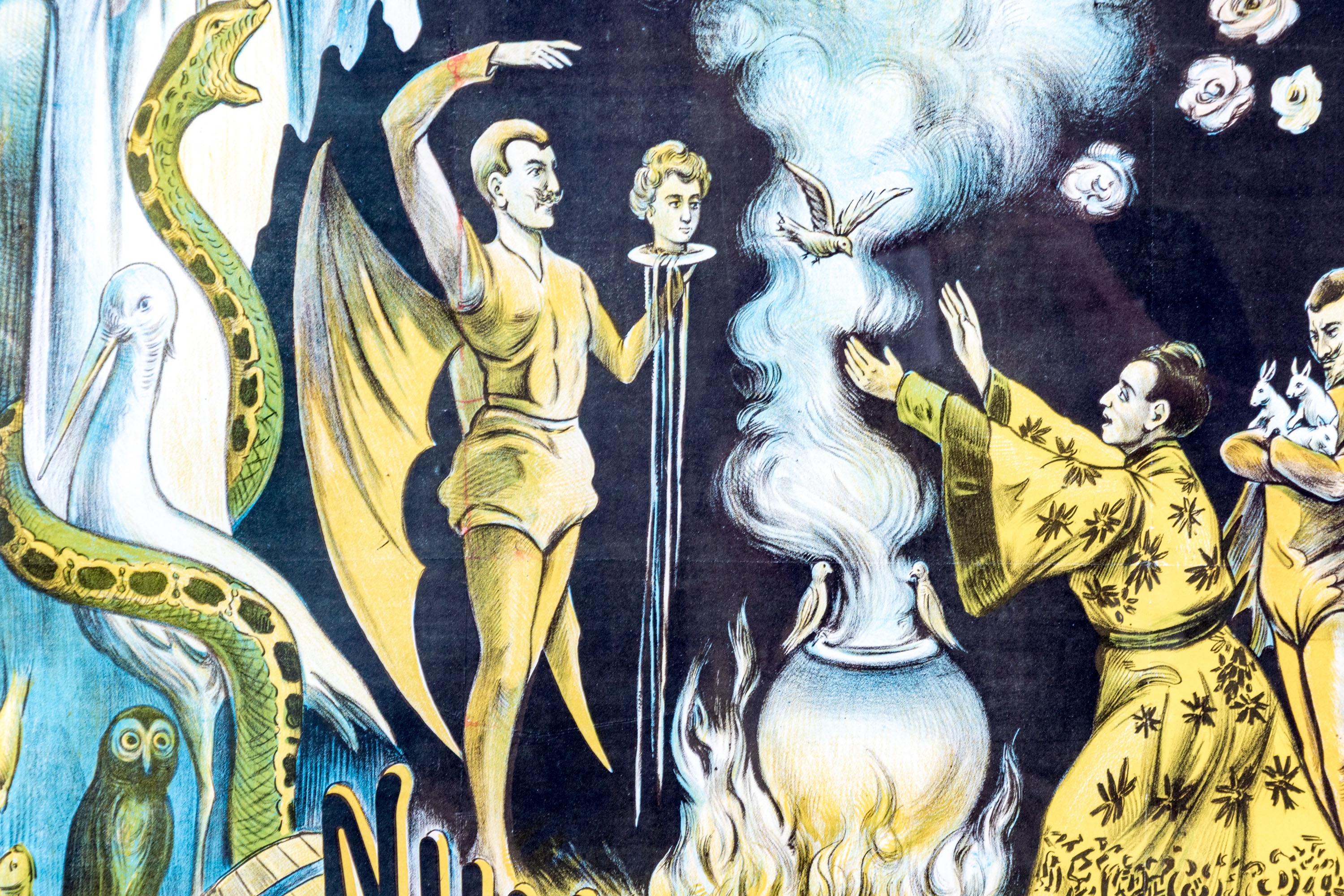 A fantastic antique advertising poster for "The Fak Hongs Le Plus Grand," ca. 1930. Lithograph published by E. Mirabet, Valencia, Spain. The oversized poster features portraits of two gentlemen in white within circular medallions over a two-part scene depicting figures, birds, and mythological motifs with a yellow-green top and blue bottom. The poster reads "The Fak Hongs, Numero D'Illusion, Le Plus Grand Du Monde."