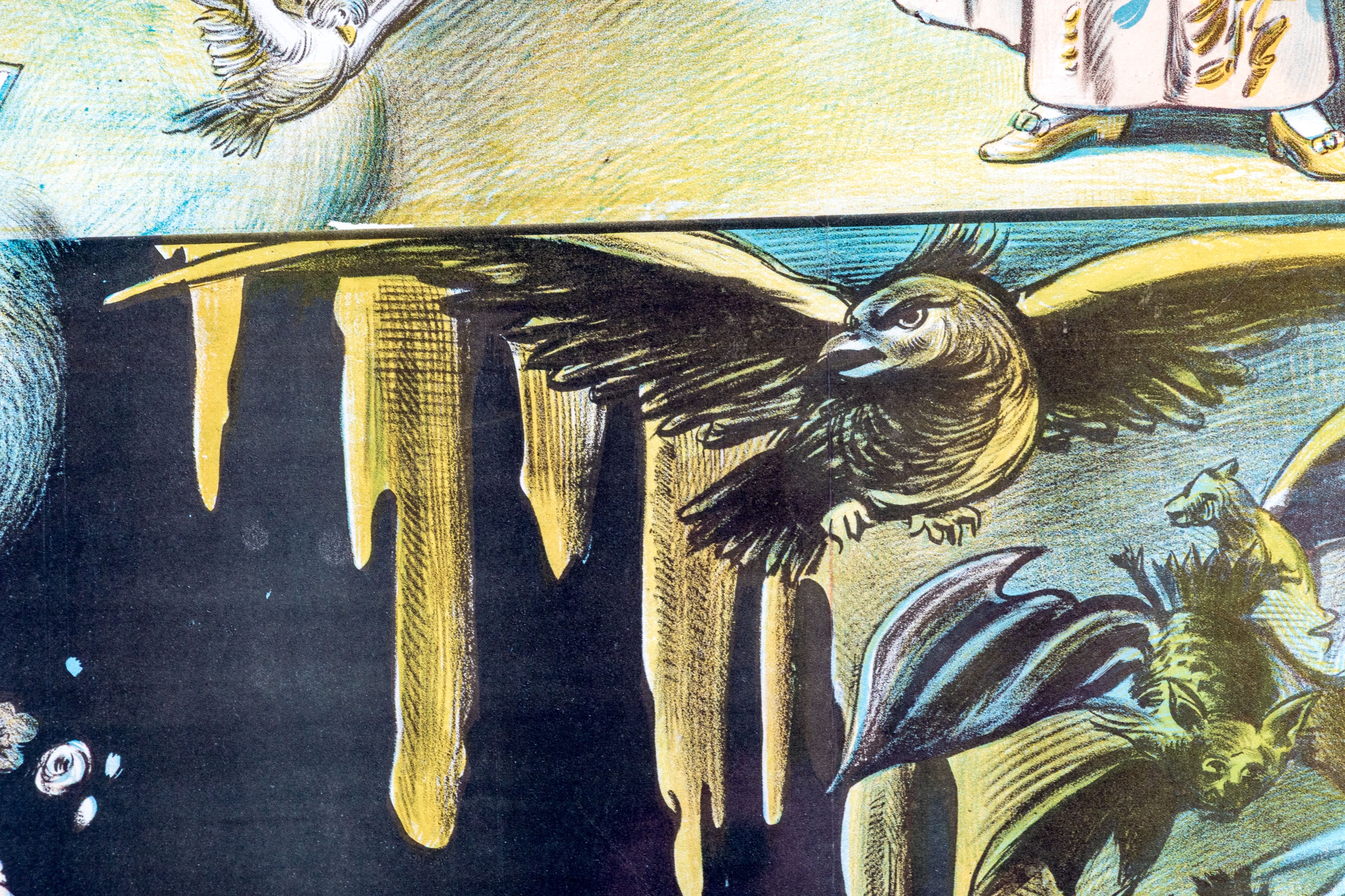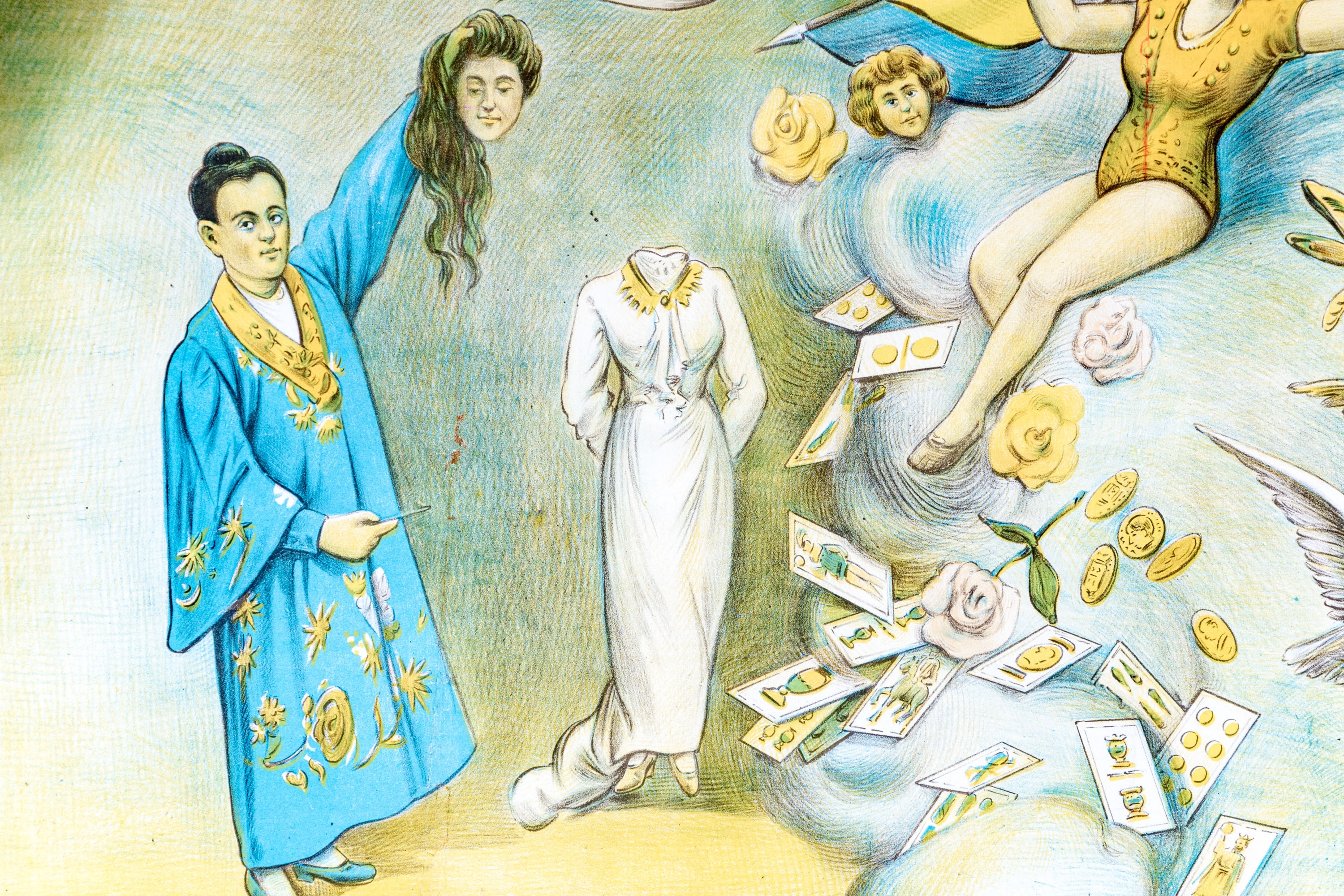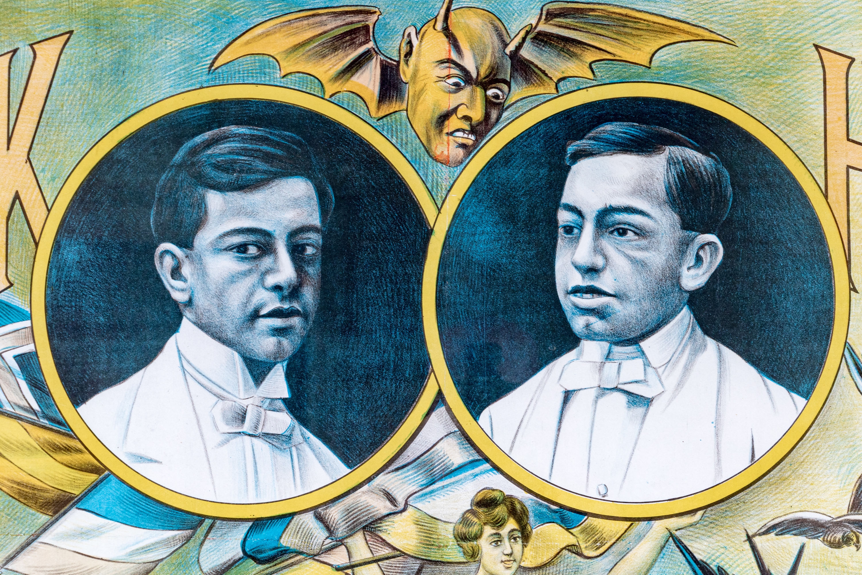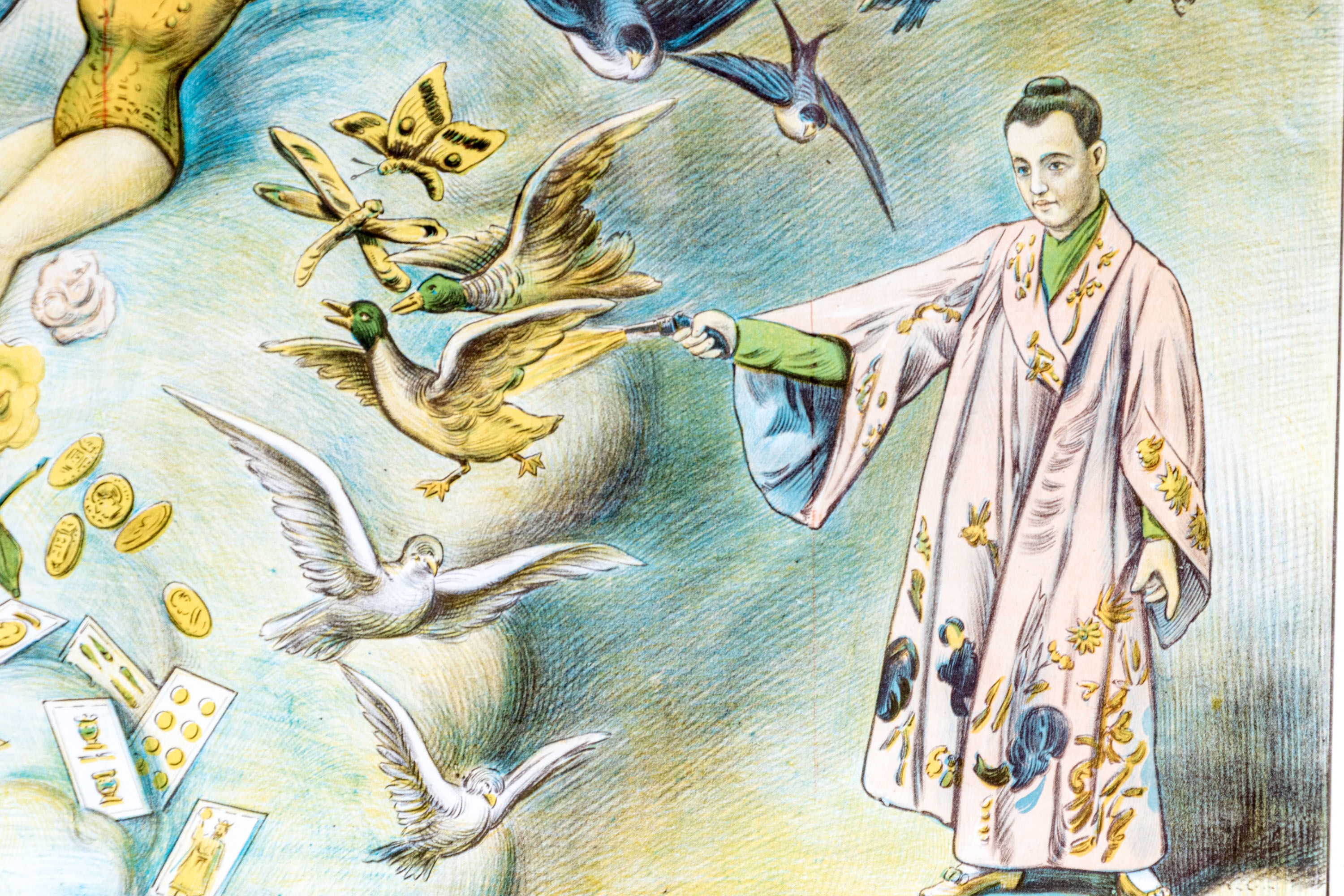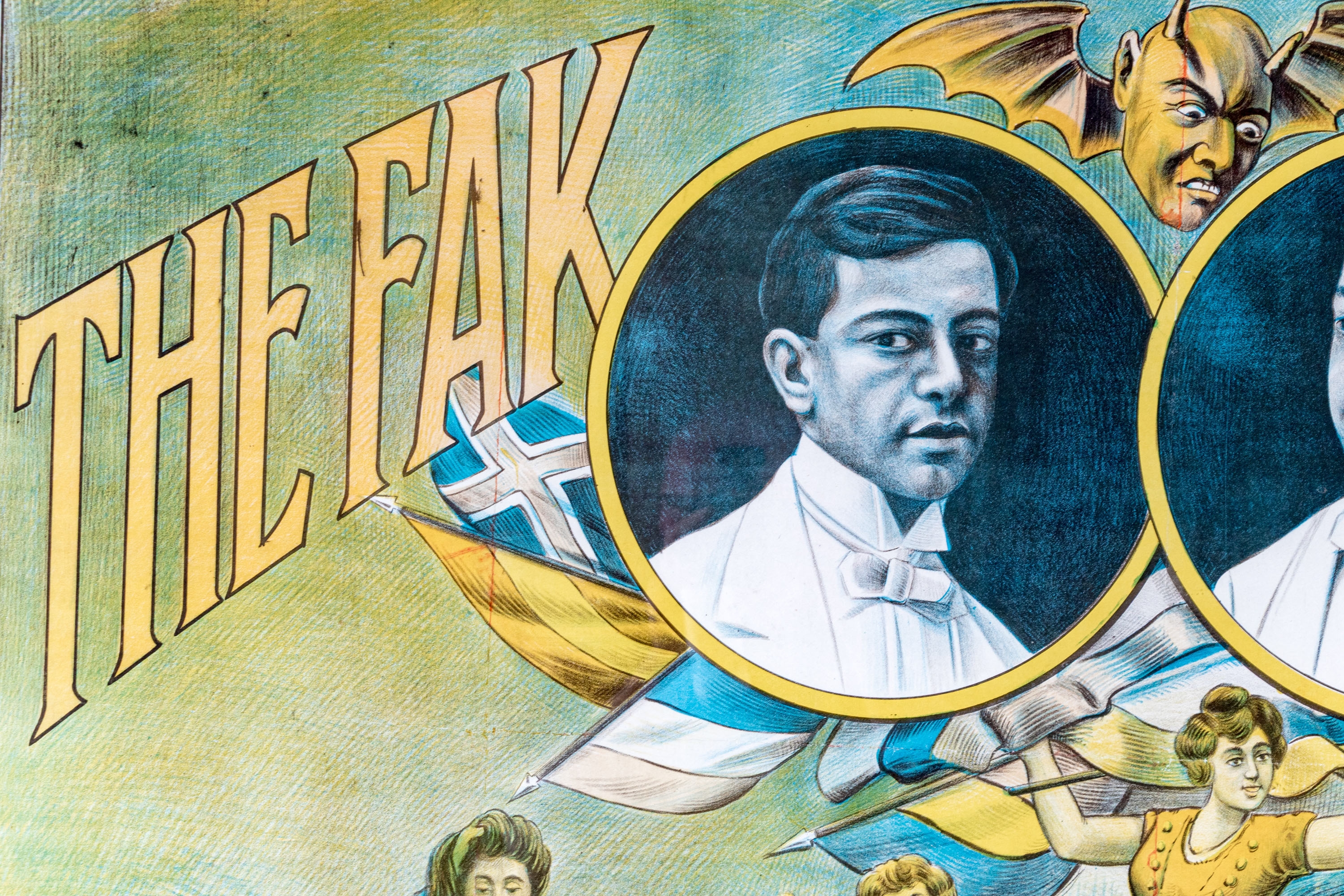 A fantastic antique advertising poster for "The Fak Hongs Le Plus Grand," ca. 1930. Lithograph published by E. Mirabet, Valencia, Spain. The oversized poster features portraits of two gentlemen in white within circular medallions over a two-part scene depicting figures, birds, and mythological motifs with a yellow-green top and blue bottom. The poster reads "The Fak Hongs, Numero D'Illusion, Le Plus Grand Du Monde."