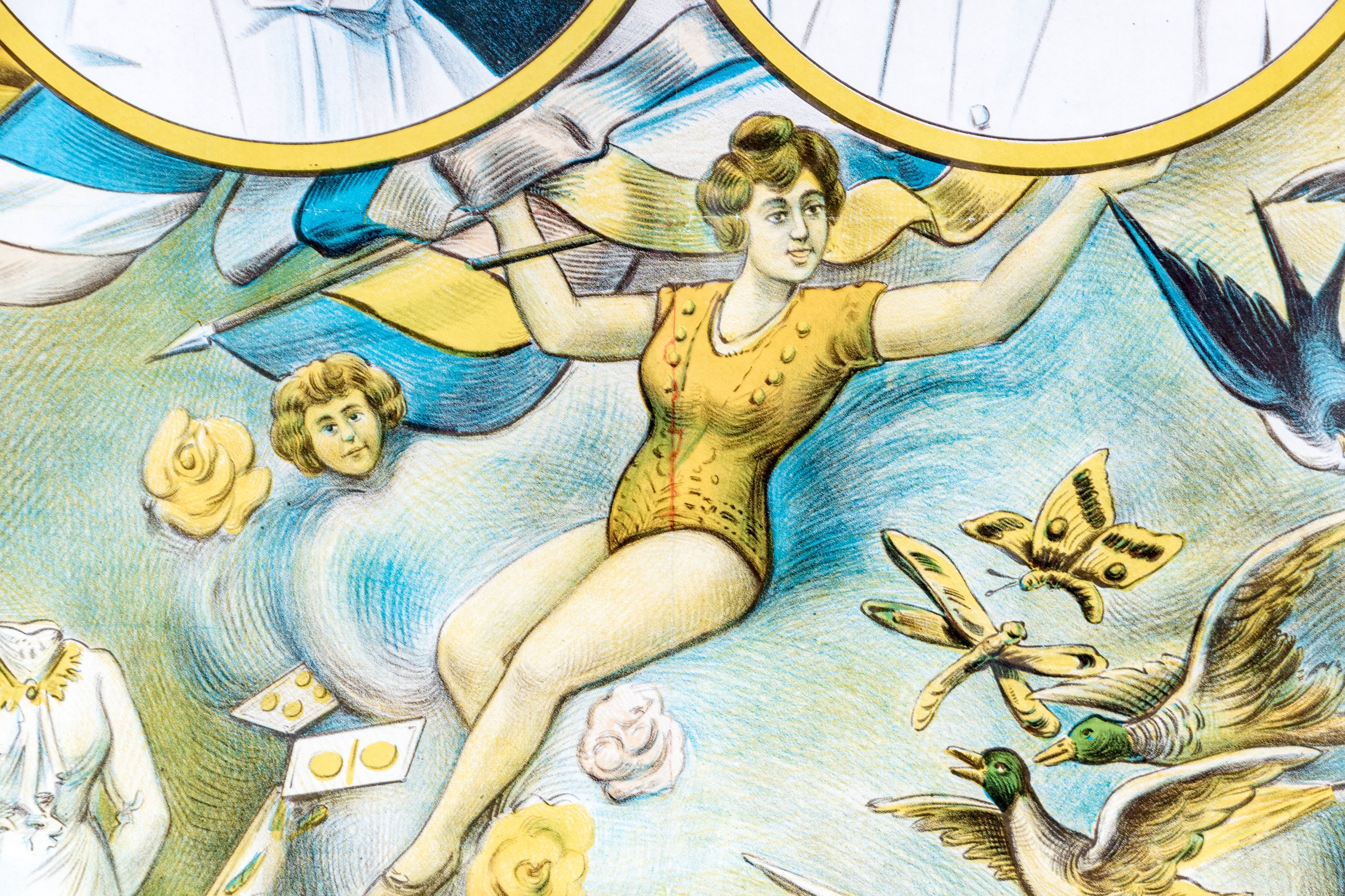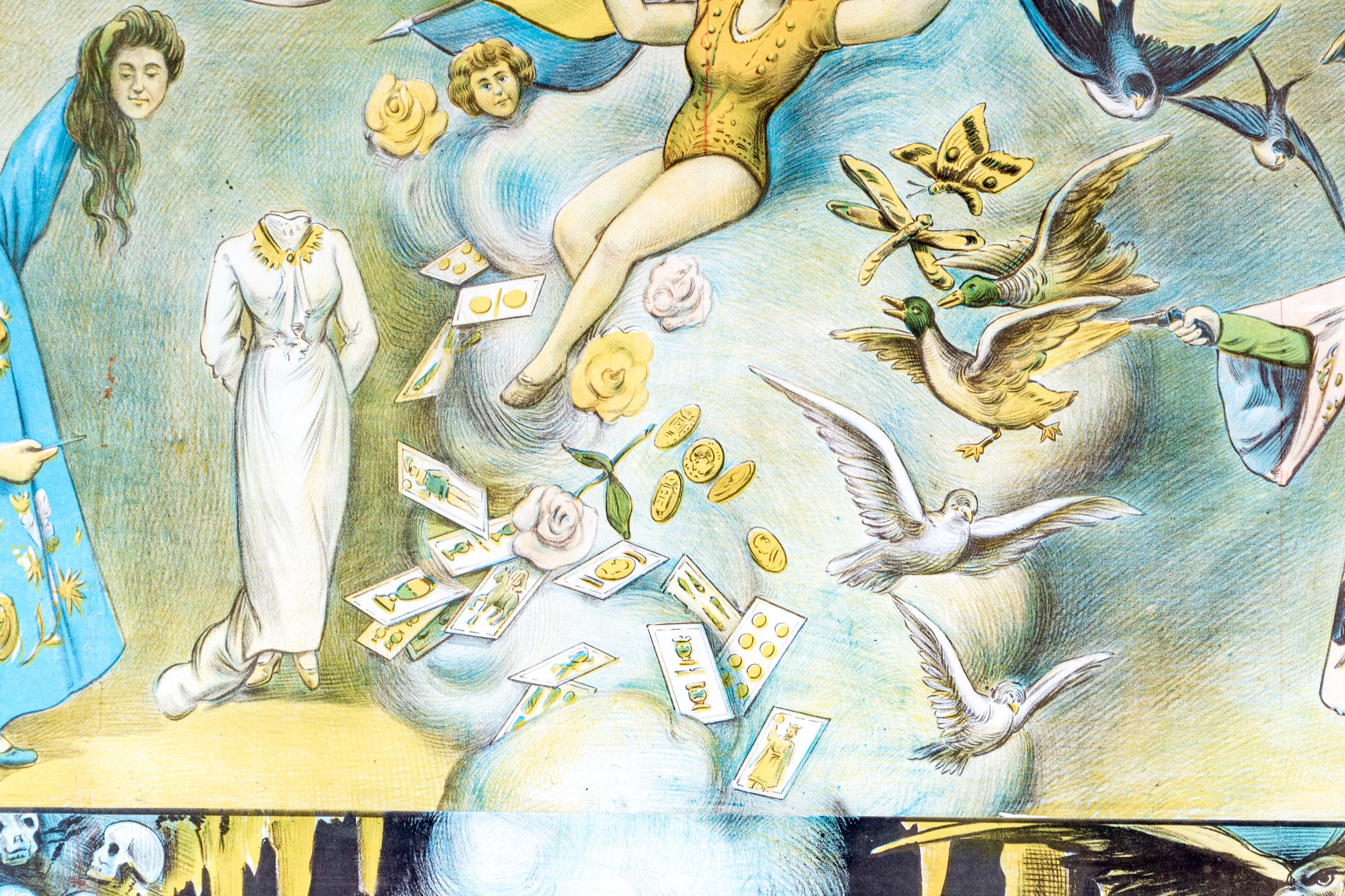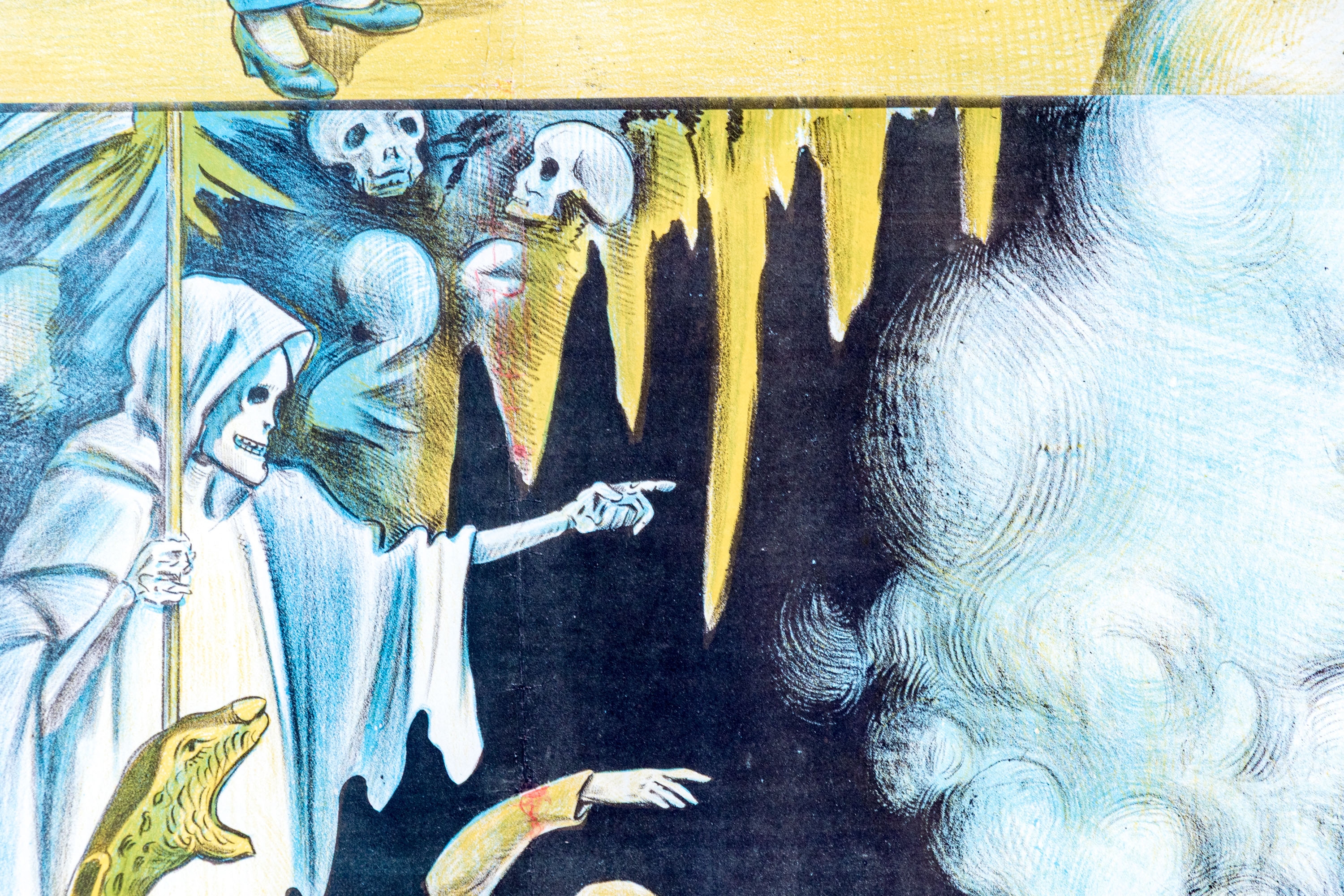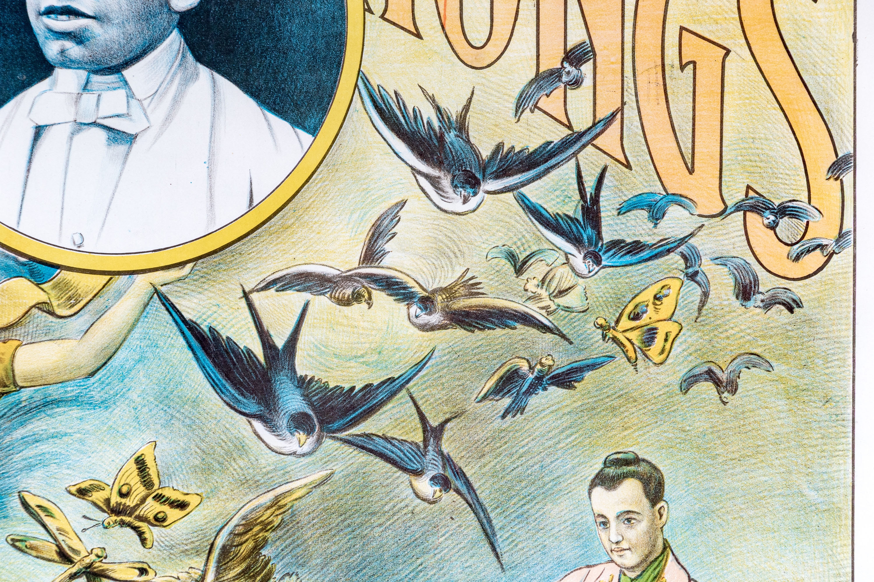 A fantastic antique advertising poster for "The Fak Hongs Le Plus Grand," ca. 1930. Lithograph published by E. Mirabet, Valencia, Spain. The oversized poster features portraits of two gentlemen in white within circular medallions over a two-part scene depicting figures, birds, and mythological motifs with a yellow-green top and blue bottom. The poster reads "The Fak Hongs, Numero D'Illusion, Le Plus Grand Du Monde."