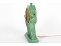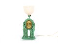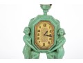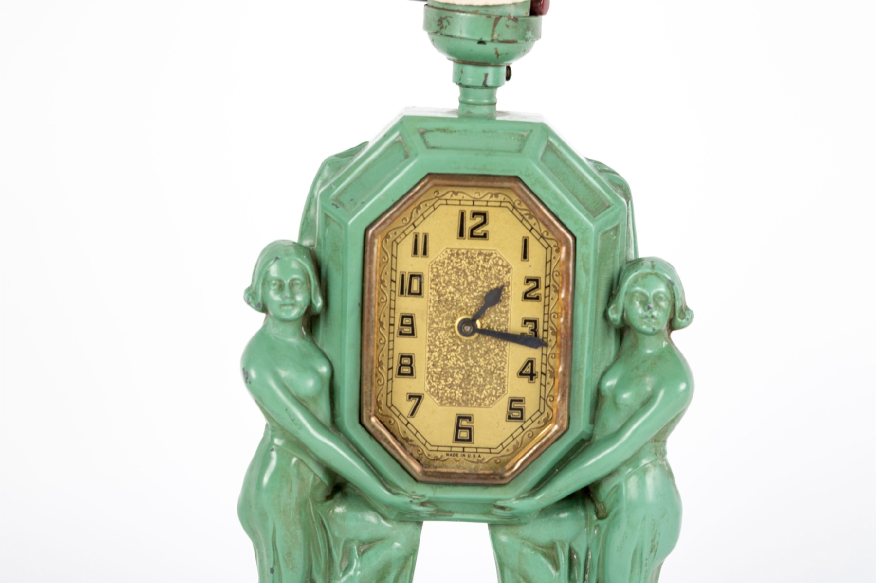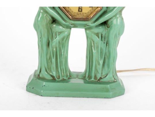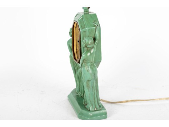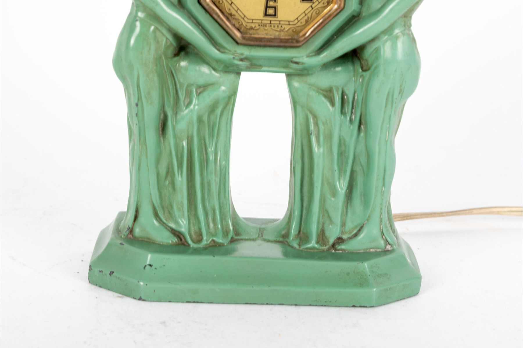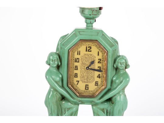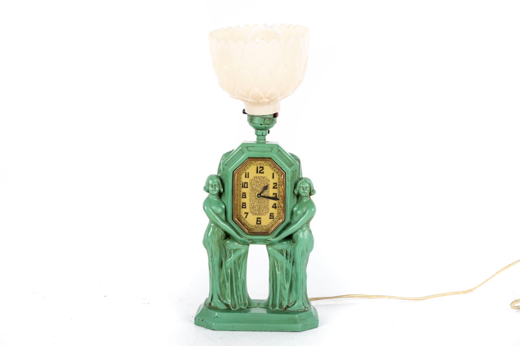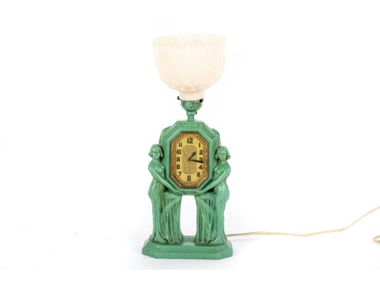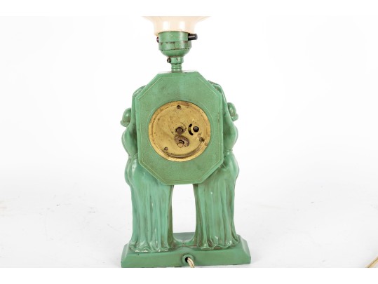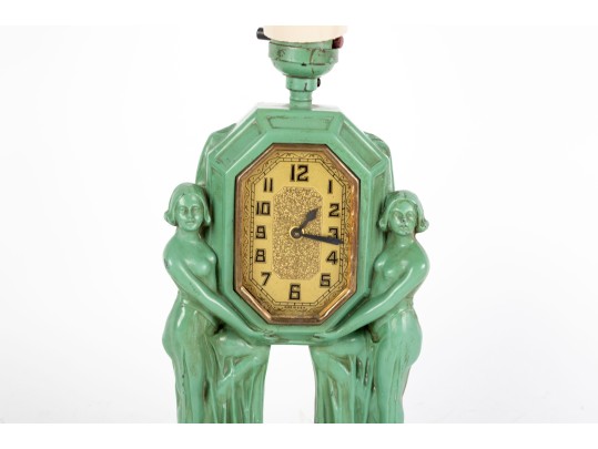 A striking Art Deco desk clock lamp, attributed to Frankart, featuring a distinctive seafoam green cast metal body with two elegantly sculpted nude female figures holding an octagonal clock face with a golden-tone dial. Topped with a frosted glass lotus-shaped shade, this piece beautifully captures the streamlined aesthetic of the 1920's-1930's