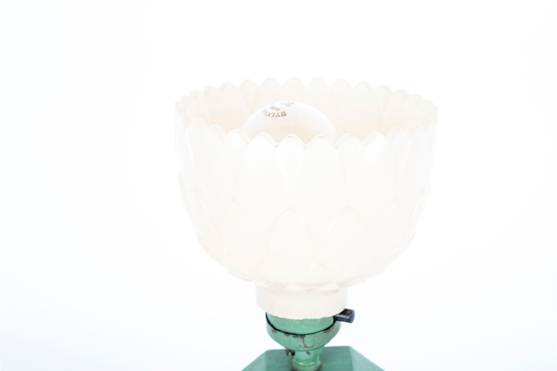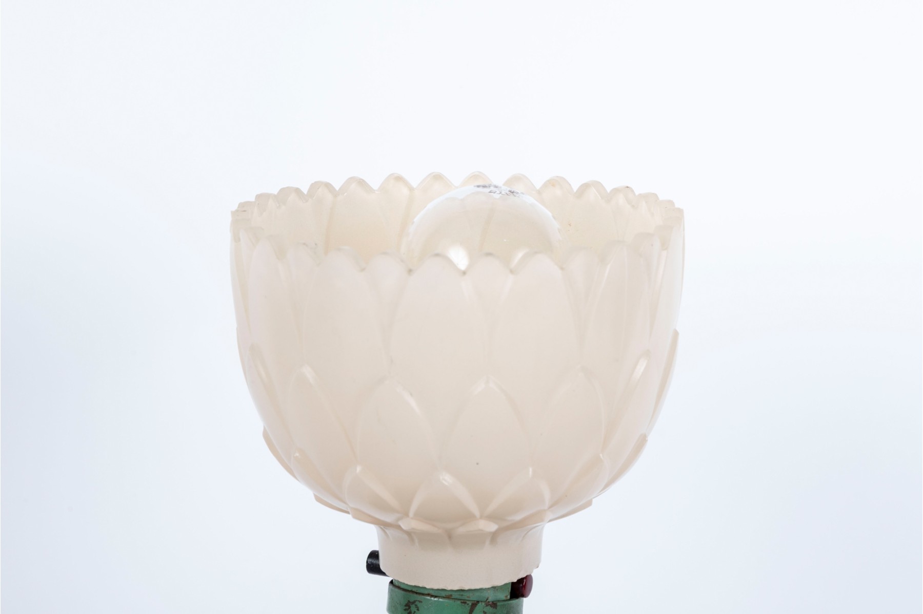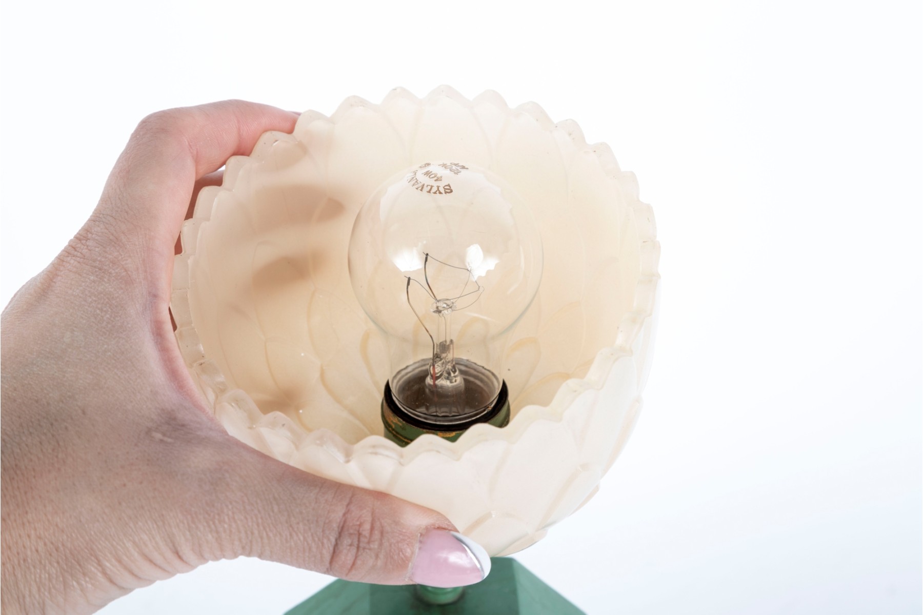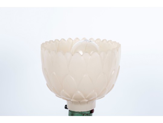 Light tested functional, clock is not operational. Consistent with age. Shade does not fit properly.