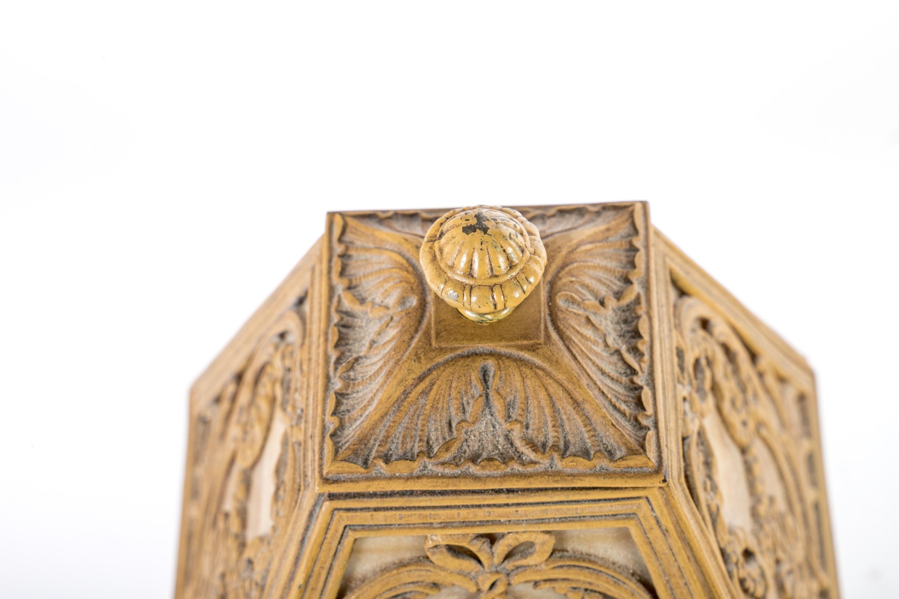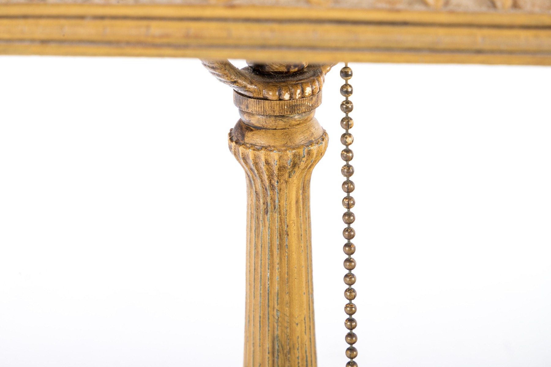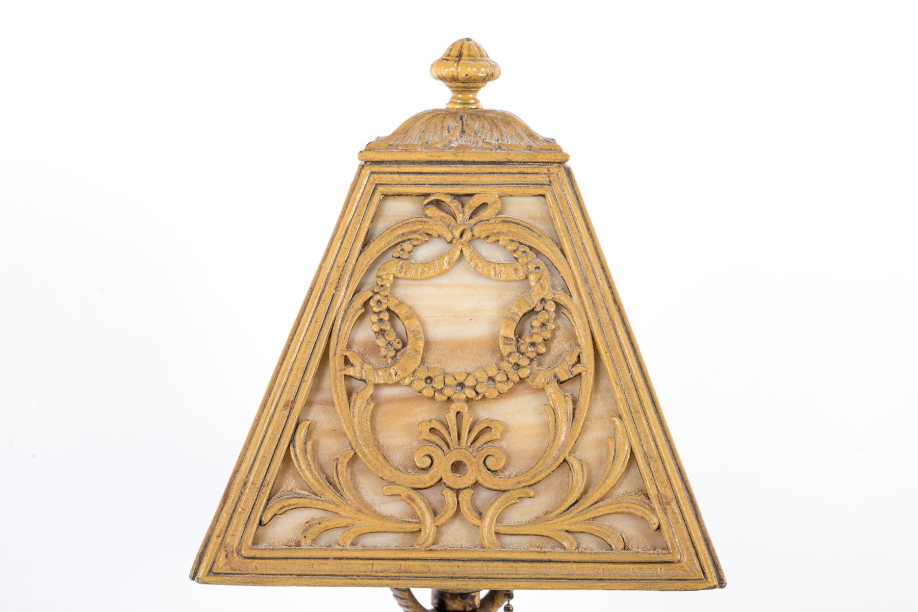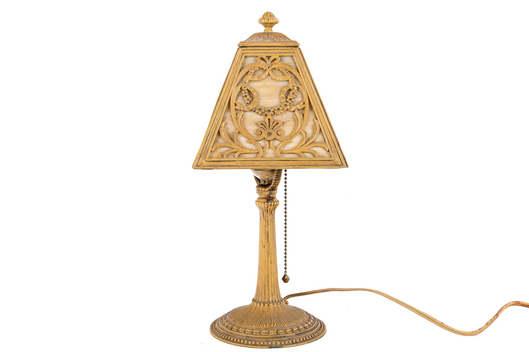 A vintage boudoir lamp with delightful Art Deco style, displaying a tapered trapezoidal cream slag glass shade overlaid with foliate scrolls and floral wreaths, supported by a finely fluted yellow-beige metal neck finishing with a gently domed circular base with banded borders of floral tessellations and stippled trims.