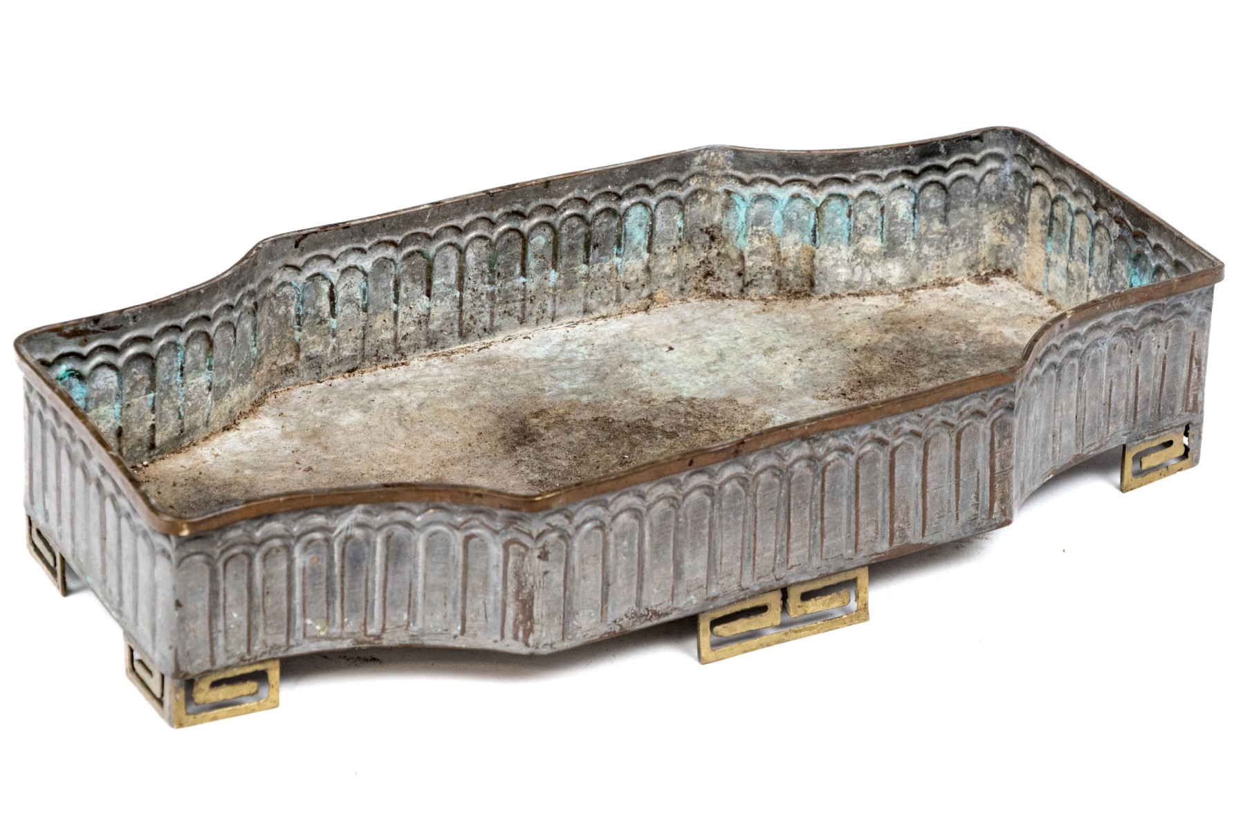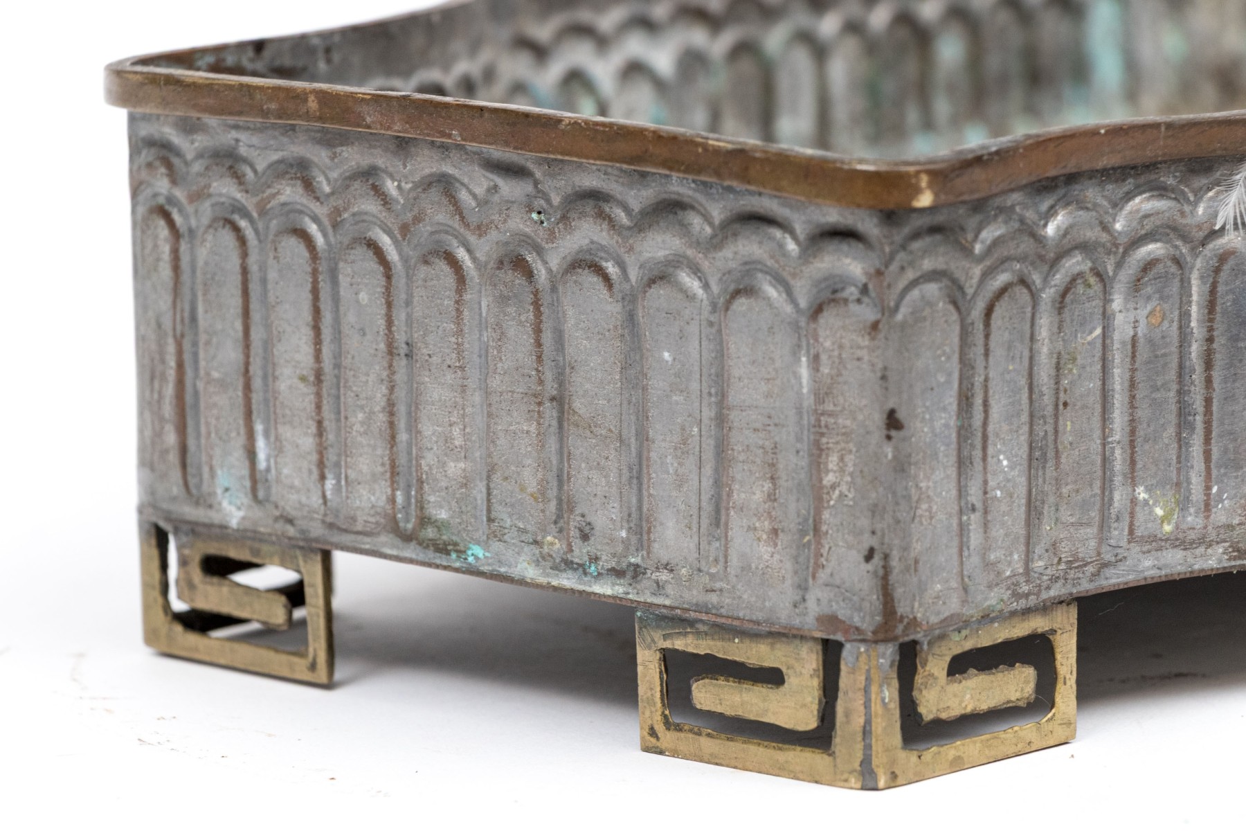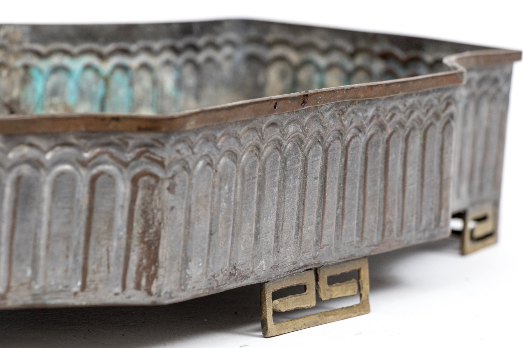 A fabulous planter with great Art Deco style in a variety of metal finish making for a highly decorative appearance. The planter sports a rectangular form with curved bracketed sides in gray metal with arched fluting adding great depth and texture. The copper finished rim and brass key fret bracket feet add subtle pops of color with a nice time-loved patina. Made in China.
