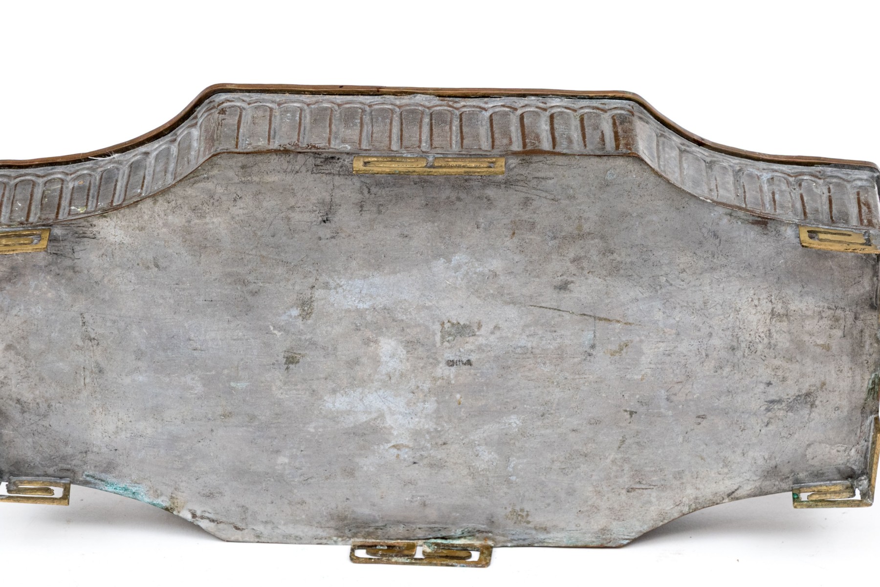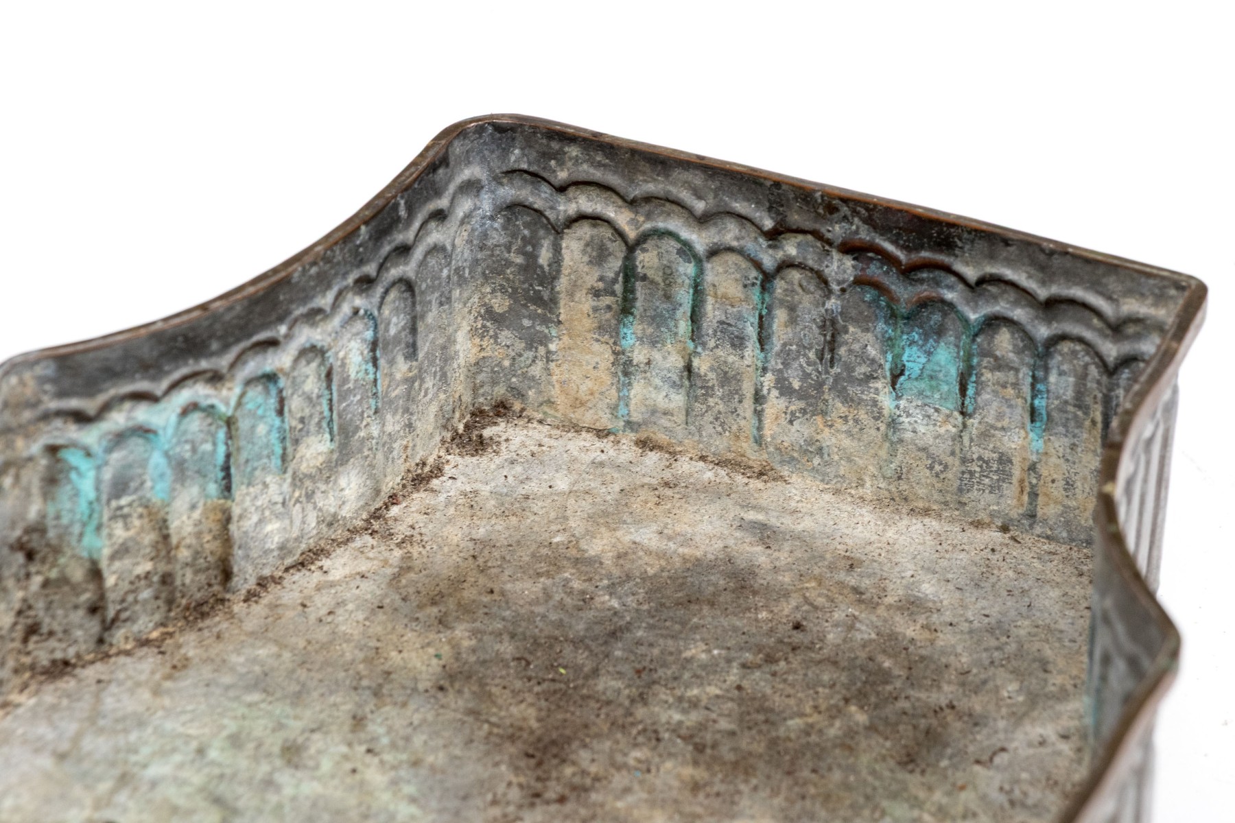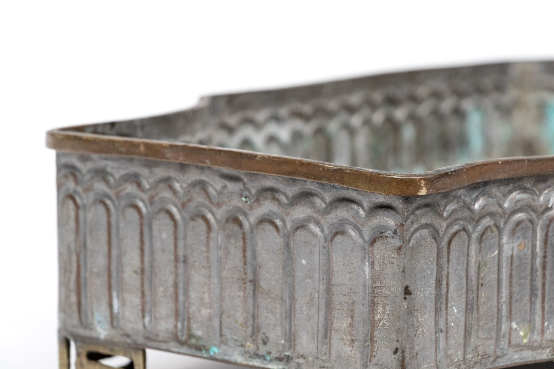 A fabulous planter with great Art Deco style in a variety of metal finish making for a highly decorative appearance. The planter sports a rectangular form with curved bracketed sides in gray metal with arched fluting adding great depth and texture. The copper finished rim and brass key fret bracket feet add subtle pops of color with a nice time-loved patina. Made in China.