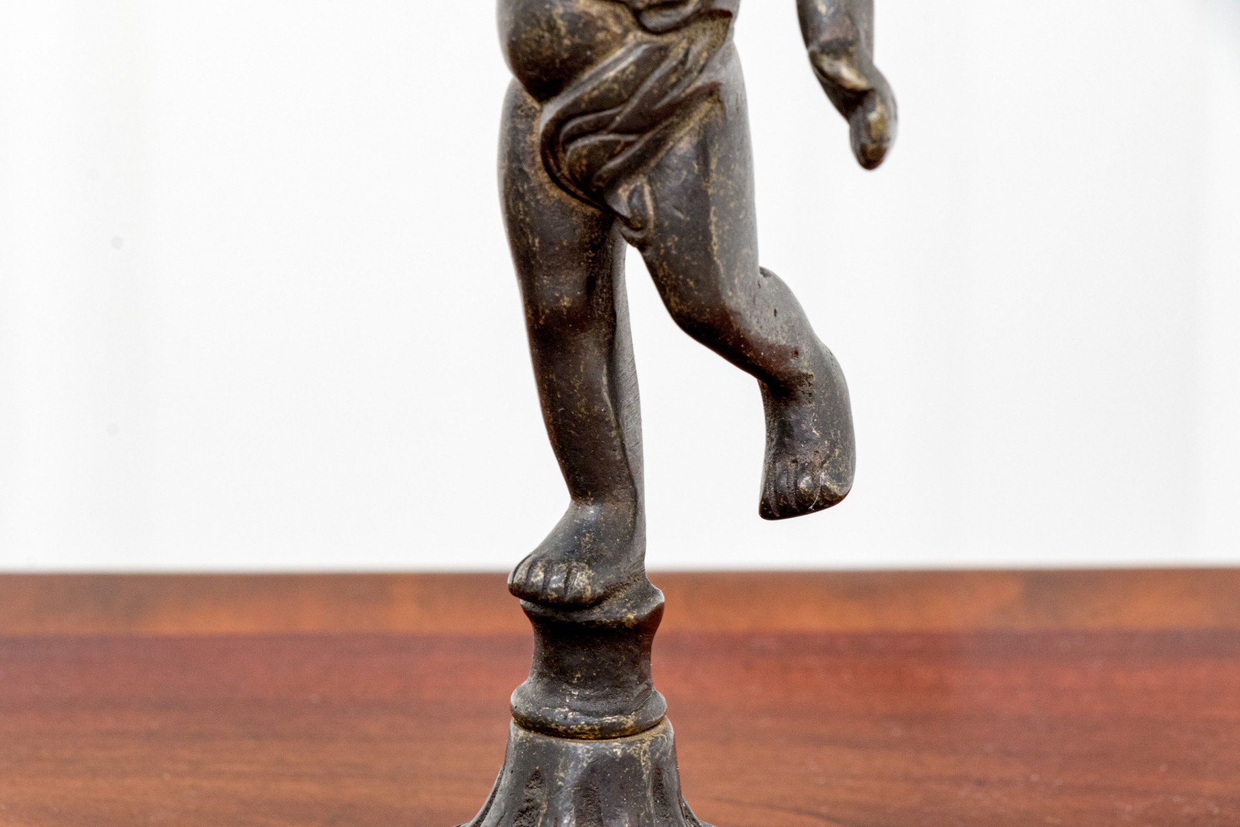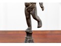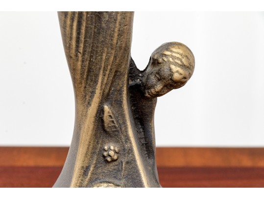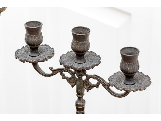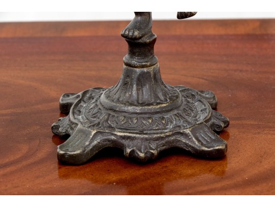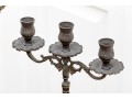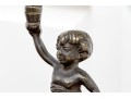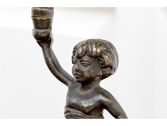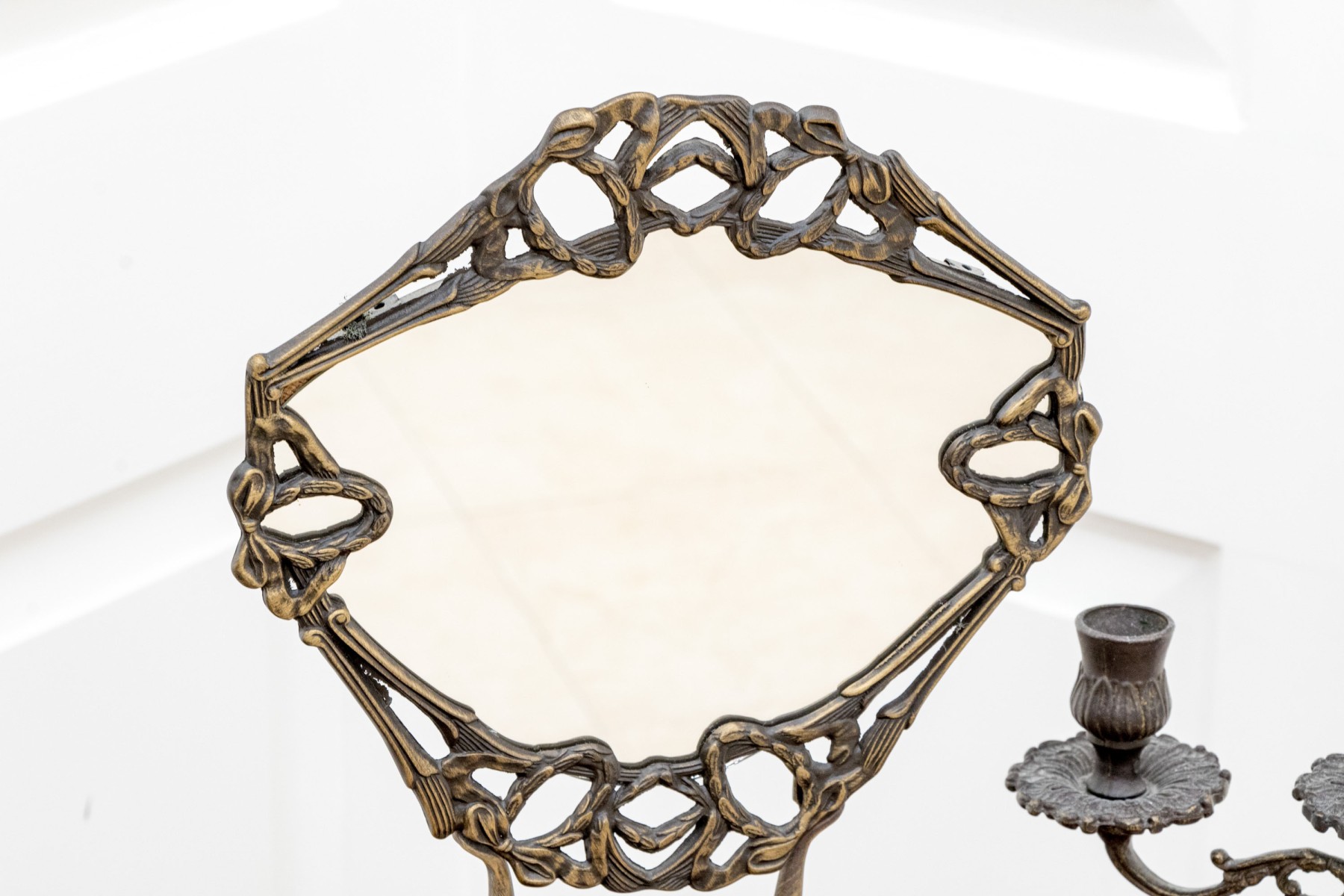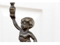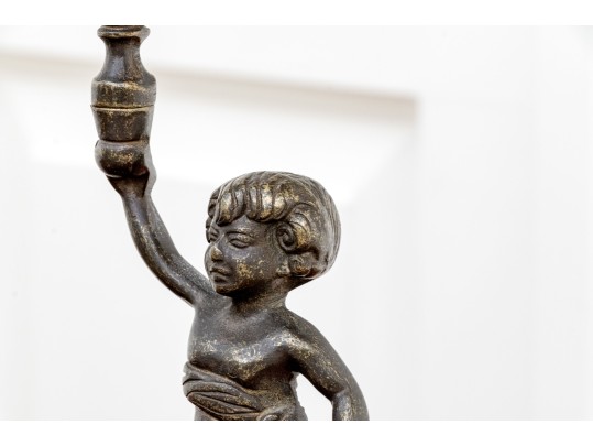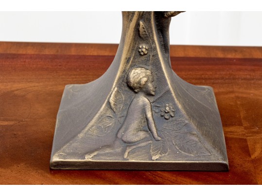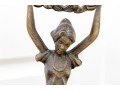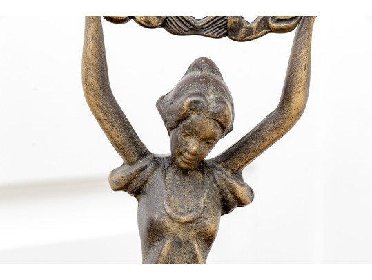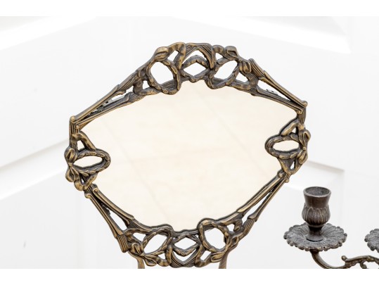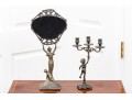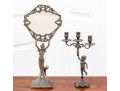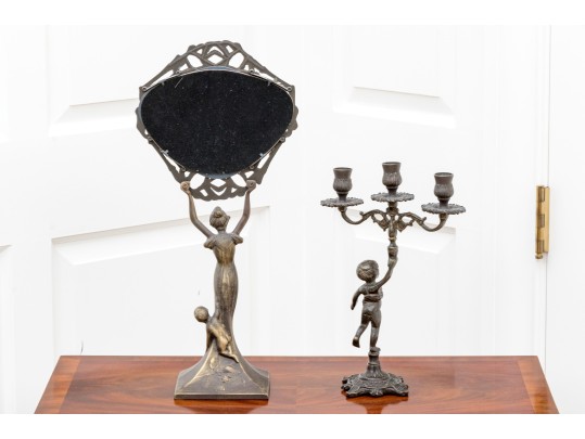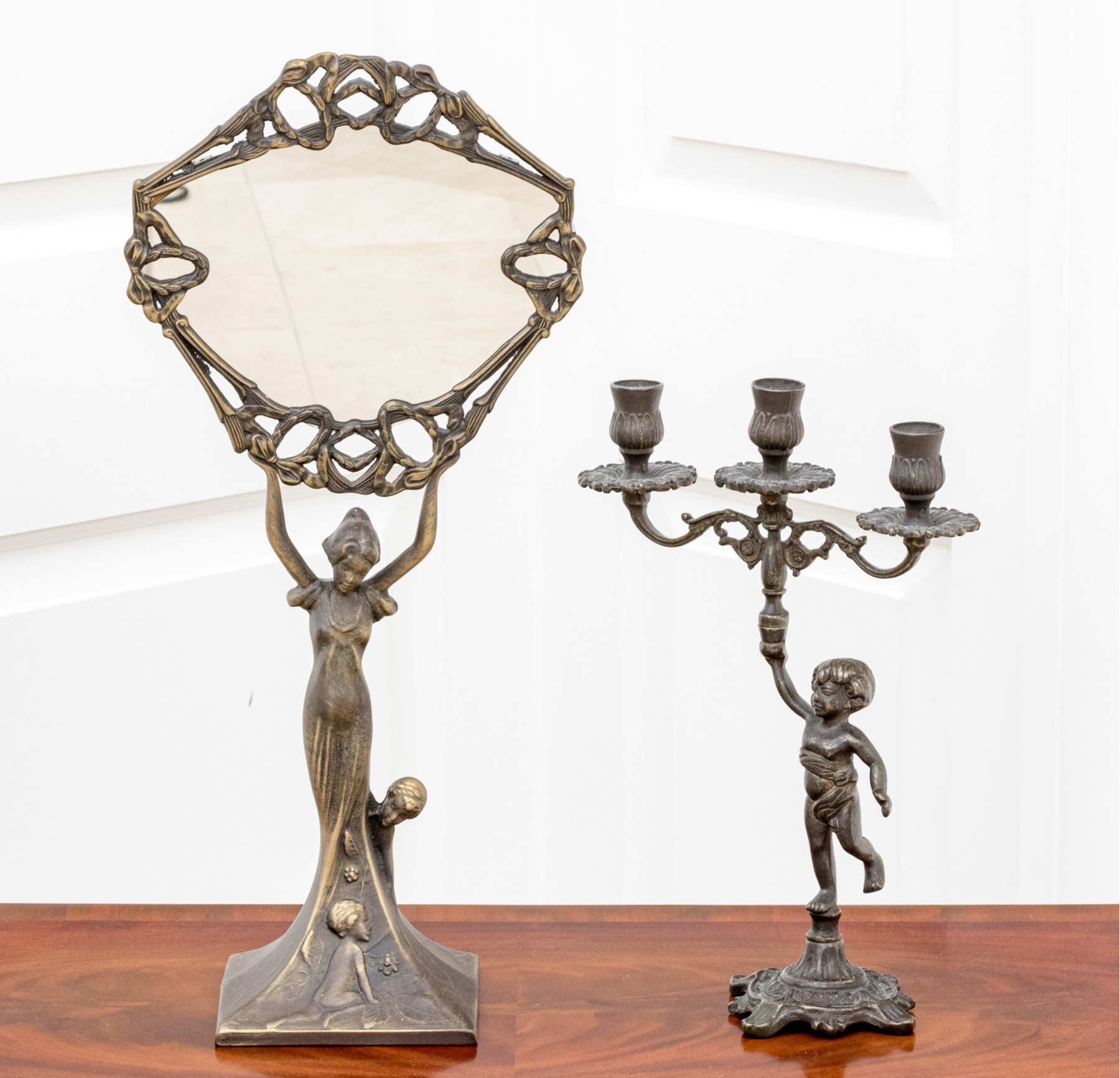 A fabulous duo of Art Nouveau style figural brass vanity decor, including a sculptural mirror held by an eleagnt woman, and a three-light candelabra held by a putti.