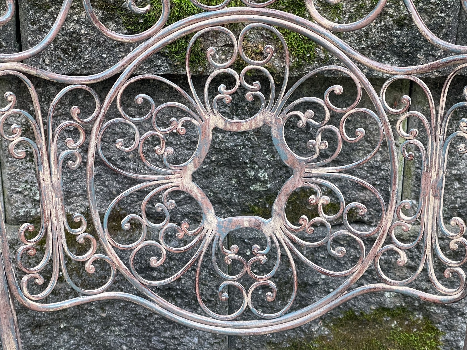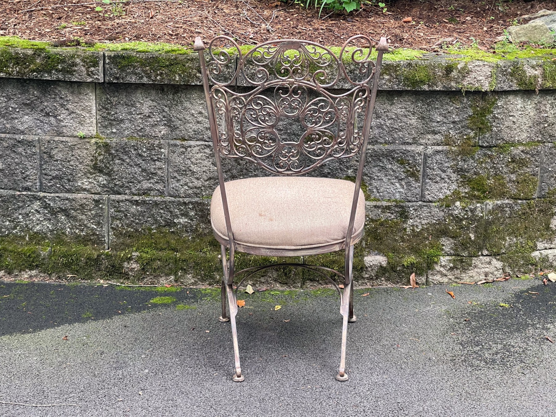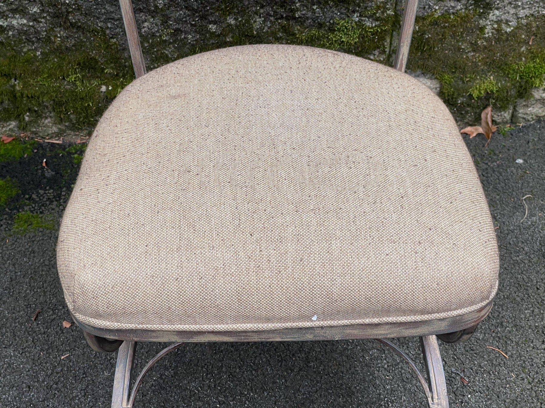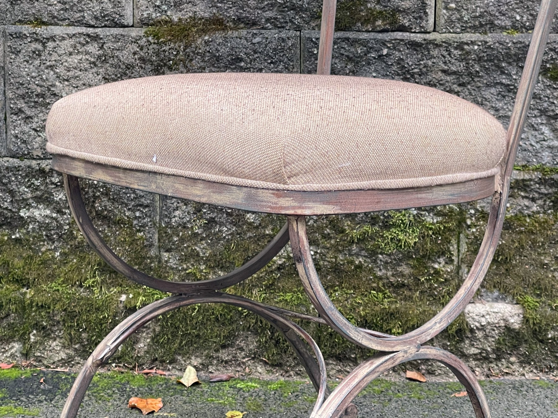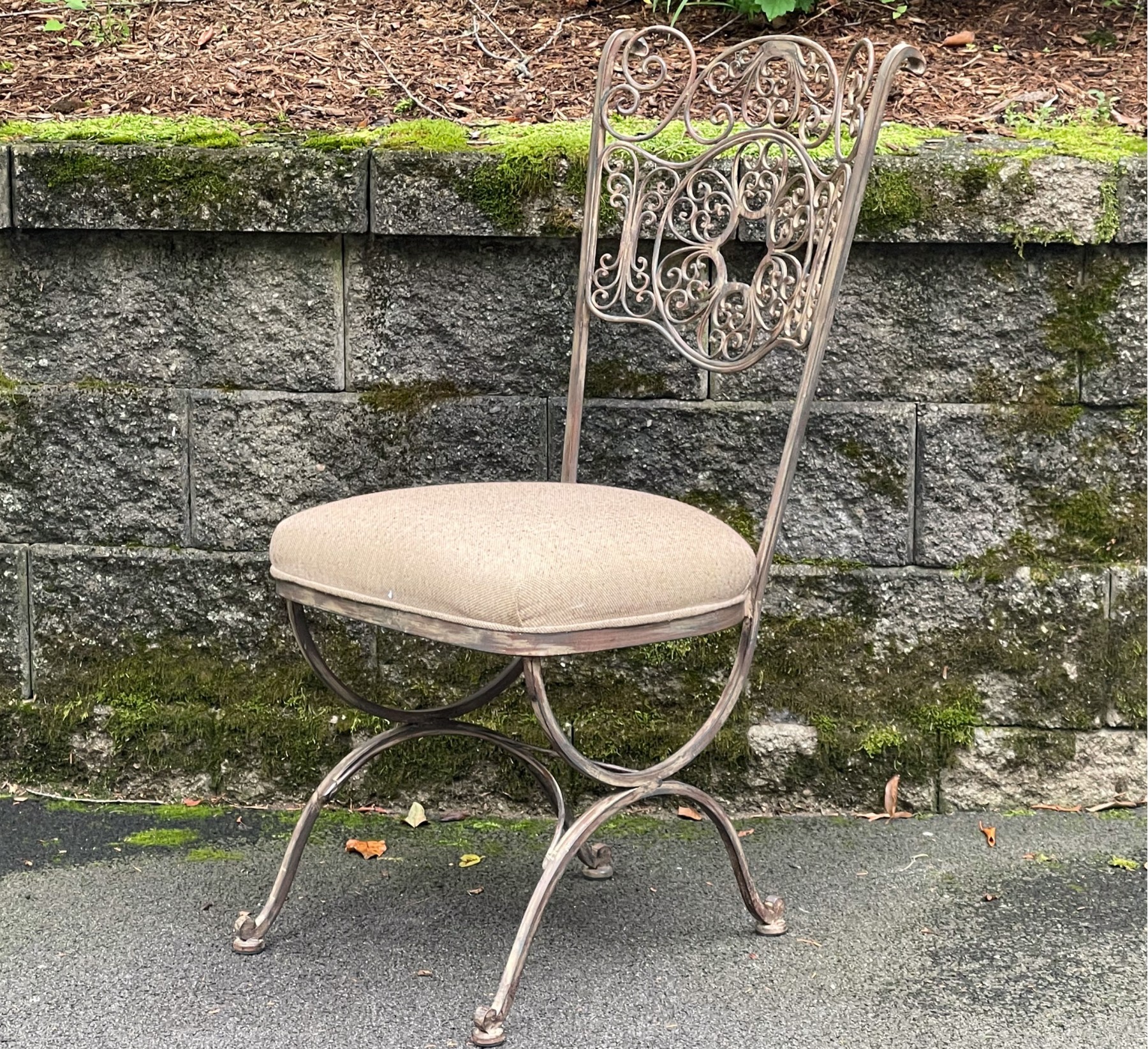 An elegant Art Nouveau style bistro side chair featuring an antiqued wrought iron frame with exquisite scrolled filigree designs along the back. upholstered in taupe beige on the seat. Raised on a curule form base with curved X-motif legs.