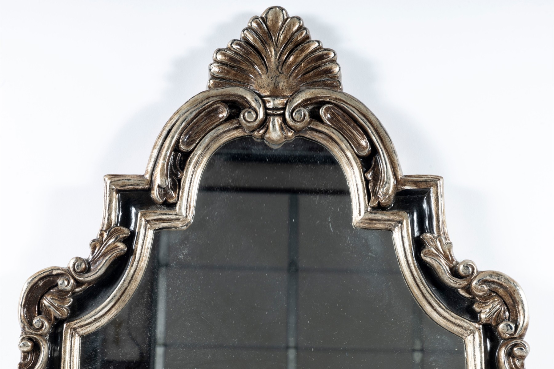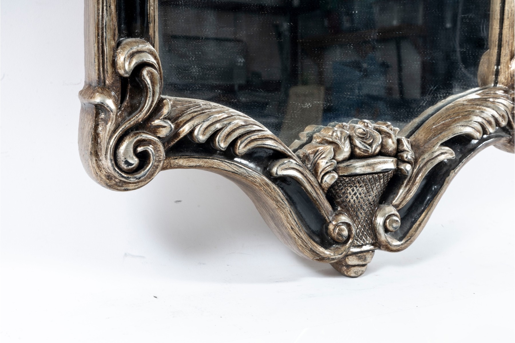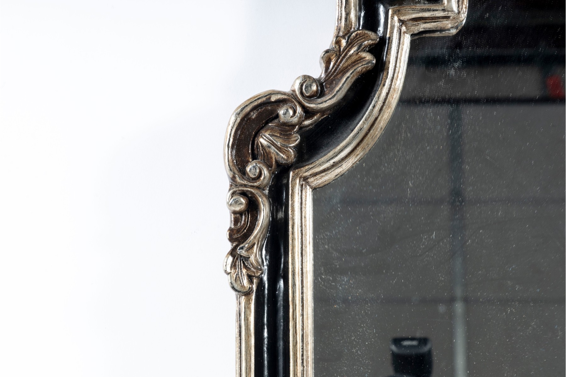 This Art Nouveau style wall mirror features a beautifully crafted silver and black painted wood frame, adorned with intricate foliate details throughout.