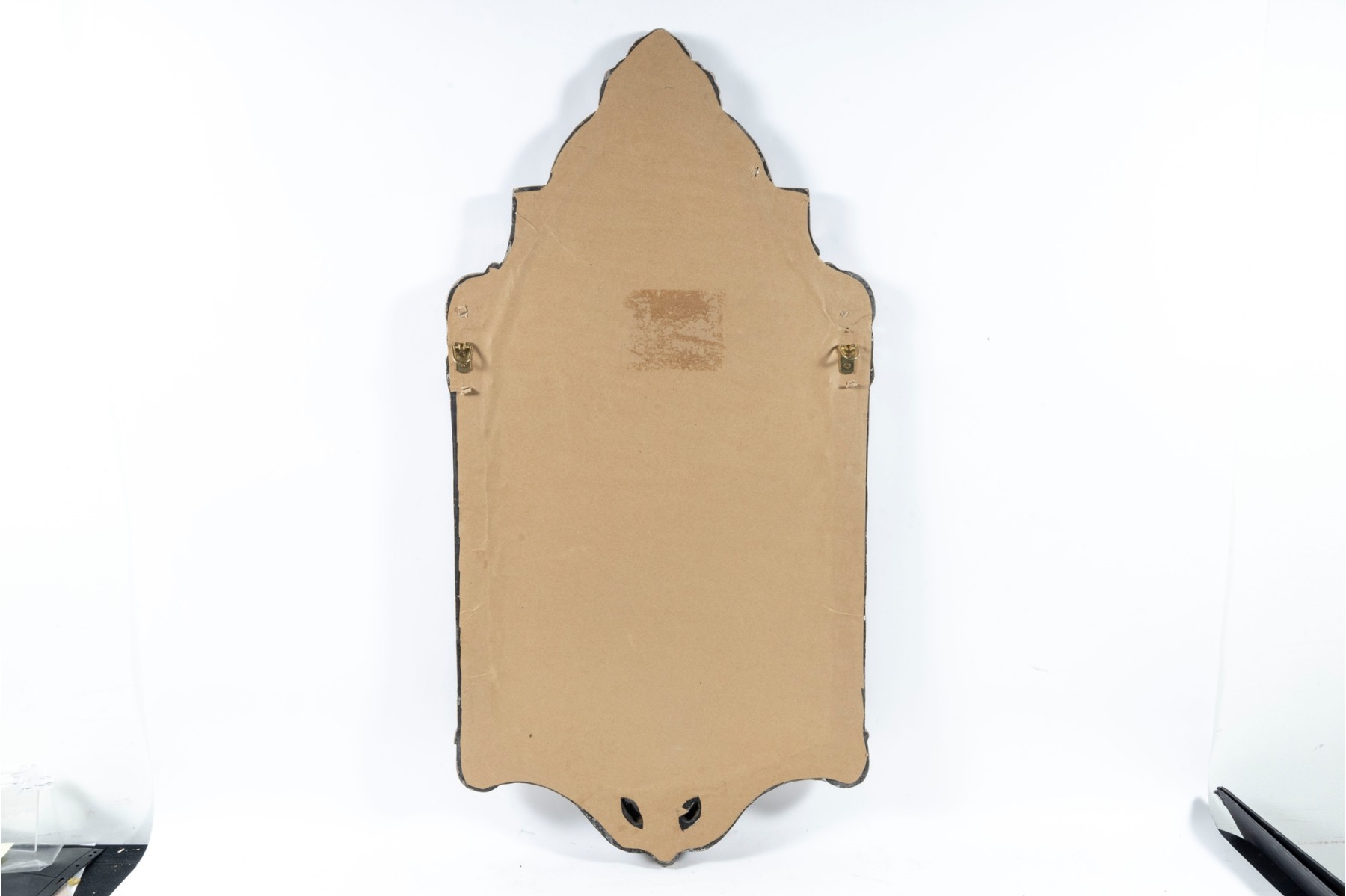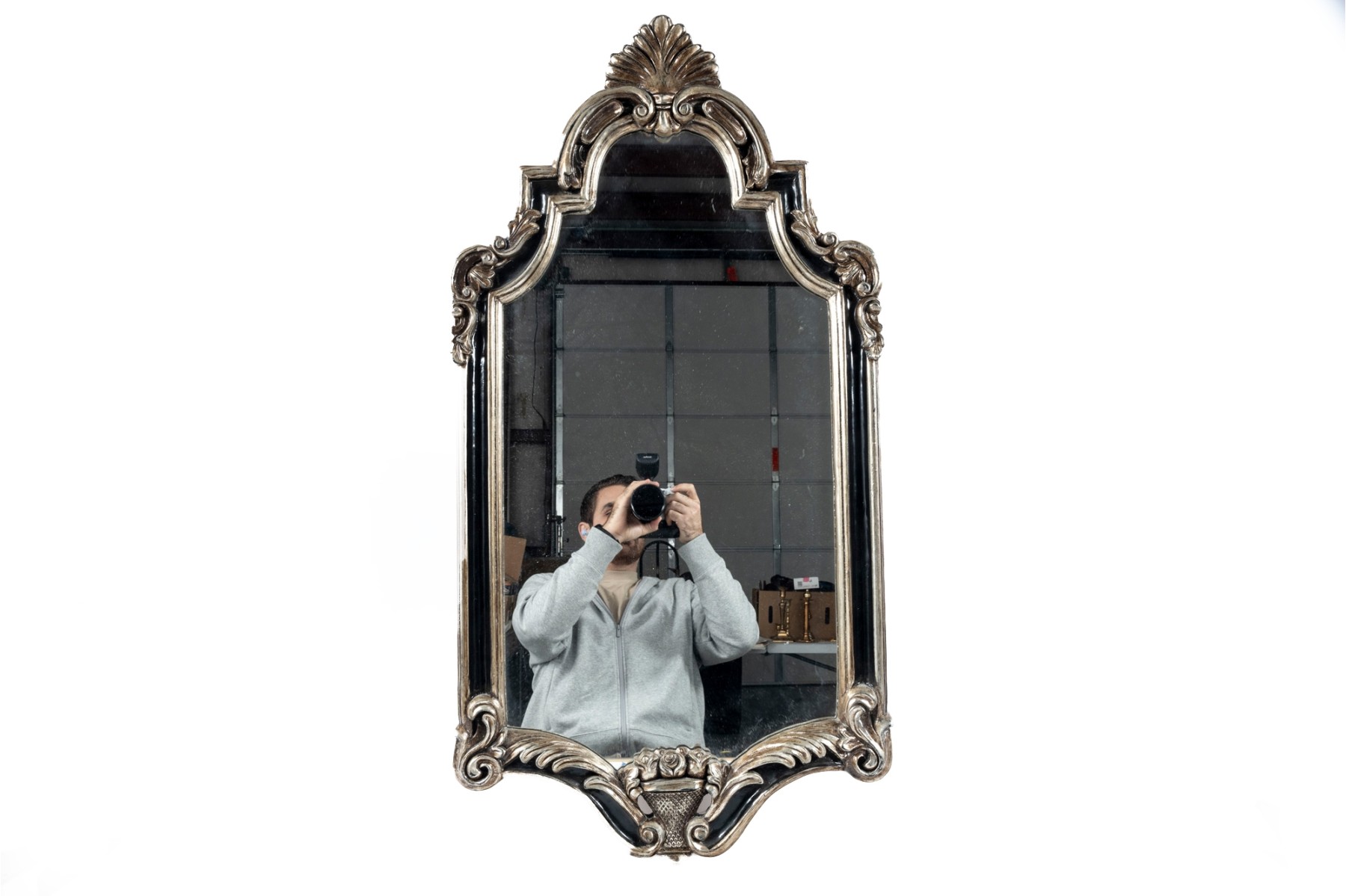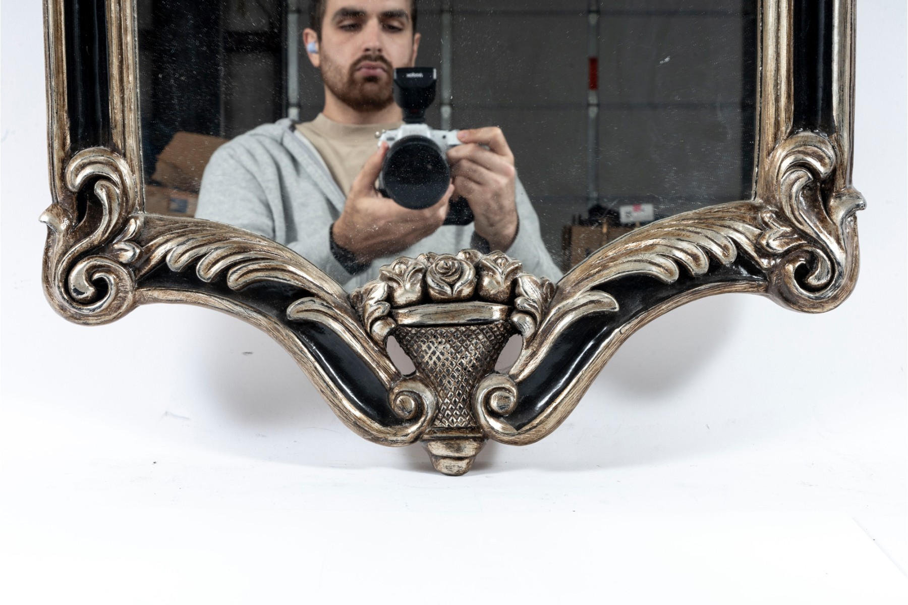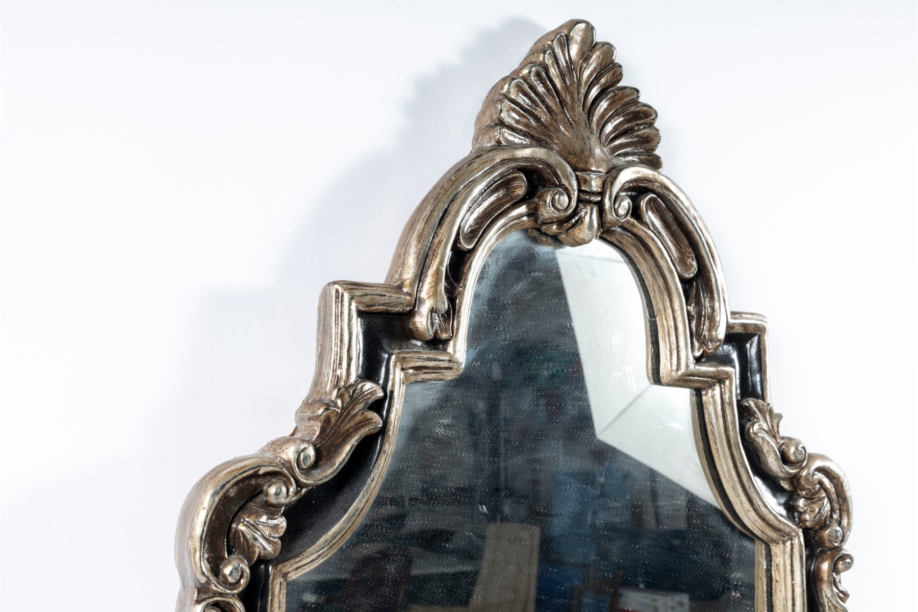 This Art Nouveau style wall mirror features a beautifully crafted silver and black painted wood frame, adorned with intricate foliate details throughout.