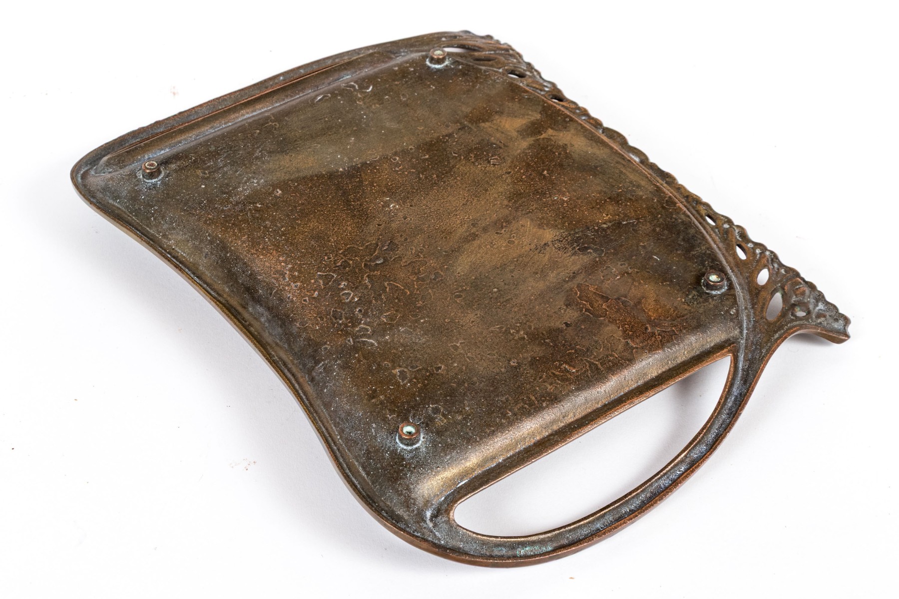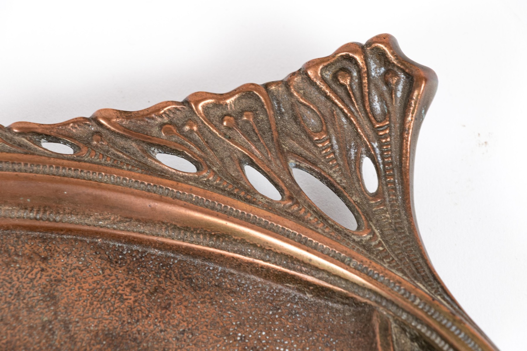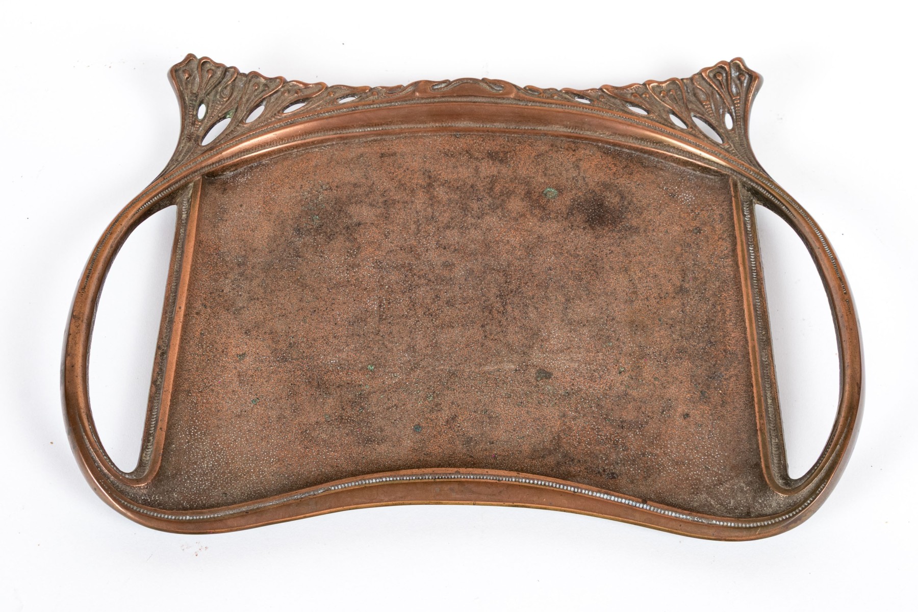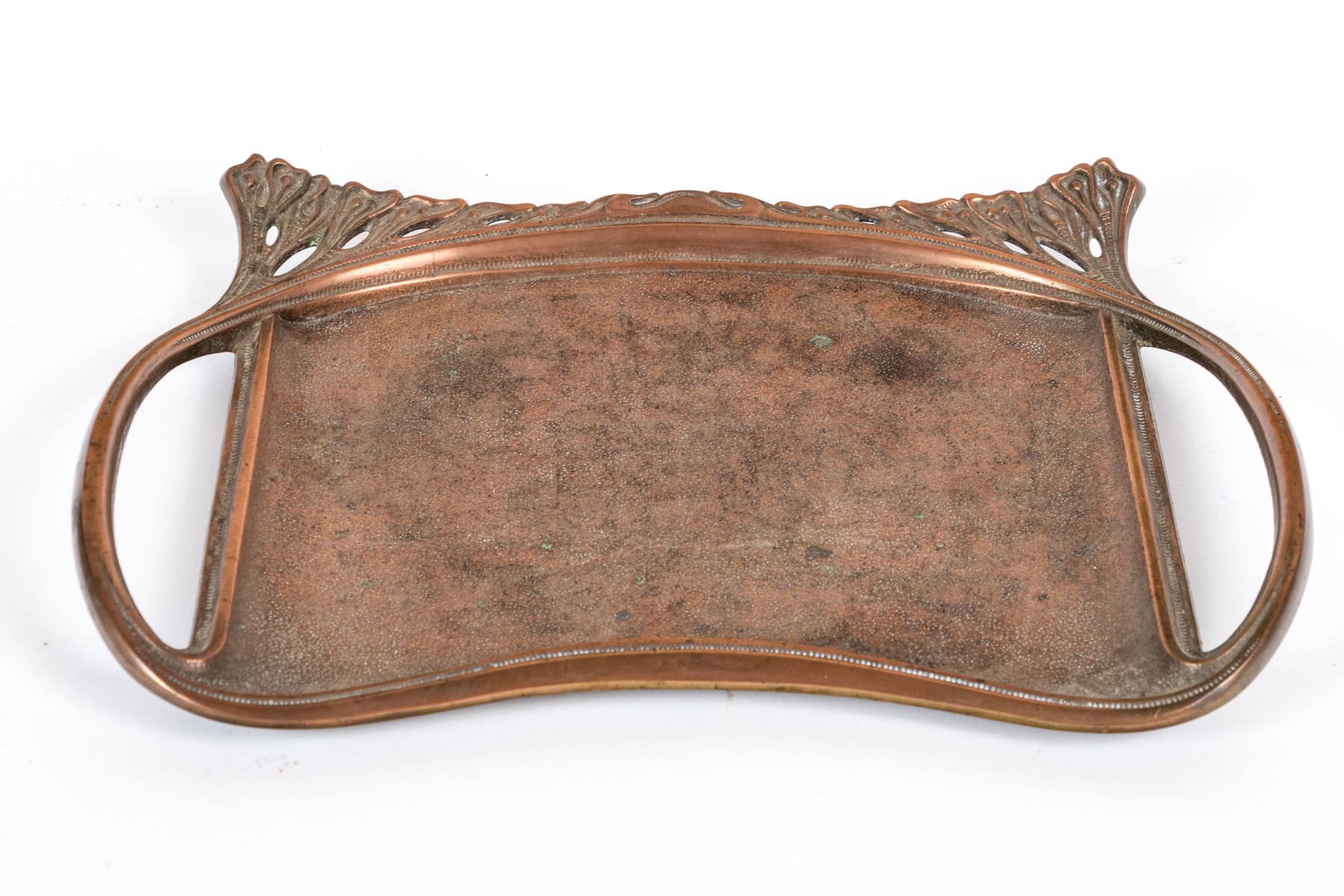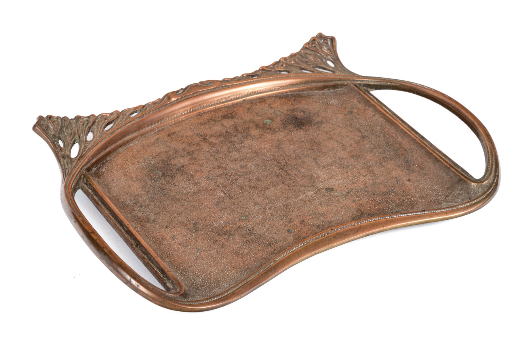 A gorgeous serving tray in a warm copper finish, elegantly designed with eye-catching Art Nouveau style sporting a gently curved rectangular form swooping into handles at the bottom that meet at the top with pierced foliate relief. Finished with a finely fluted trim around the edges. Marked 3037 underfoot.