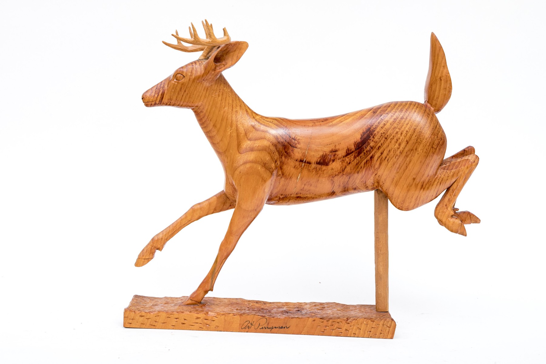 Dated Feb. 82 and signed underfoot. Carved wood base with stag leaping.