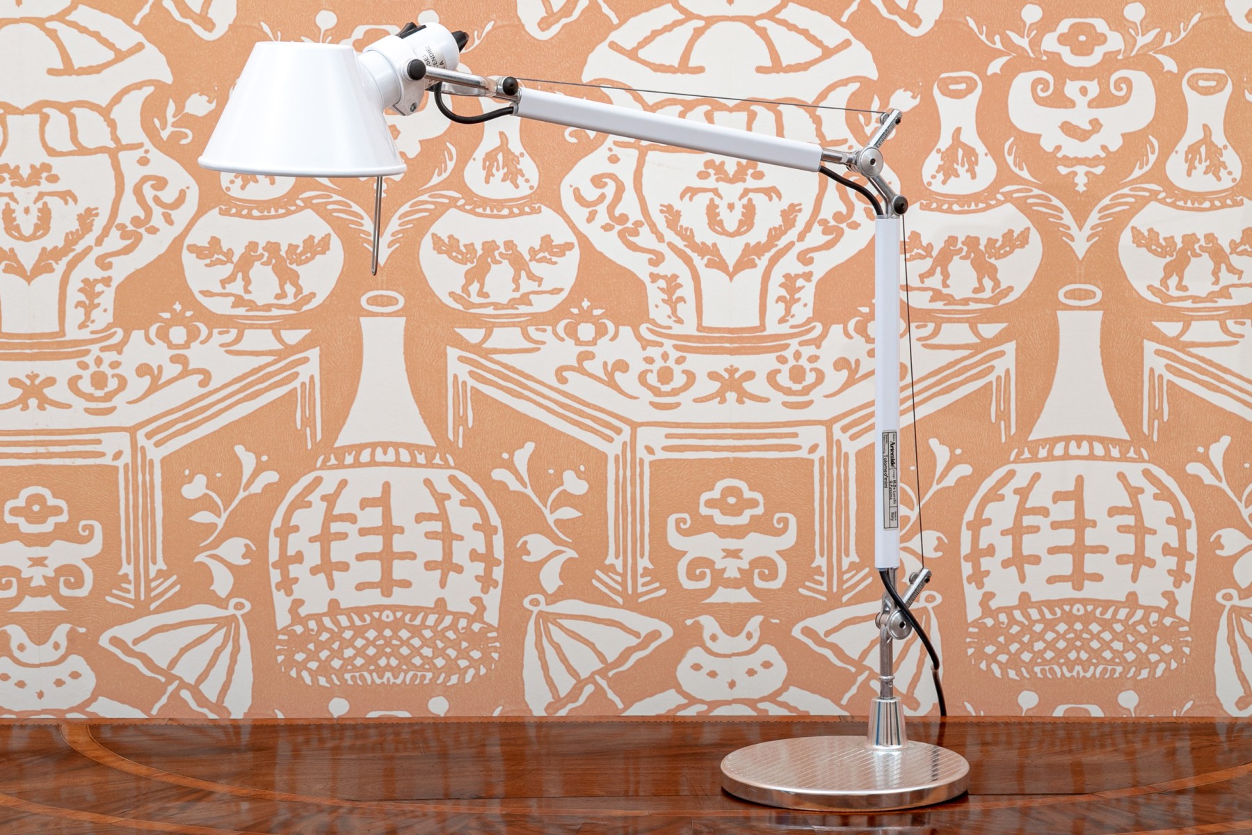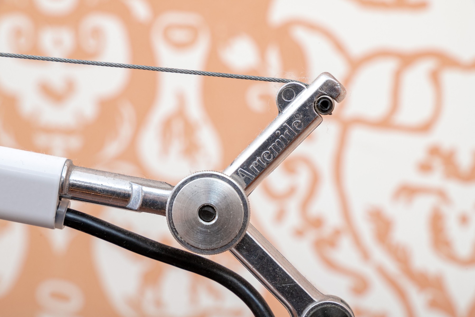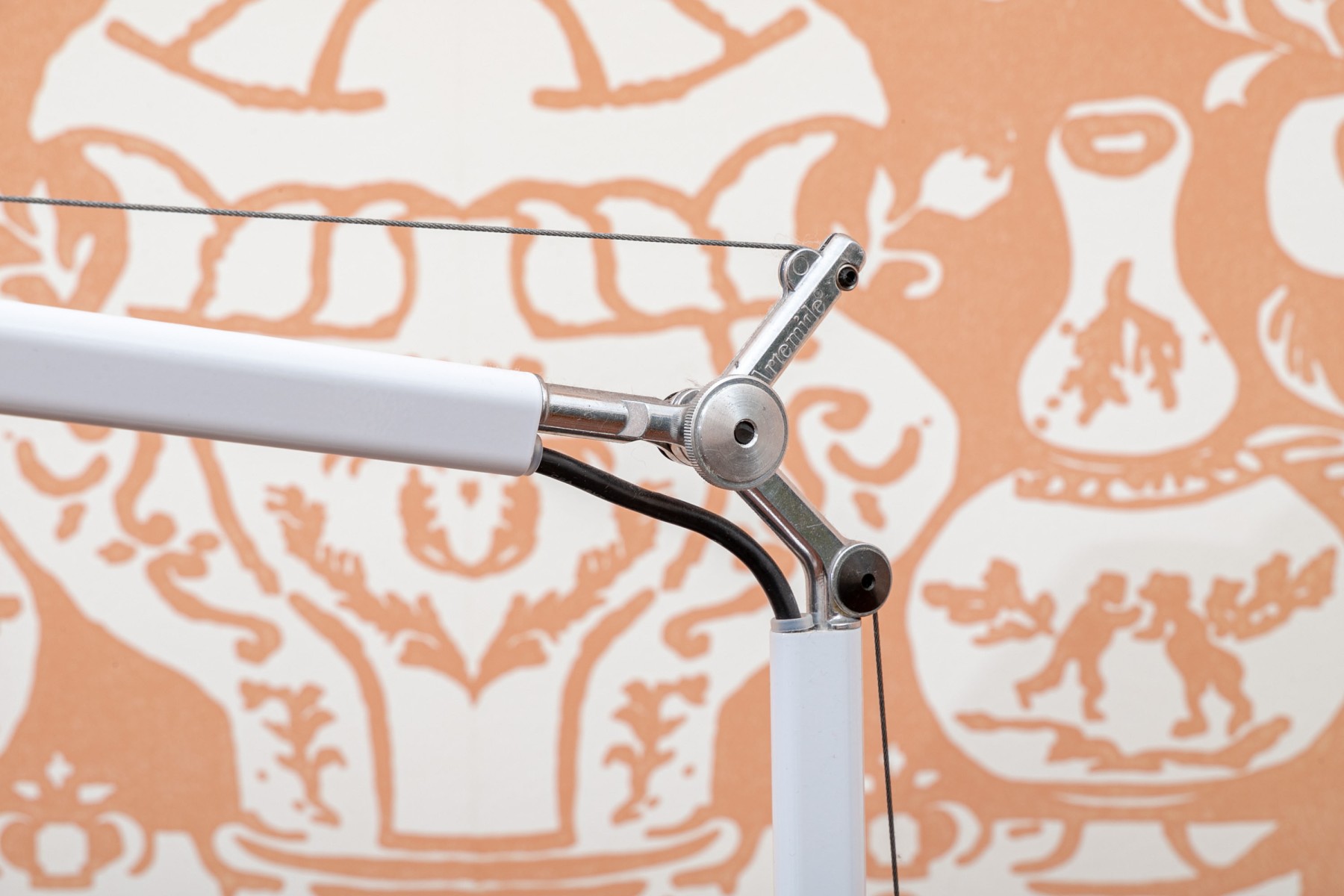 Designed by Michele de Lucchi and Giancarlo Fassina, Italy. The lamp with fully adjustable, articulated arm structure and tiltable and rotatable diffuser, steel metal cable suspension, round fluted base. Fluted tightening screw holds the lamp in folded position.
