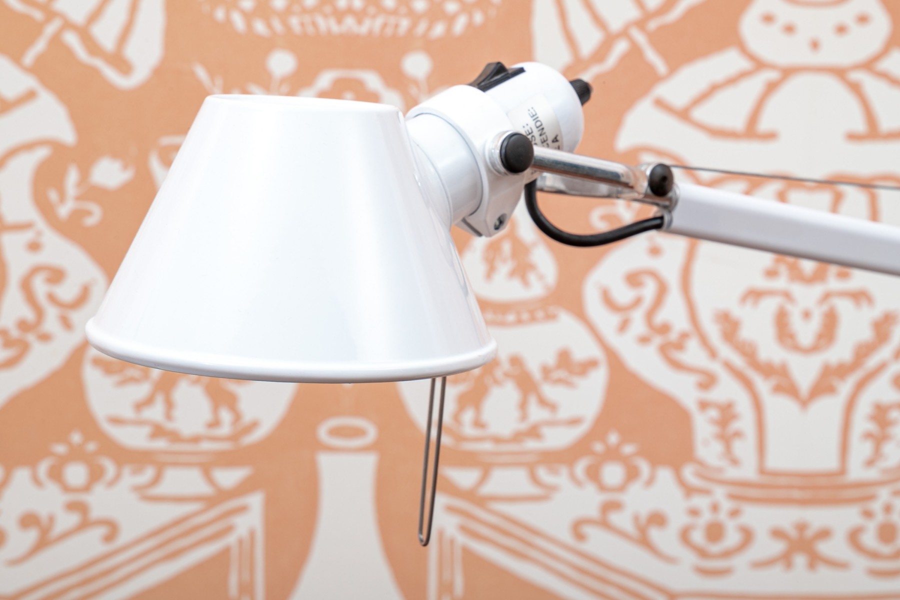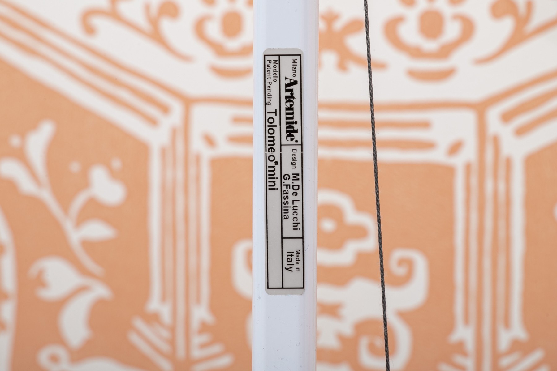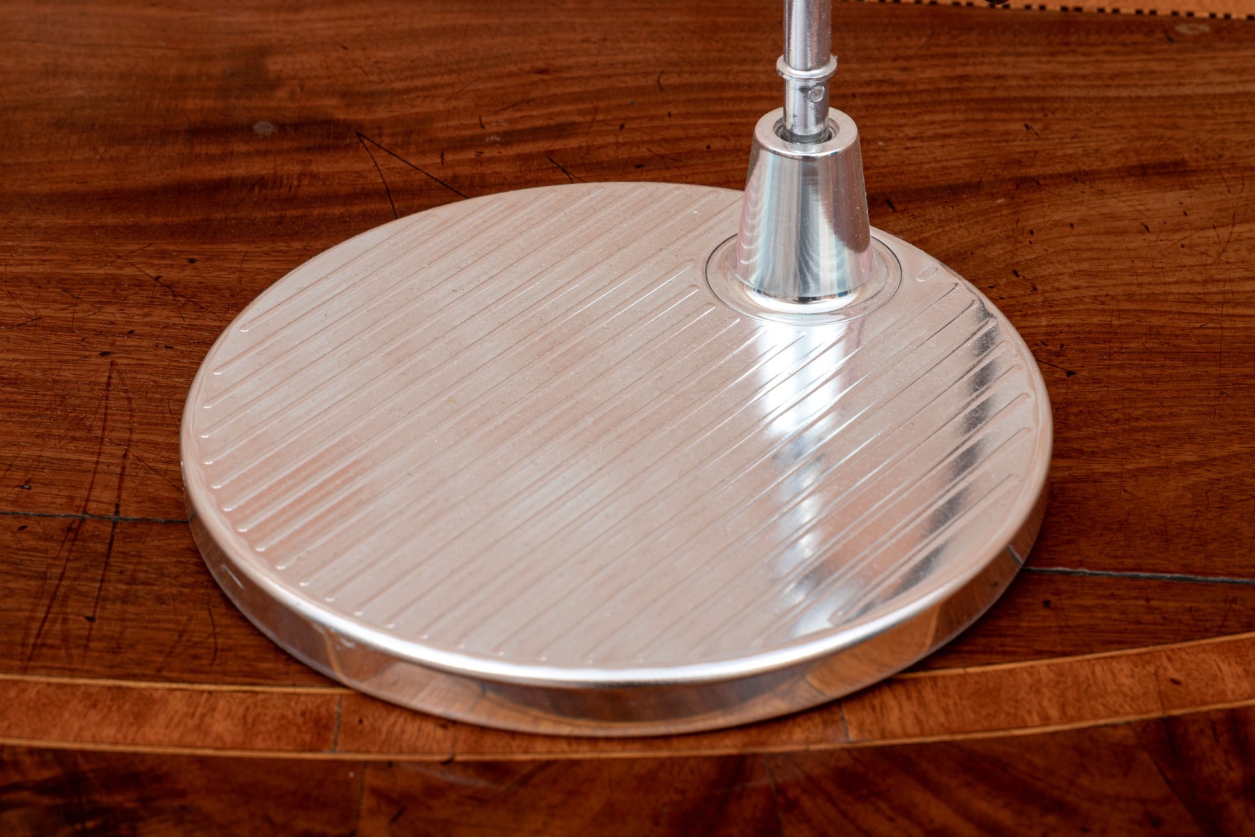 Designed by Michele de Lucchi and Giancarlo Fassina, Italy. The lamp with fully adjustable, articulated arm structure and tiltable and rotatable diffuser, steel metal cable suspension, round fluted base. Fluted tightening screw holds the lamp in folded position.
