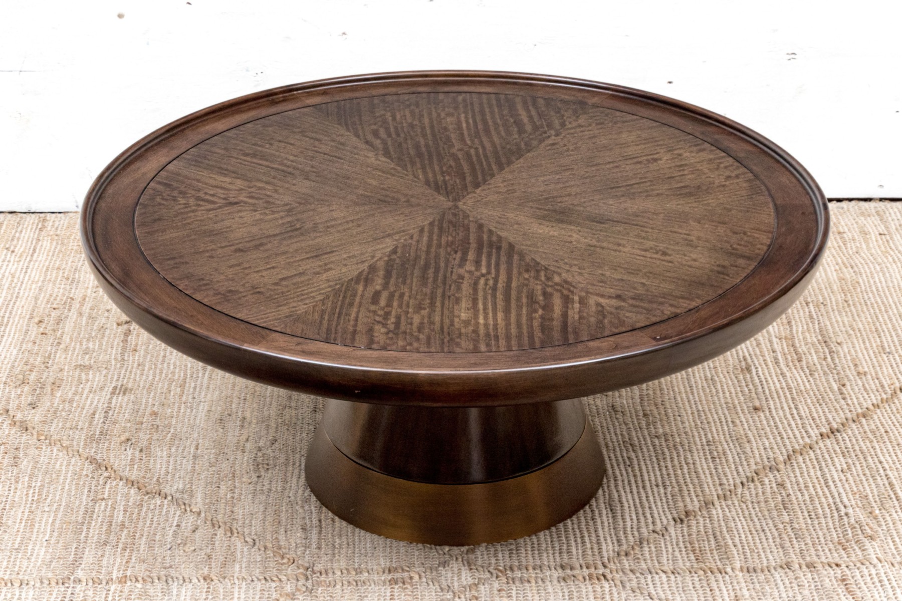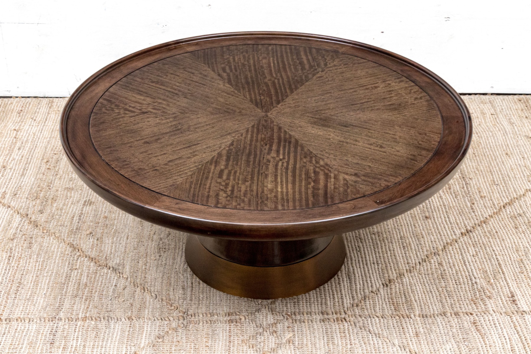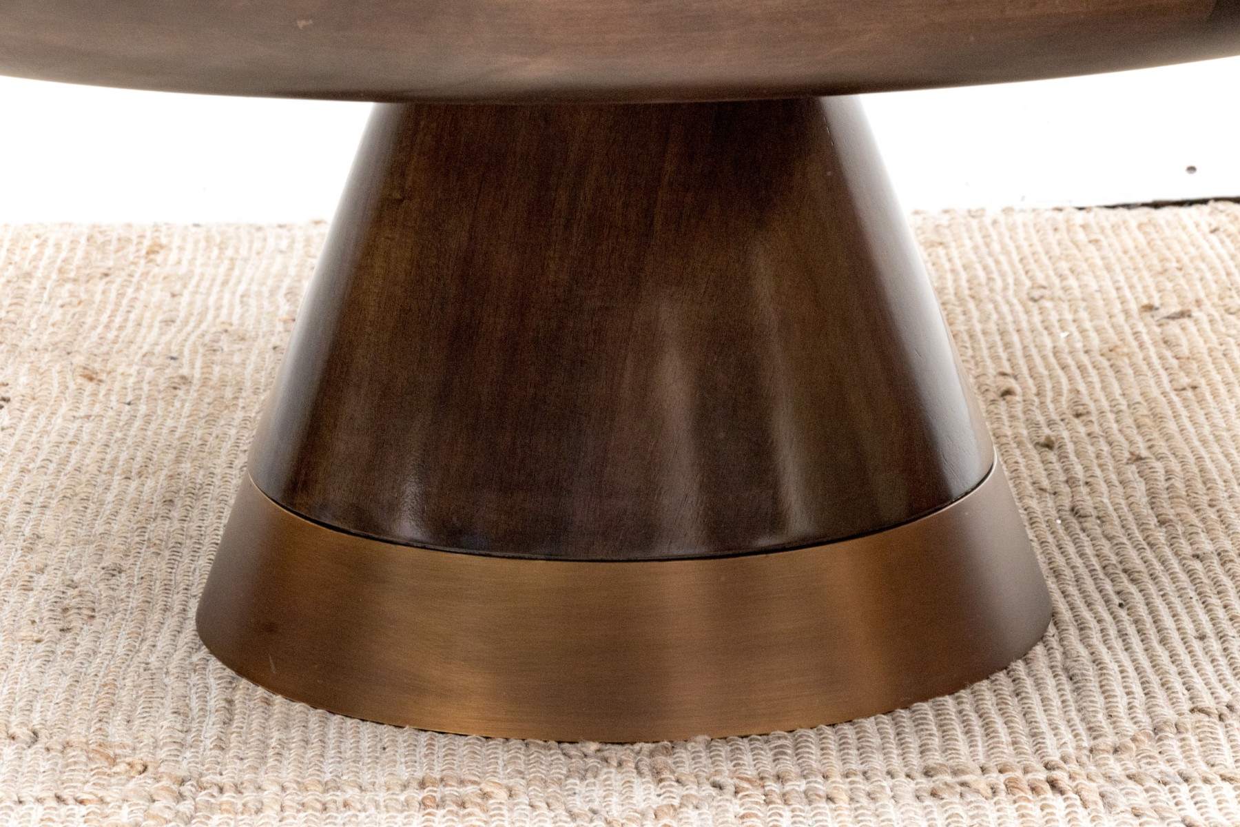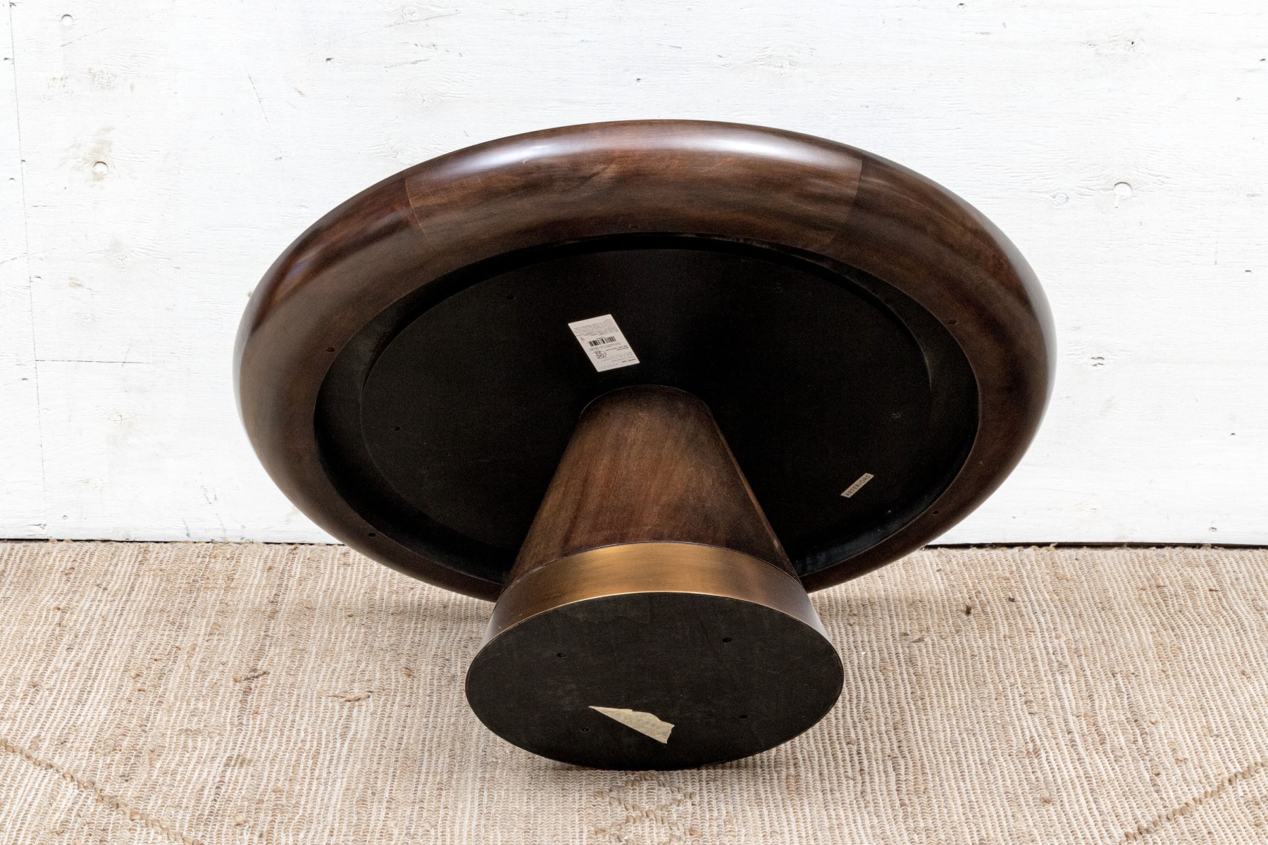 Noted for its "rich brindle finish graces the eucalyptus veneers", the geometric table has a lipped, circular table top which rests upon the tapered, conical base with brass ring to the base of pedestal.