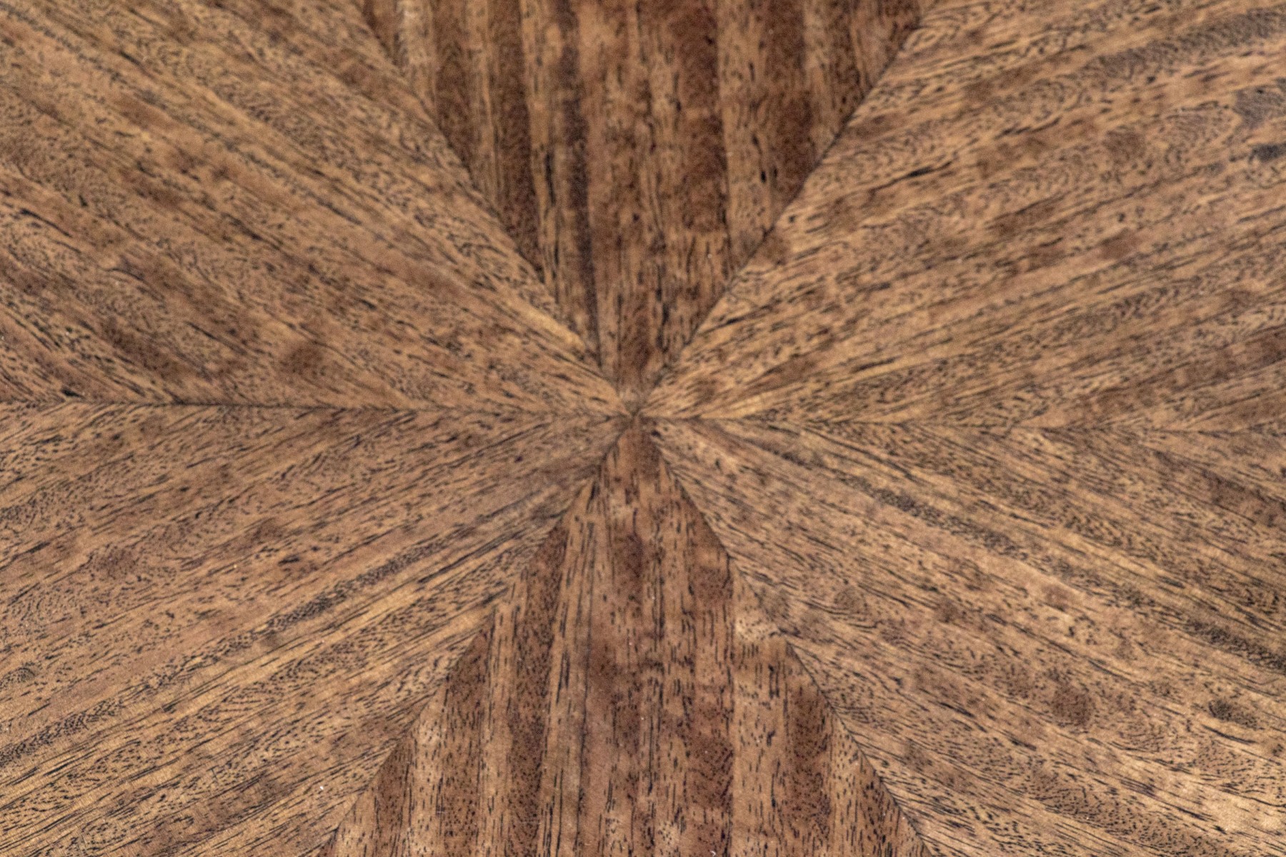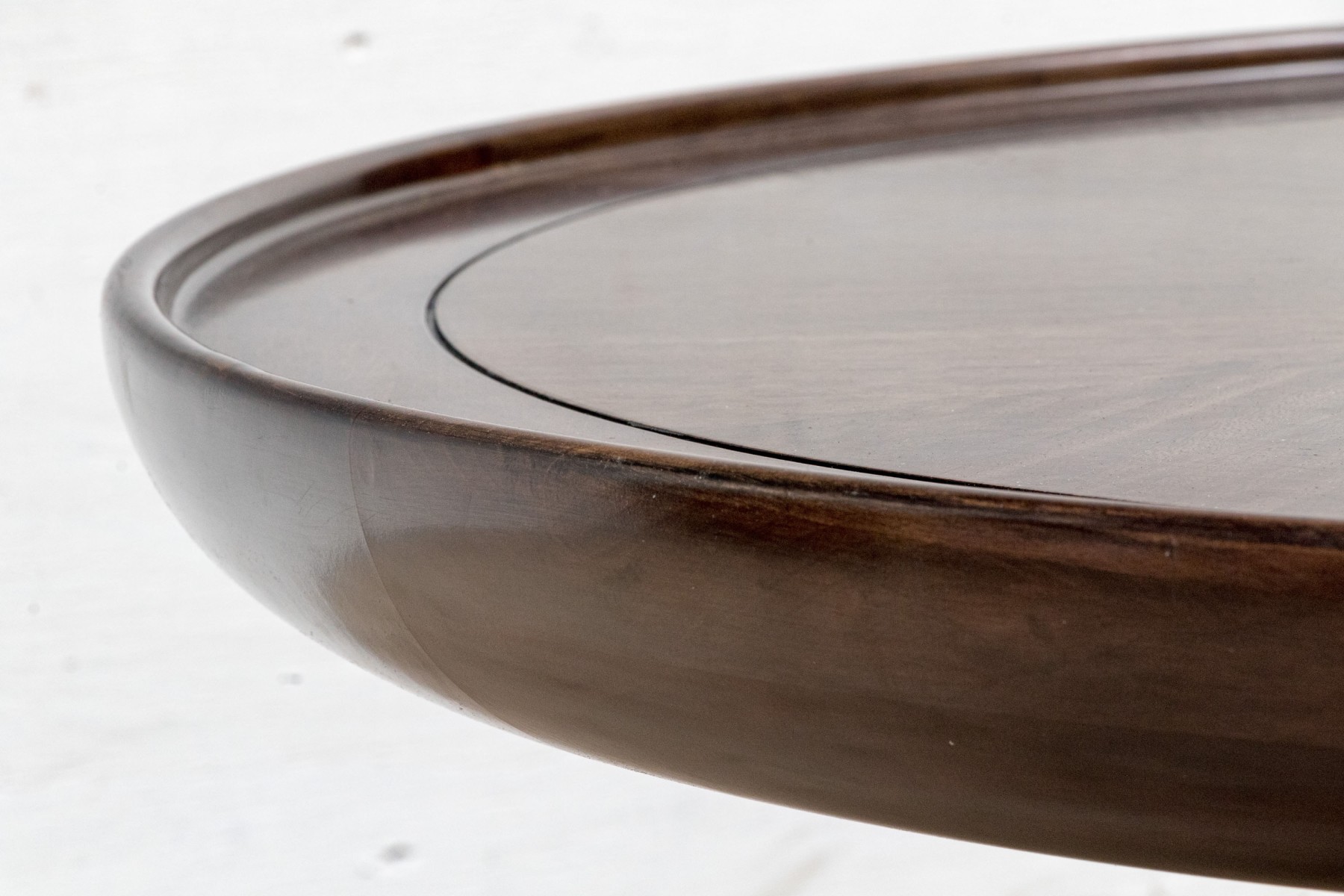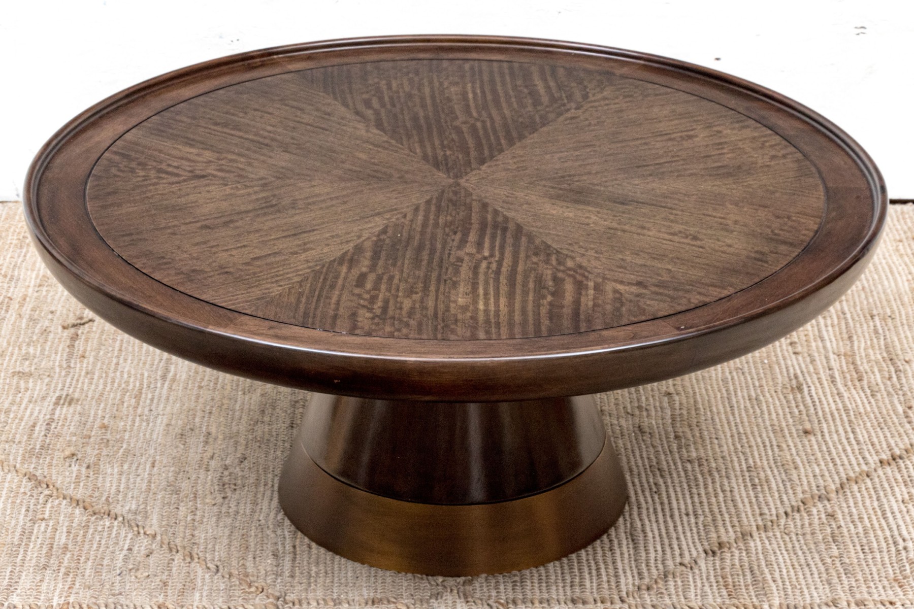 Noted for its "rich brindle finish graces the eucalyptus veneers", the geometric table has a lipped, circular table top which rests upon the tapered, conical base with brass ring to the base of pedestal.