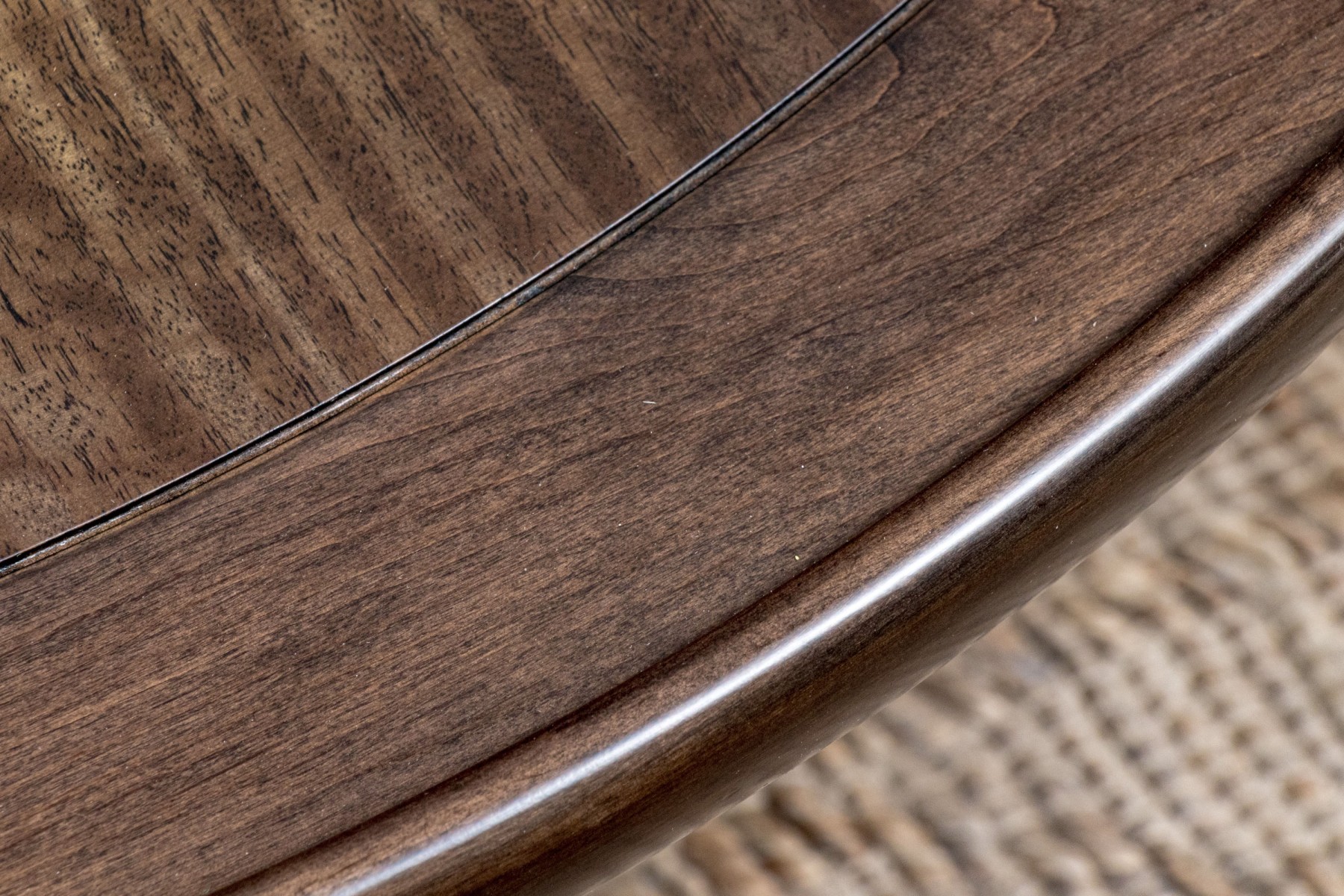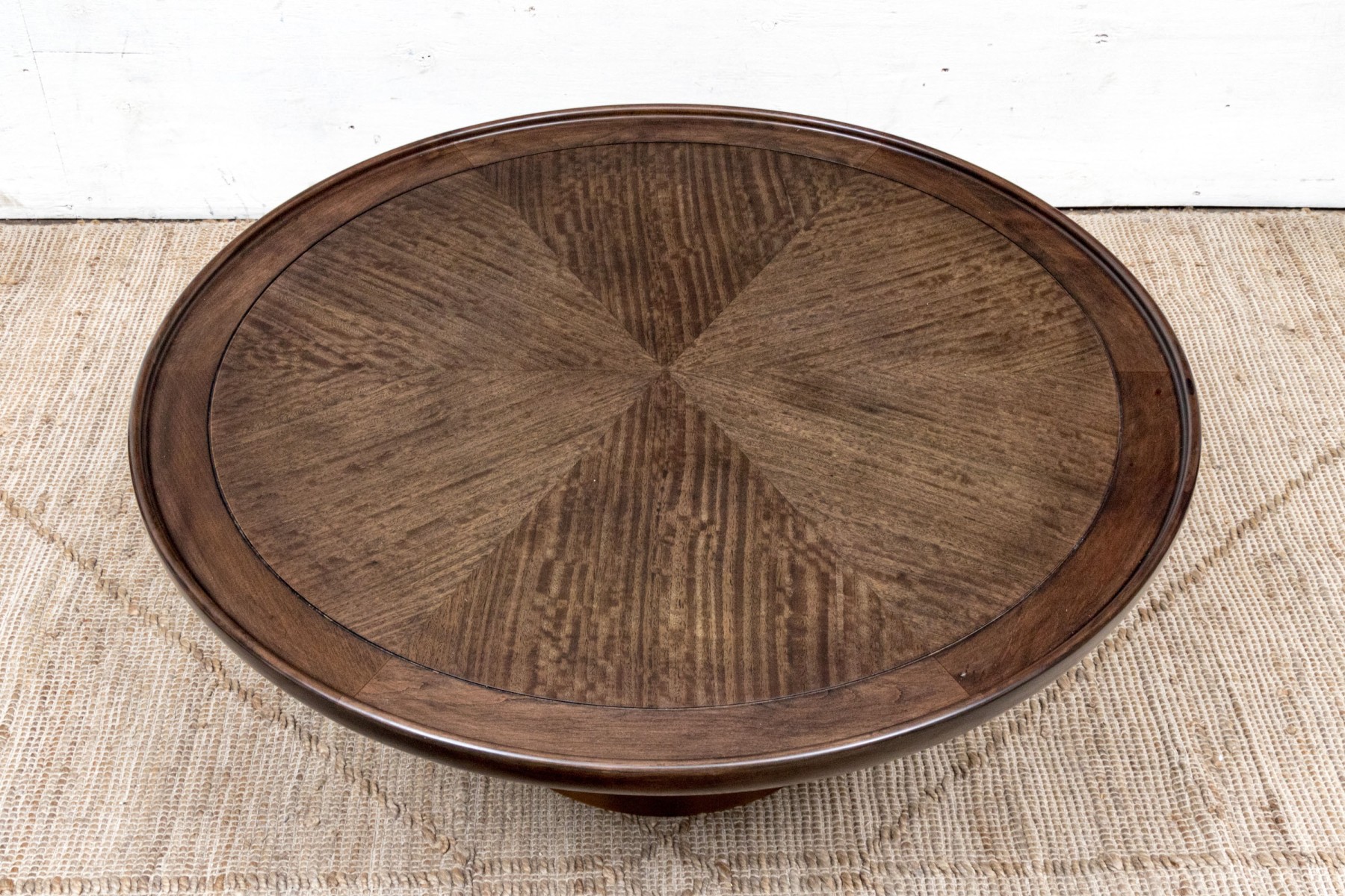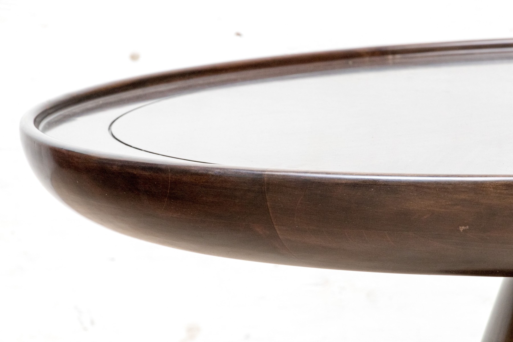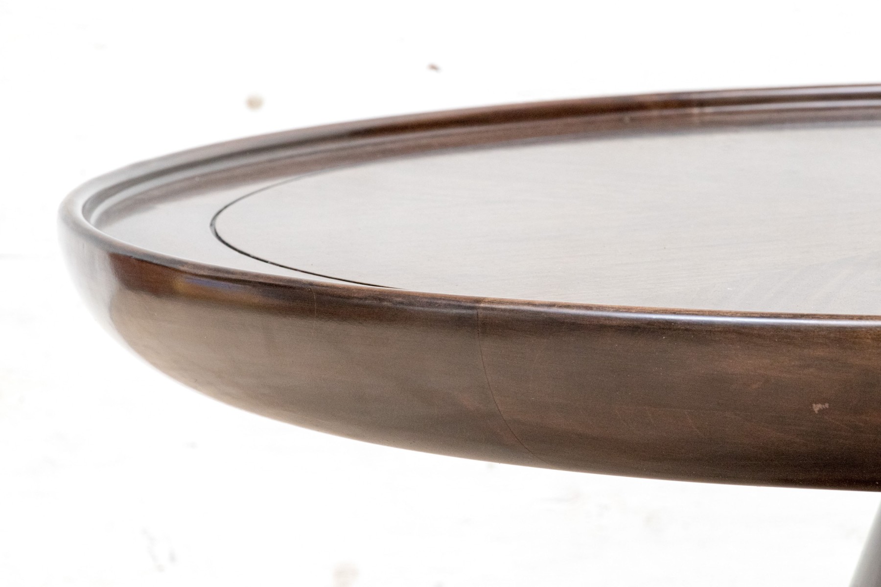 Noted for its "rich brindle finish graces the eucalyptus veneers", the geometric table has a lipped, circular table top which rests upon the tapered, conical base with brass ring to the base of pedestal.