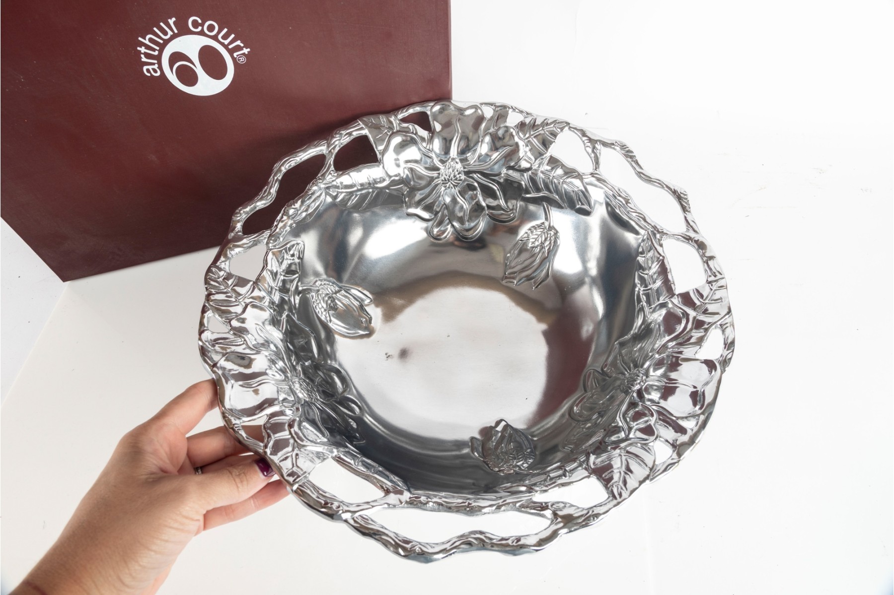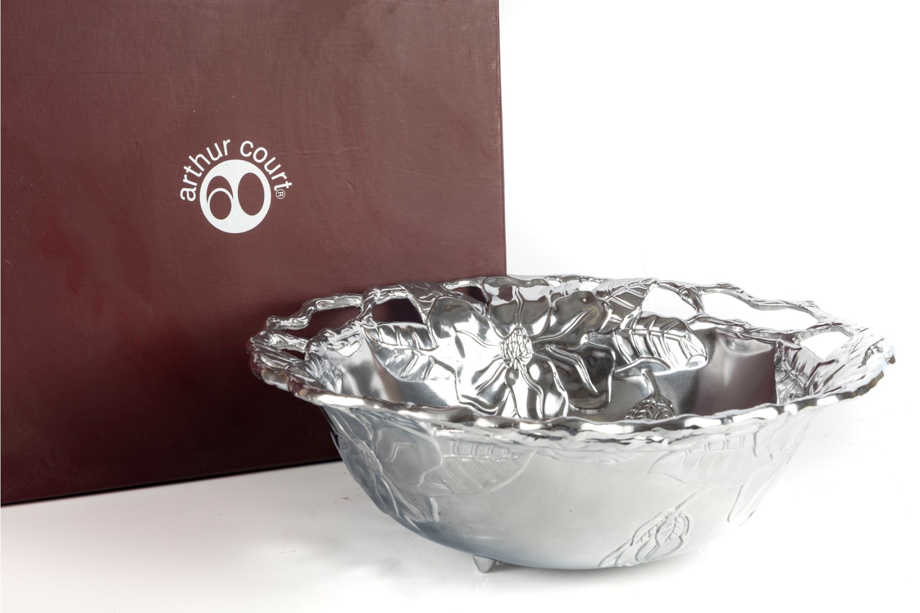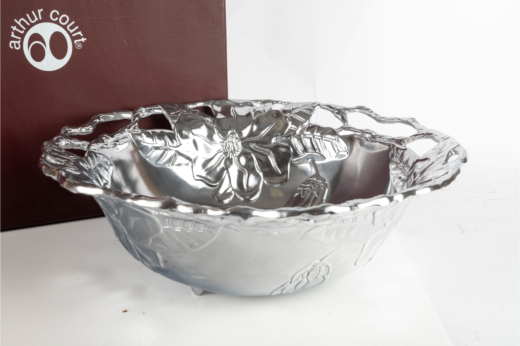Polished aluminum Arthur Court “Magnolia” bowl featuring a detailed floral design with openwork rim. Comes with original box.