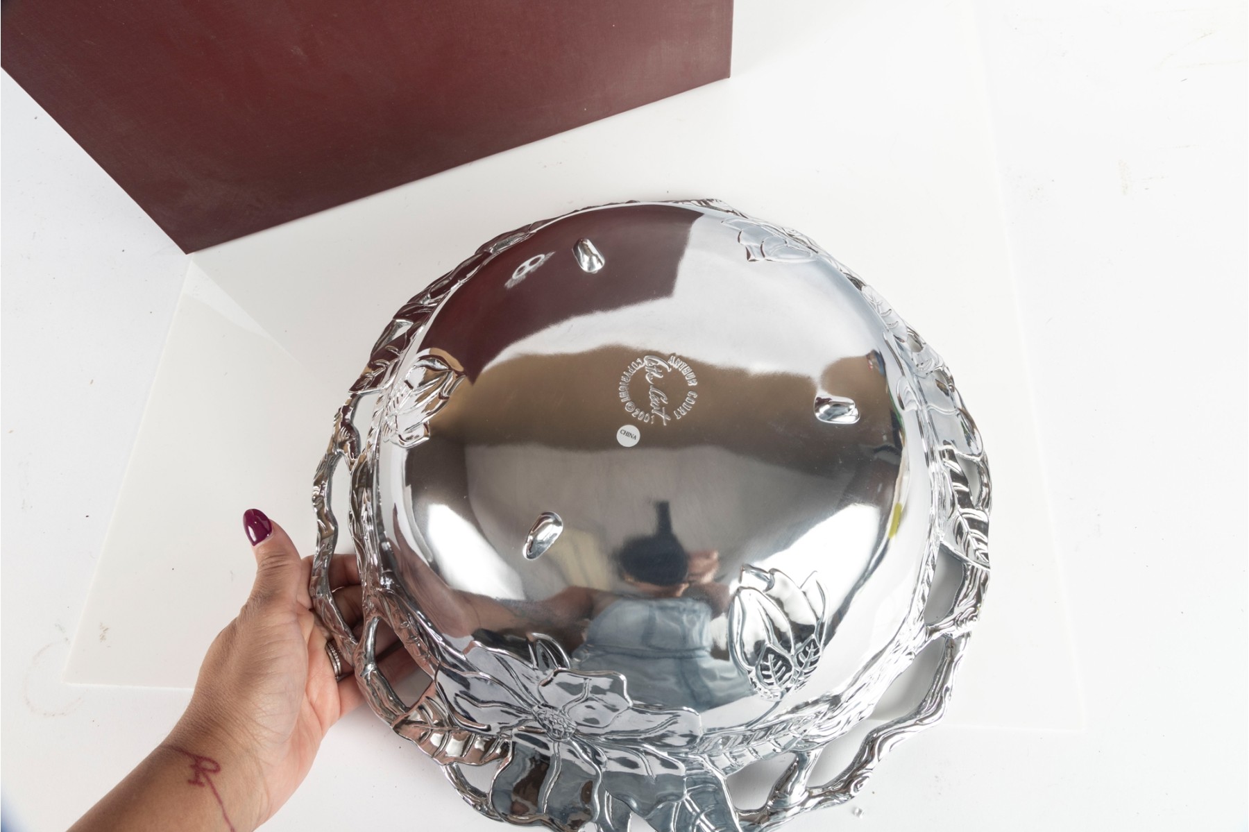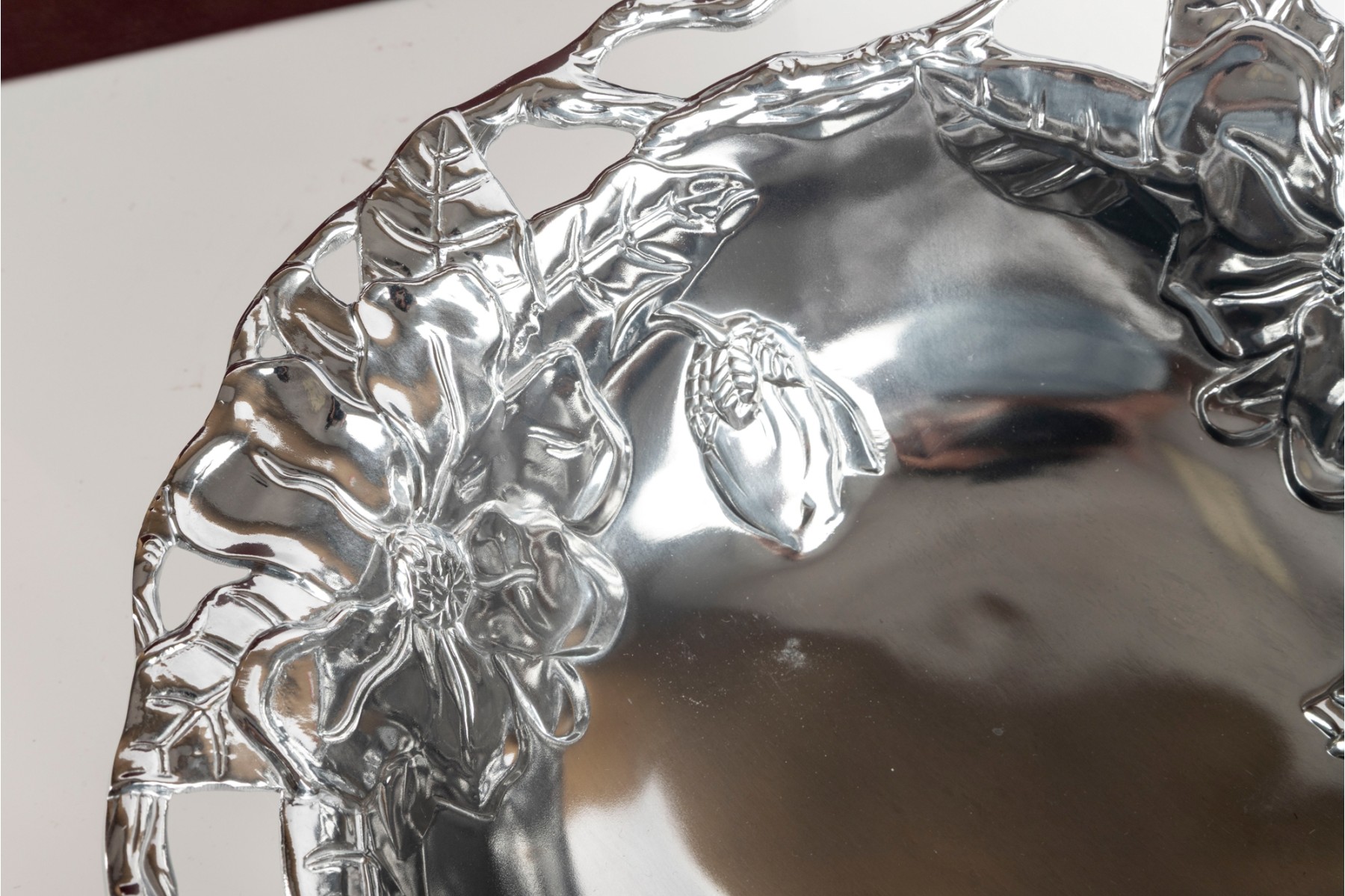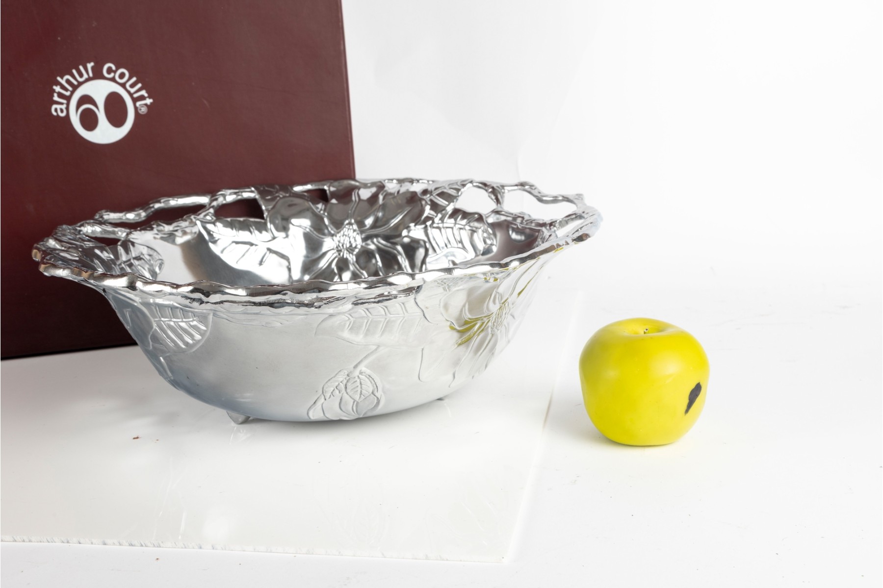 Polished aluminum Arthur Court “Magnolia” bowl featuring a detailed floral design with openwork rim. Comes with original box.