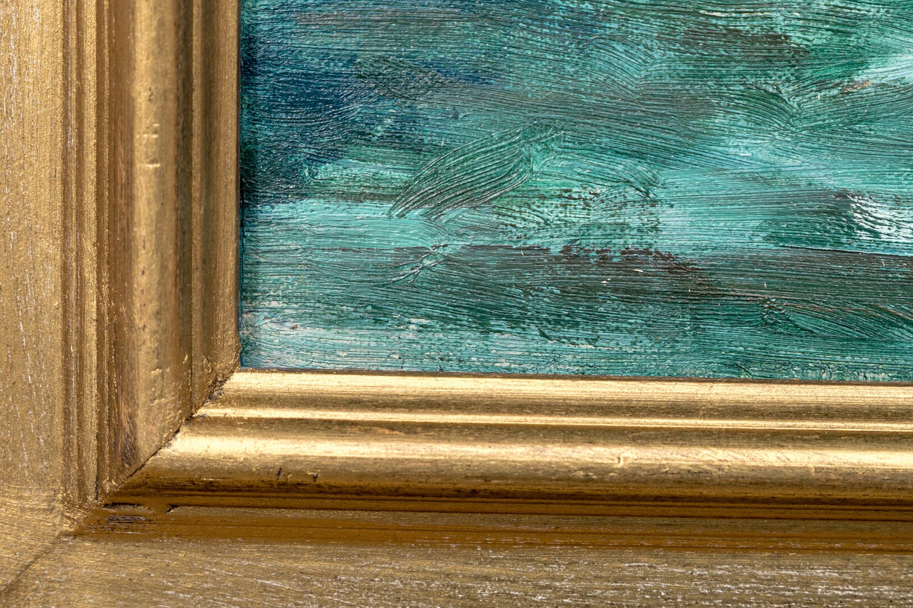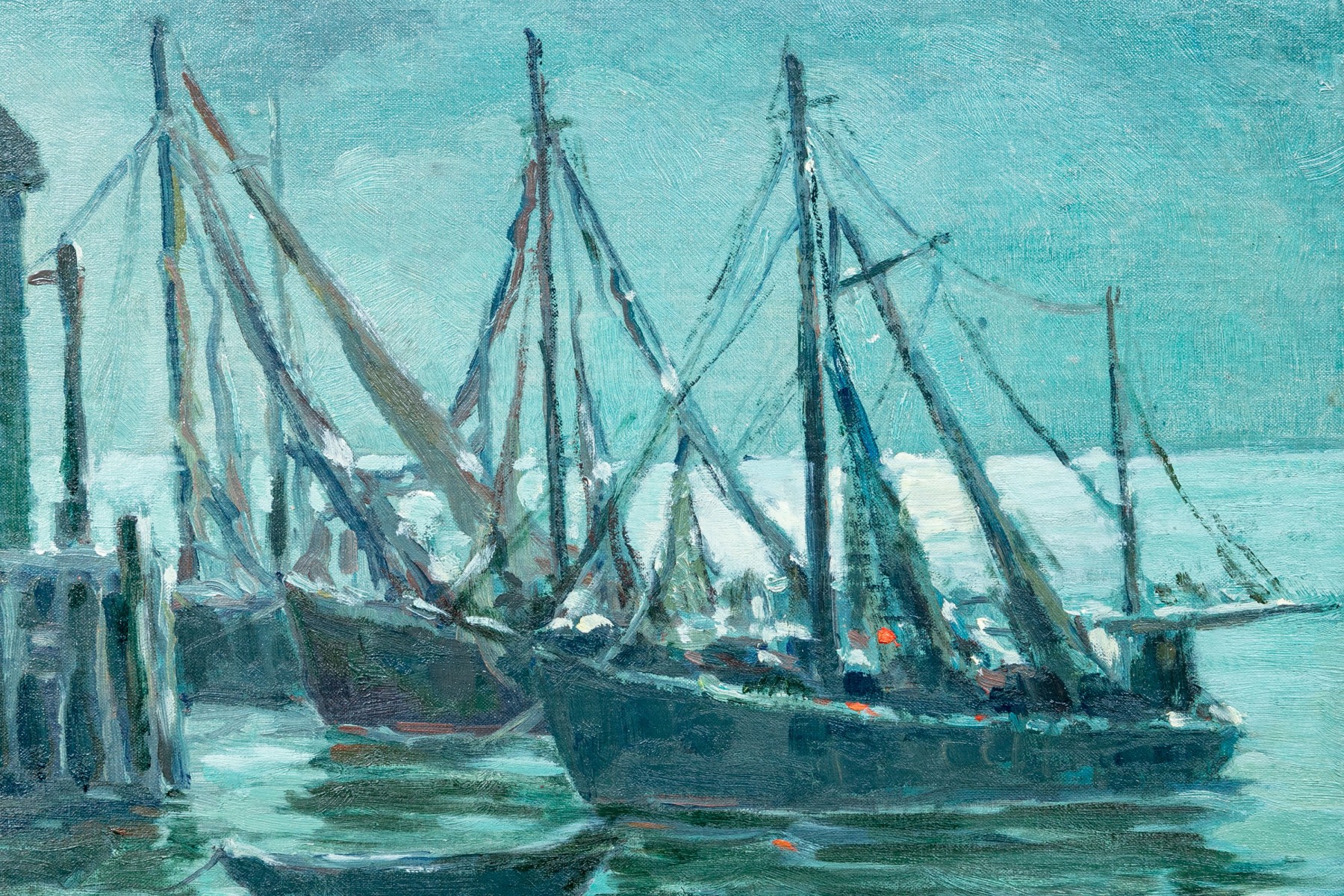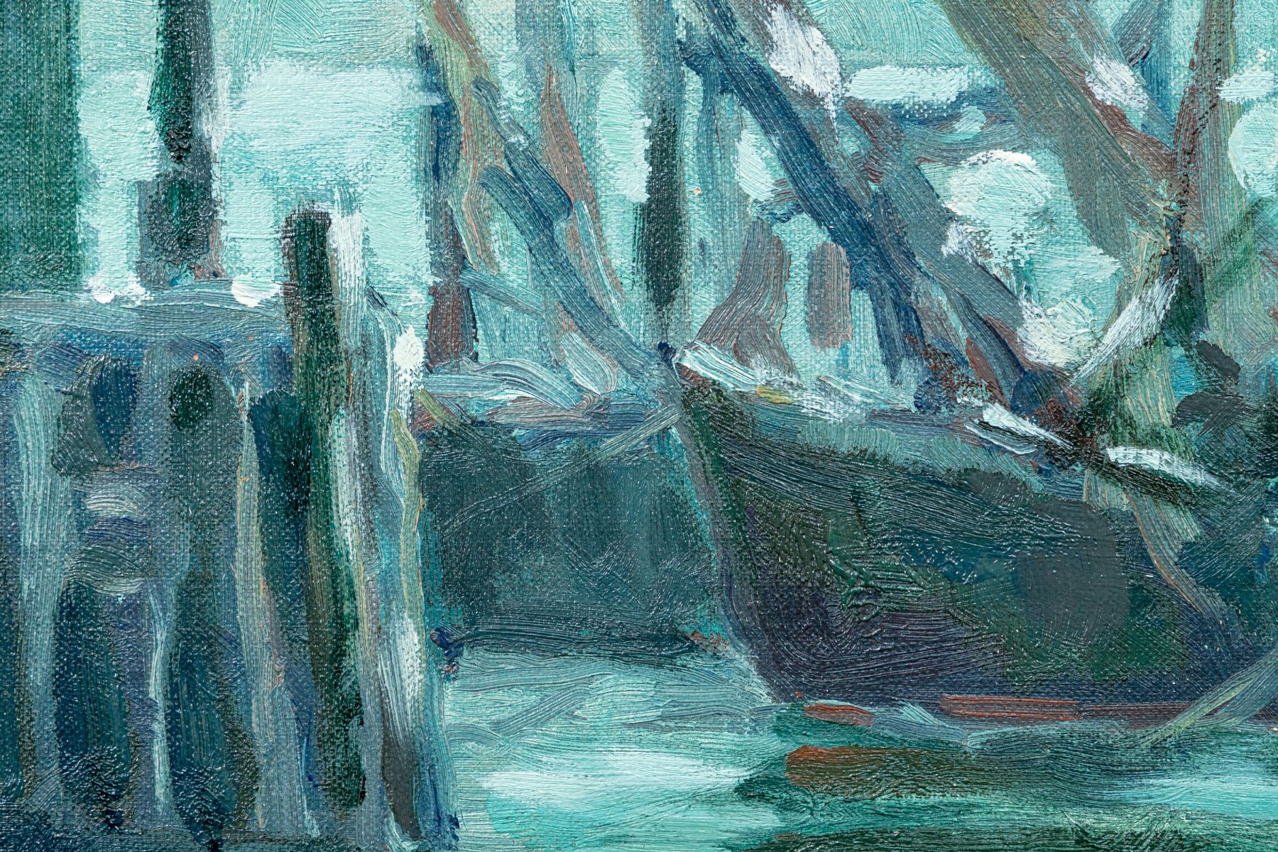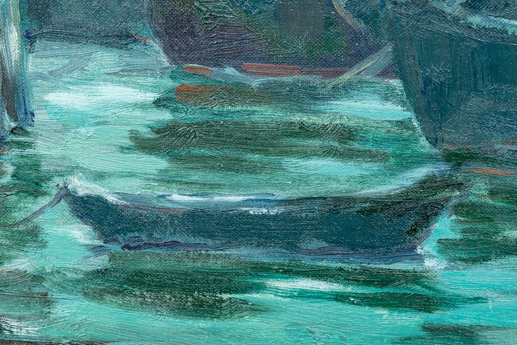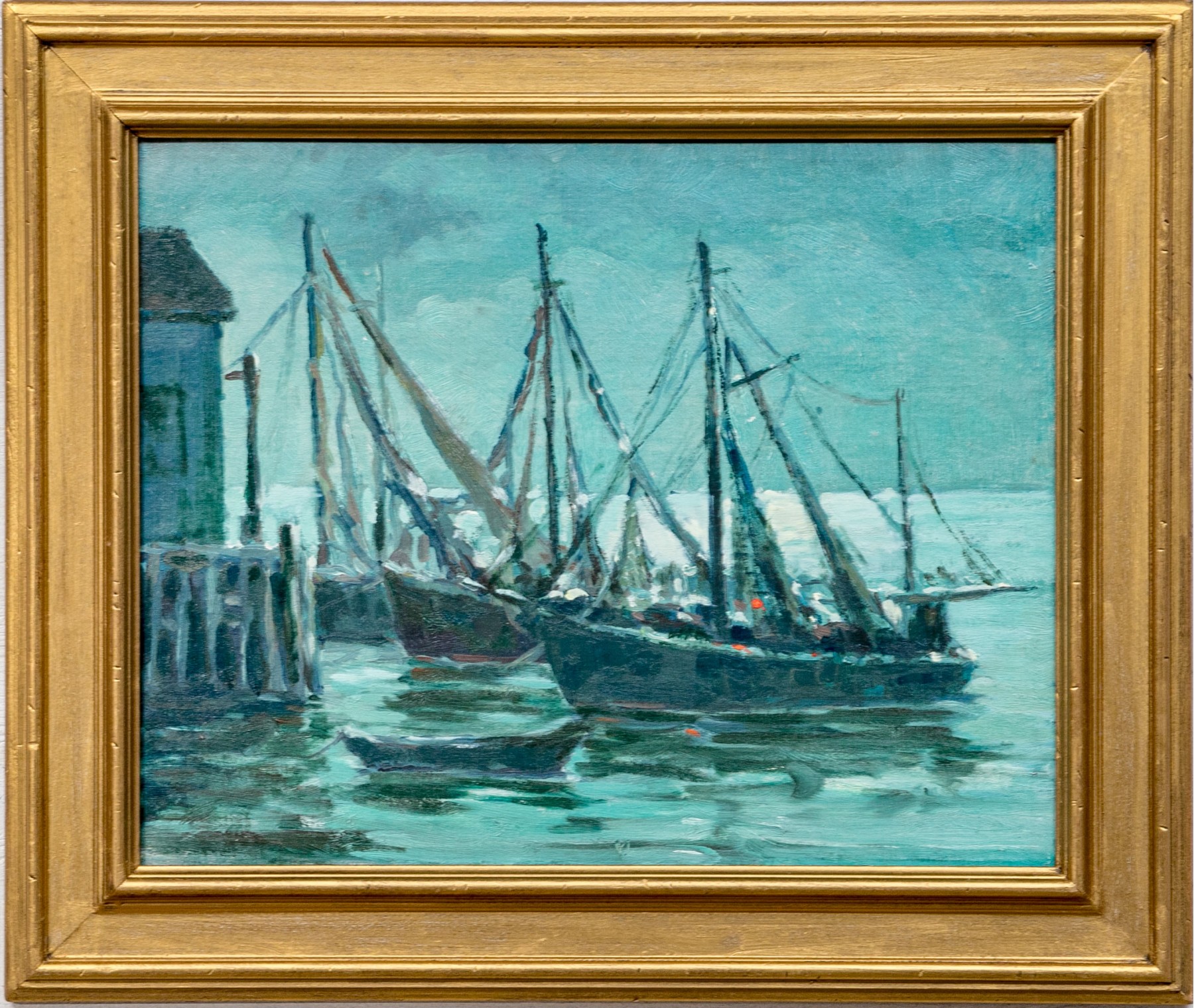 Unsigned, label on verso- from the estate of the artist. A green-blue canvas with fishing boats at dock at dusk. A few red night lights are reflected in the water. Presented in a gilt frame.