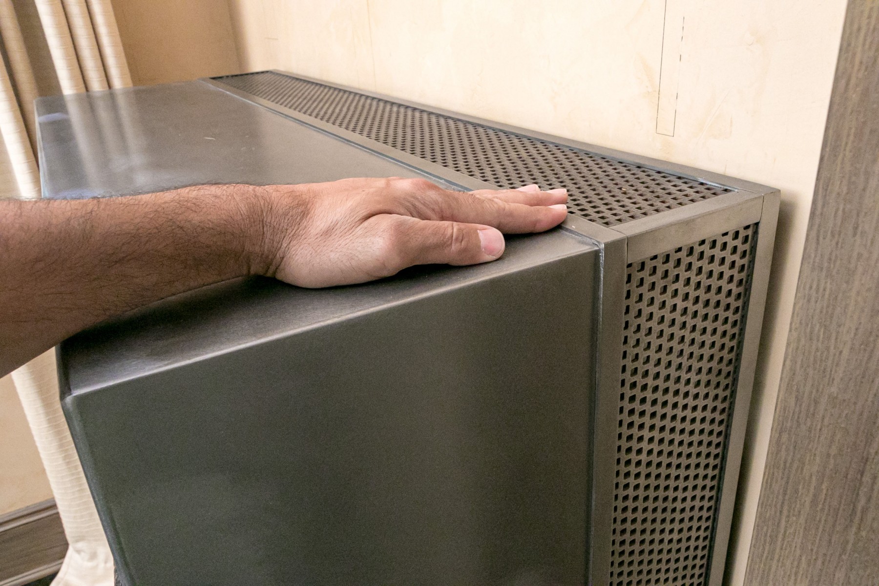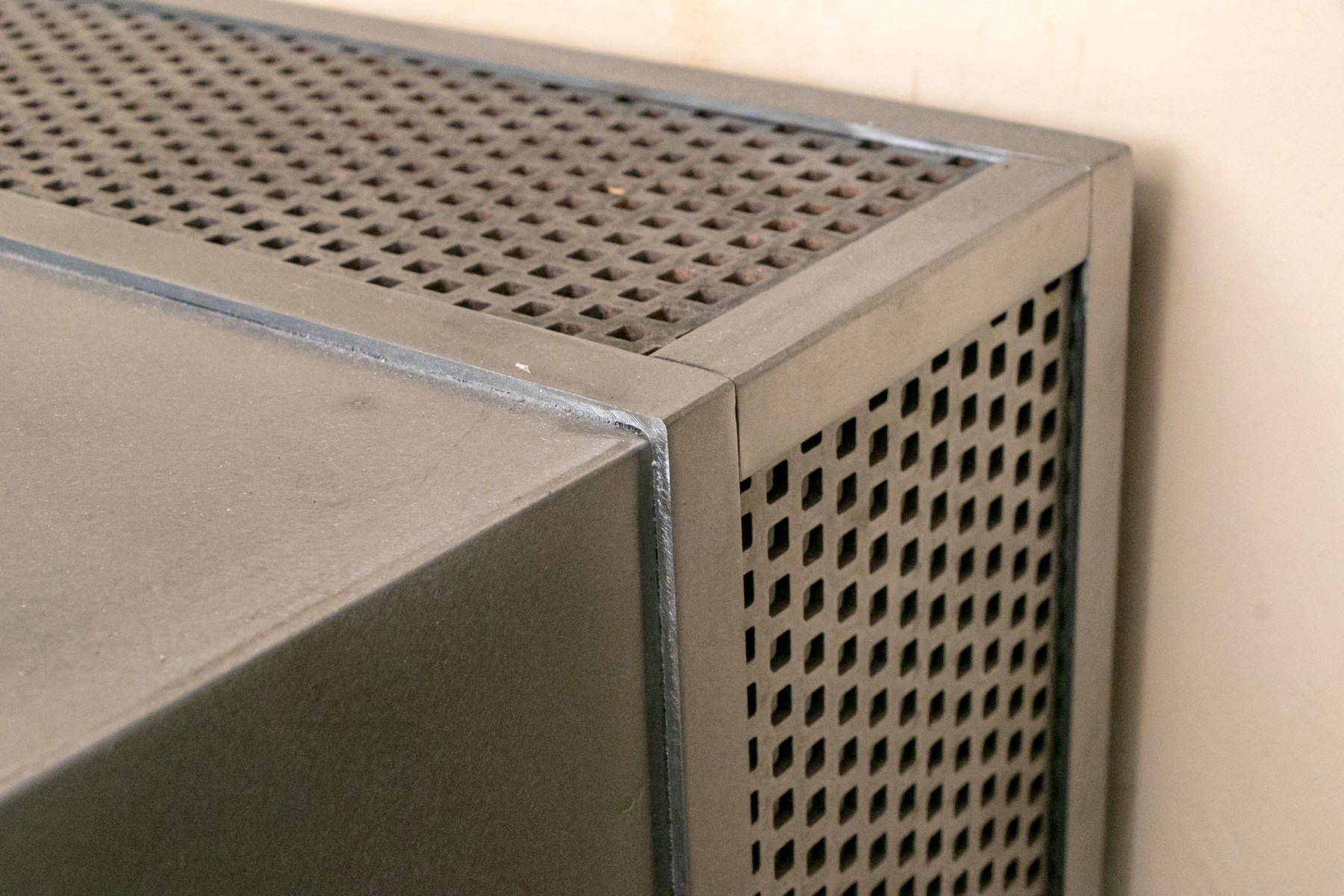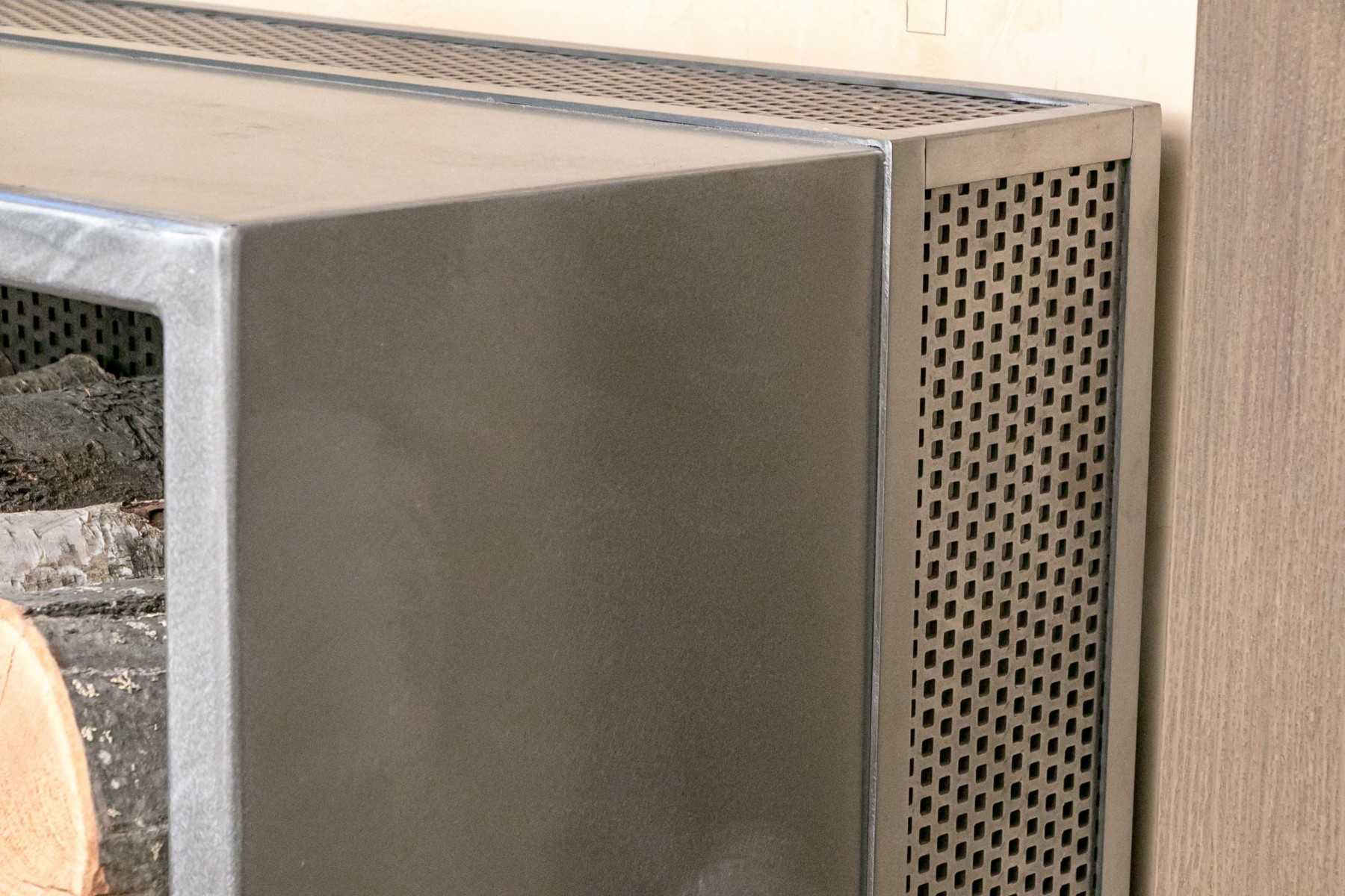 Impressive custom made, heavy thick gauge steel firewood storage garniture.