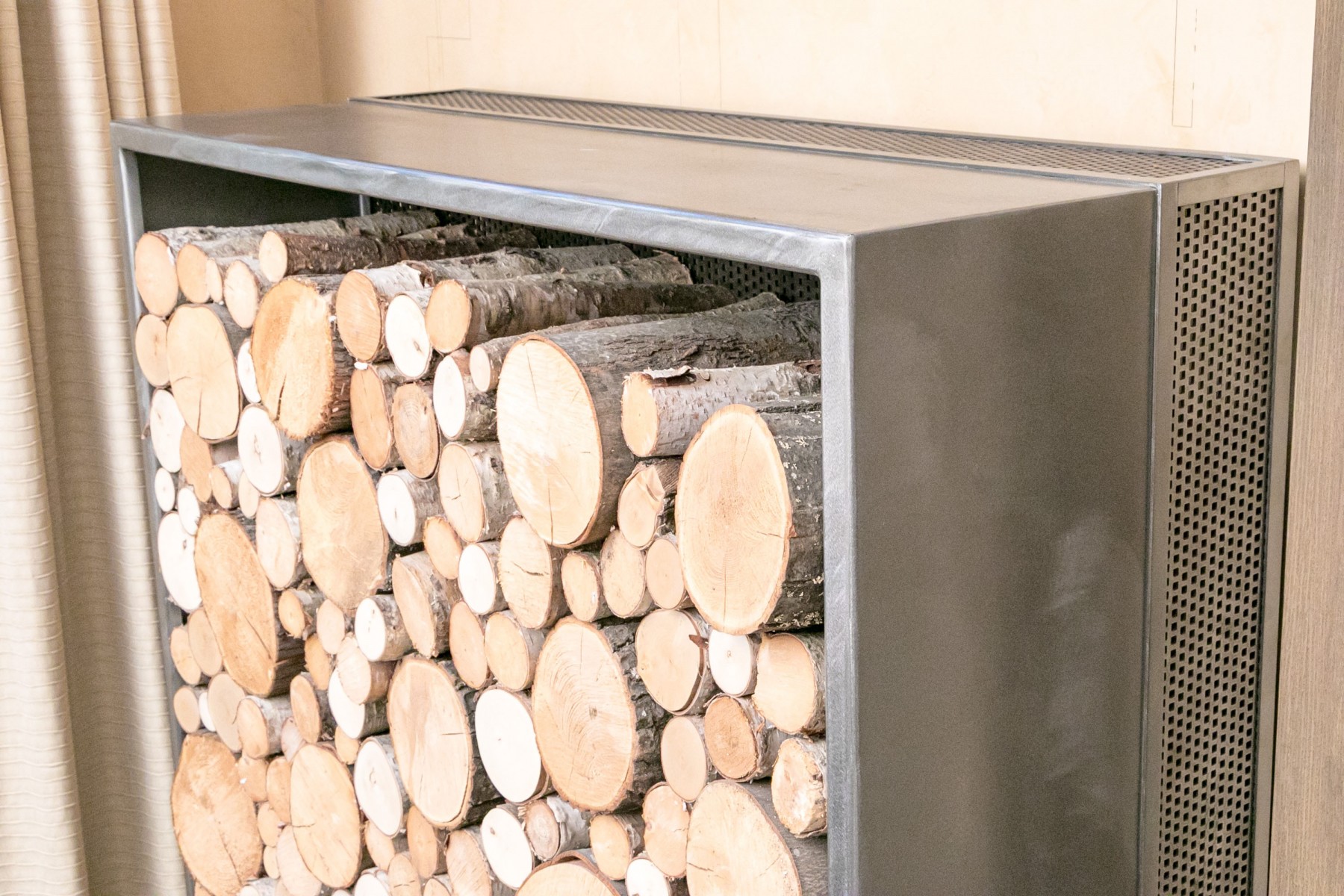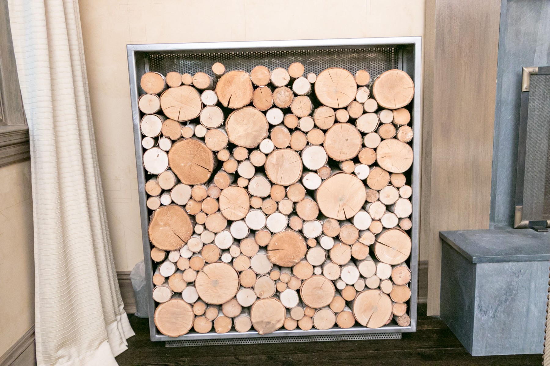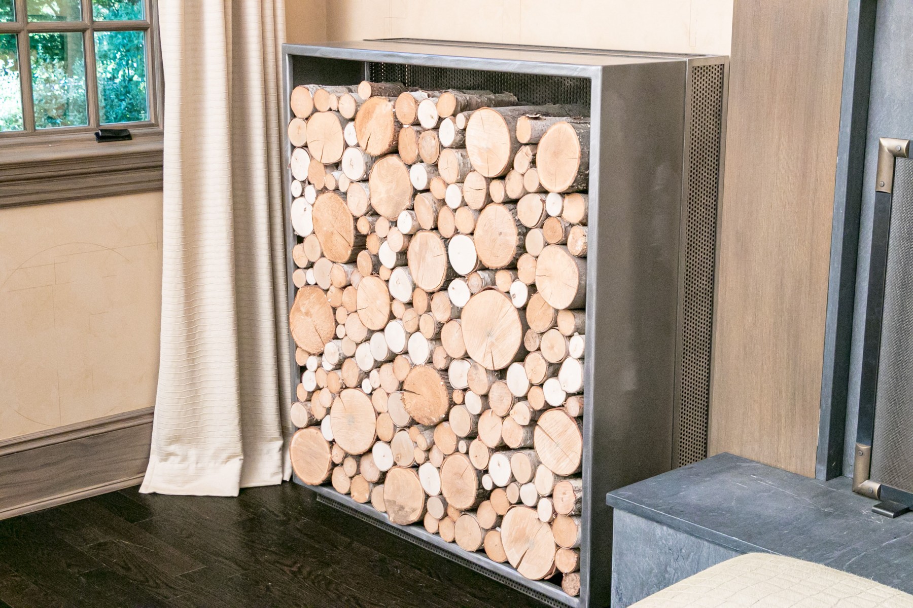Stocked with specially treated Vermont Birch wood, not for use in the fireplace. These are a piece of installed artwork. Thick gauge welded construction, each weighing hundreds of pounds, maybe 300-400 with the wood. They are substantial and stunning in person. The cost of construction was between $4-6,000 each.