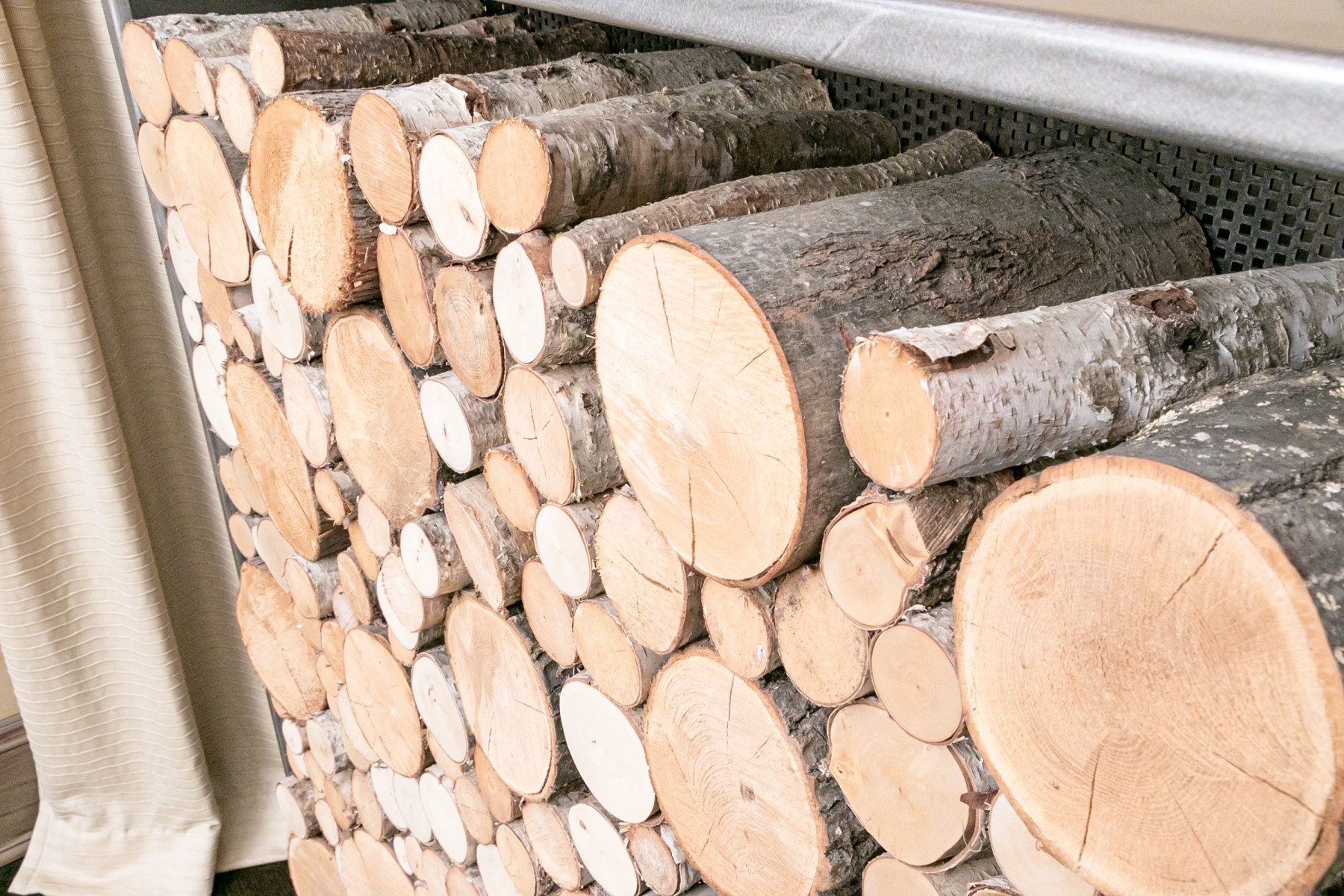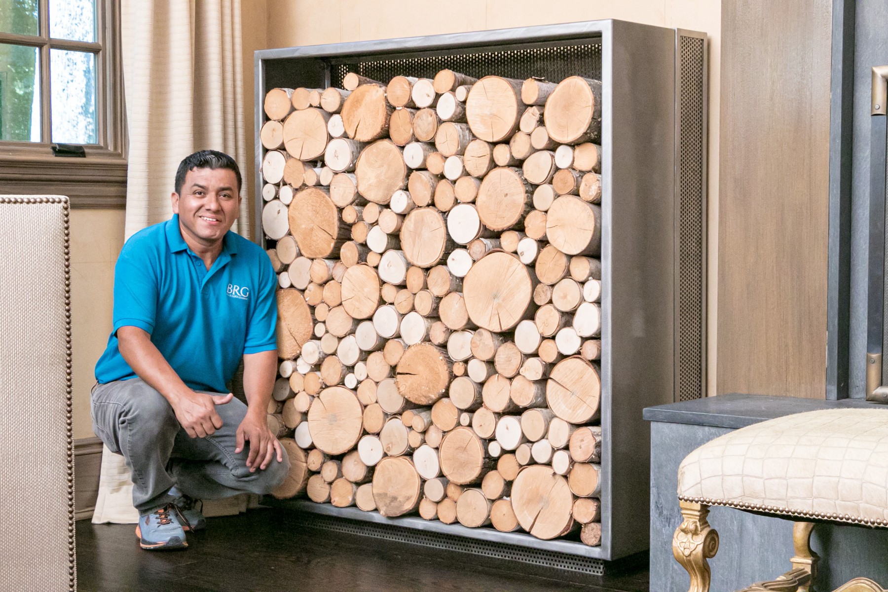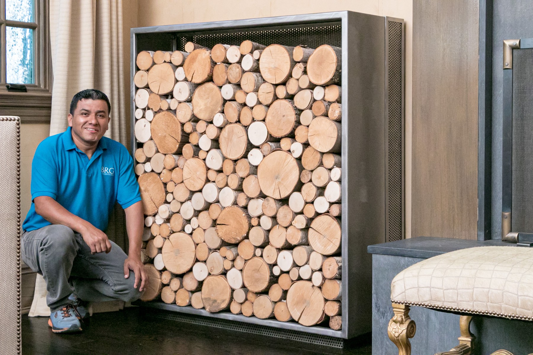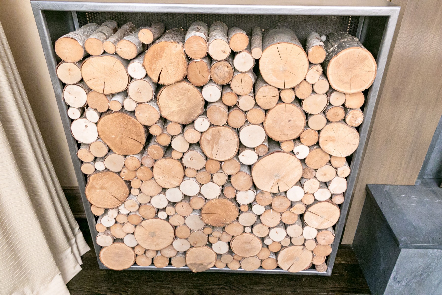 Stocked with specially treated Vermont Birch wood, not for use in the fireplace. These are a piece of installed artwork. Thick gauge welded construction, each weighing hundreds of pounds, maybe 300-400 with the wood. They are substantial and stunning in person. The cost of construction was between $4-6,000 each.