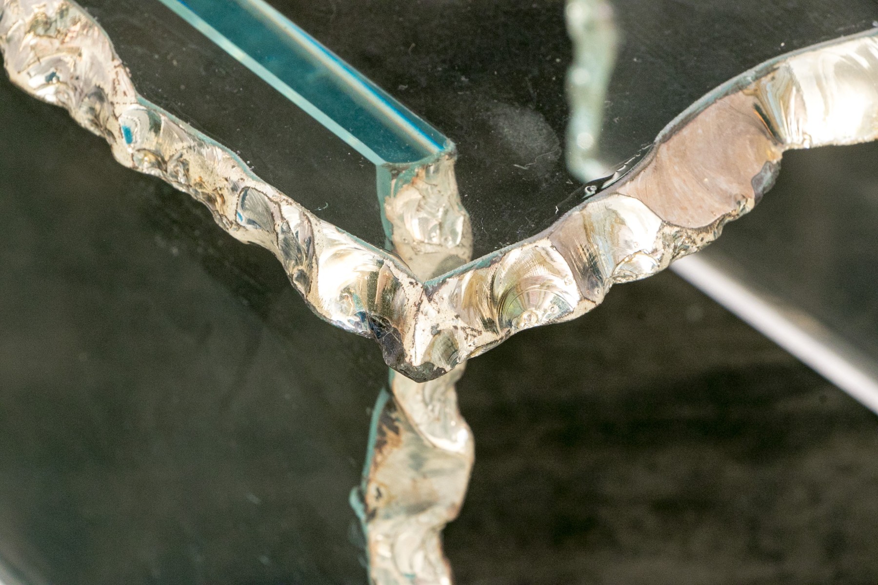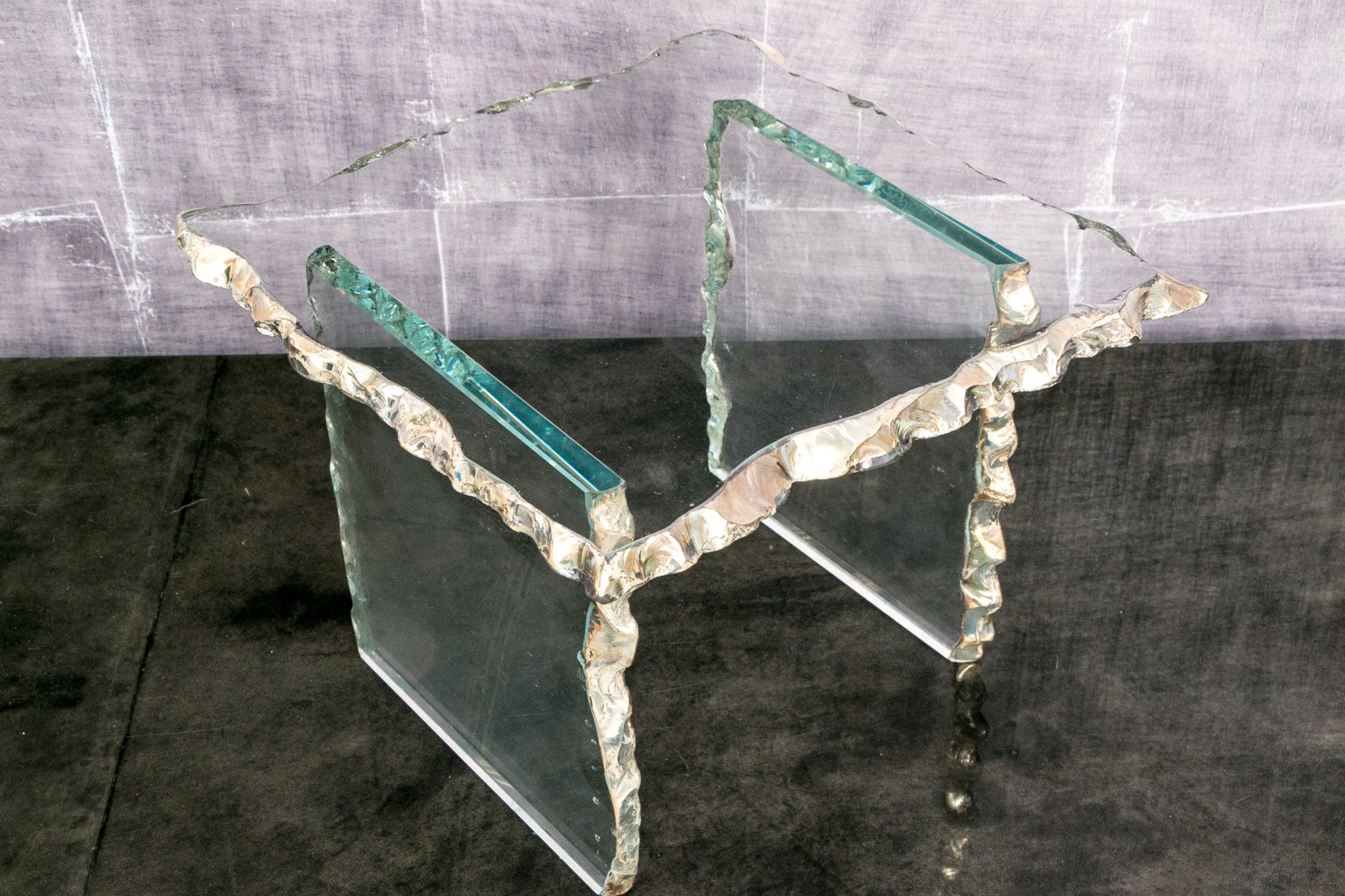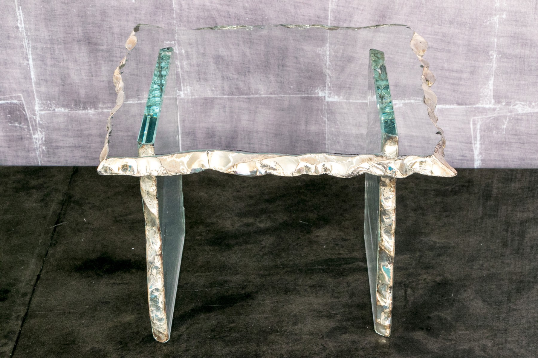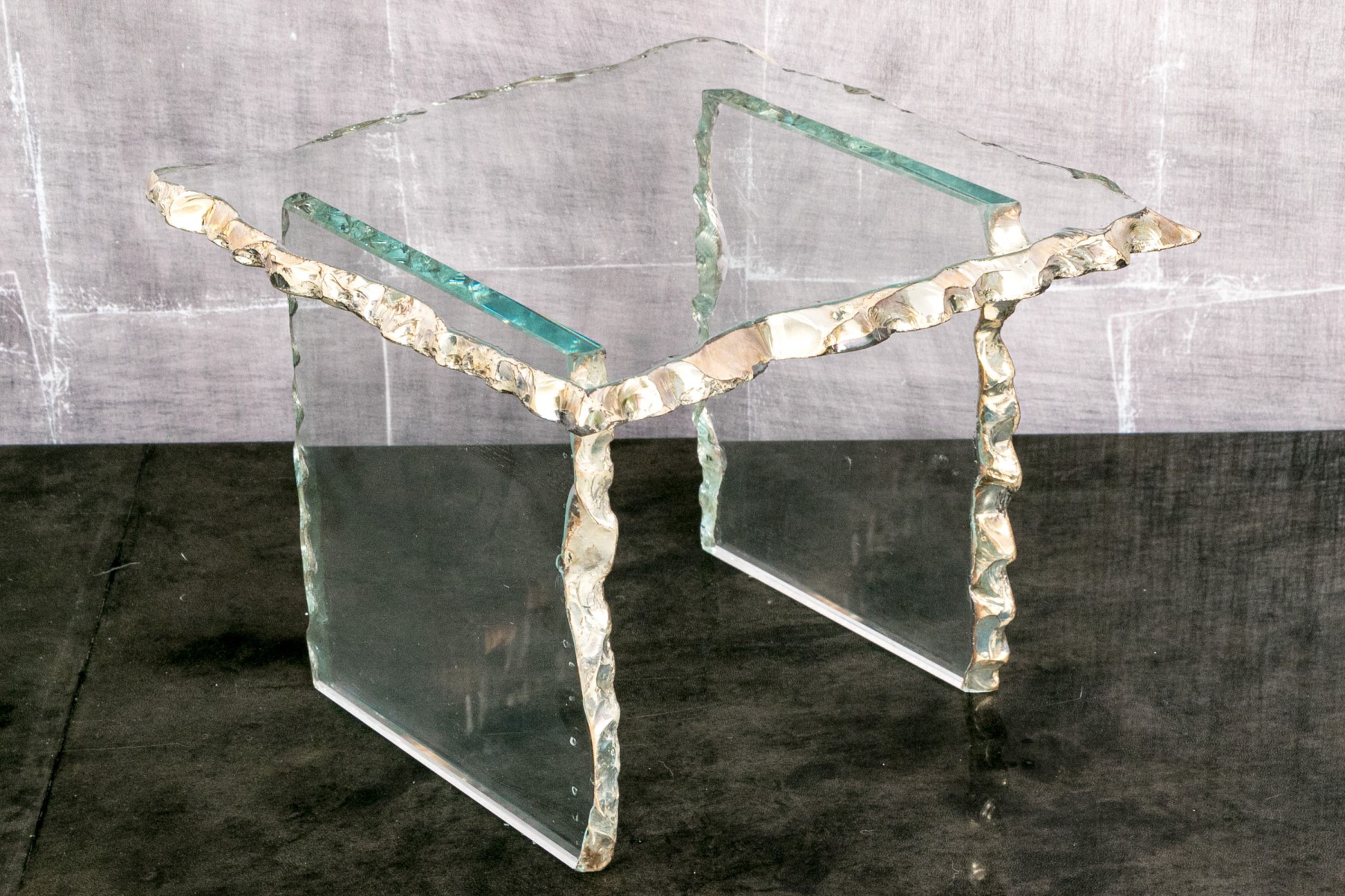 A highly decorative side table, composed of three panels of glass. The hand crafted glass panels have intentionally rough trim edges painted with a silver-gilt finish for a highly decorative faux live edge aesthetic.
