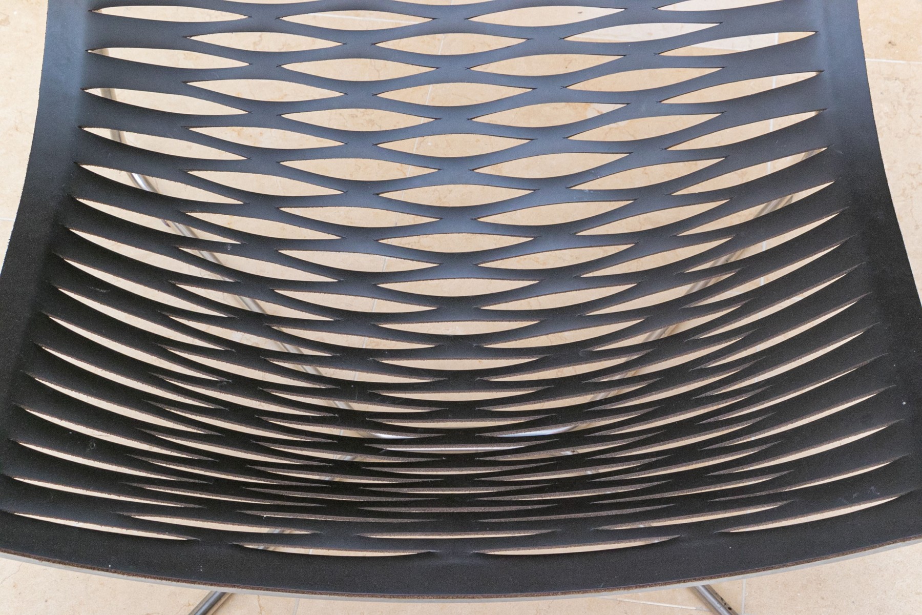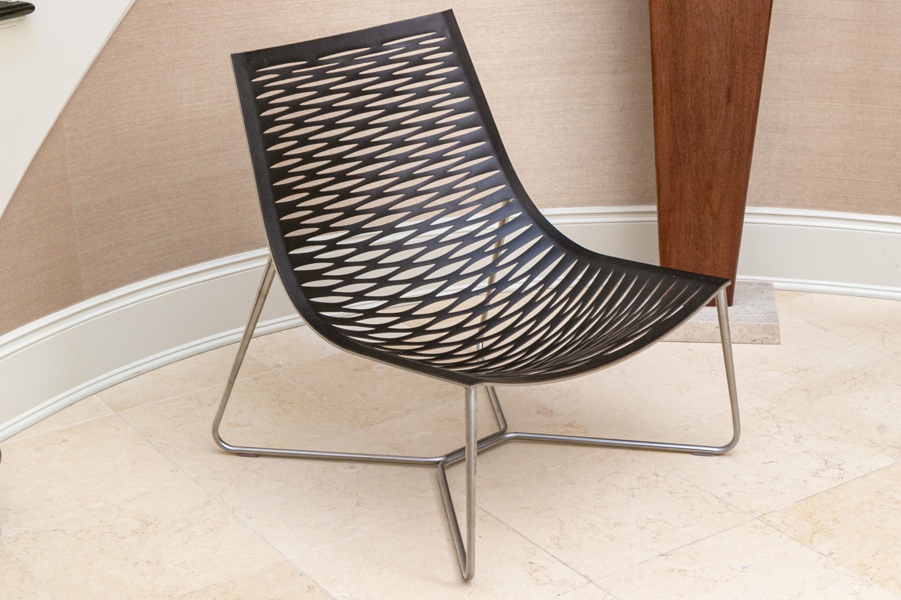 Fabulously crafted on its steel frame the pierced, openwork leather seat envelopes you as you sit for a wonderfully comfortable seat.
