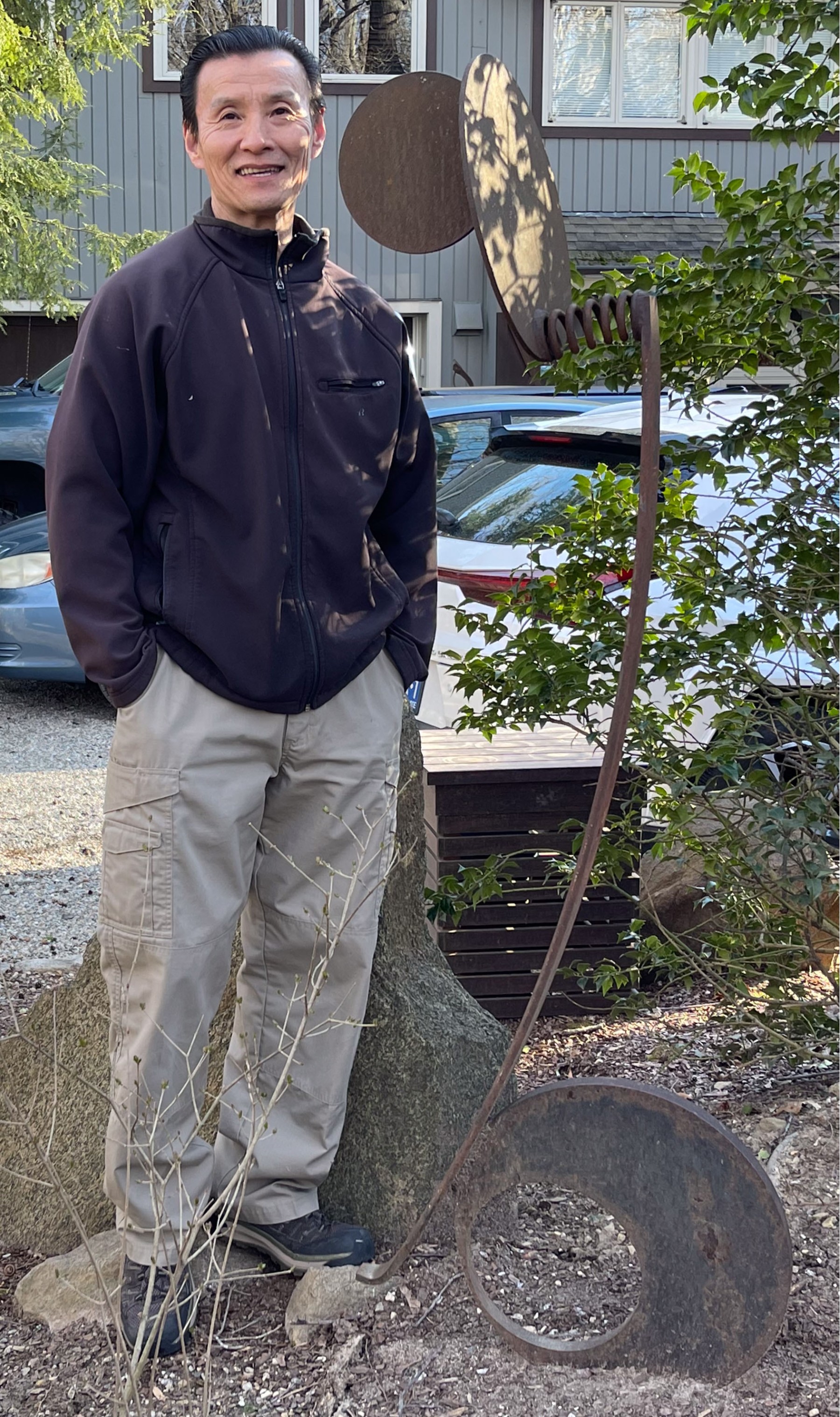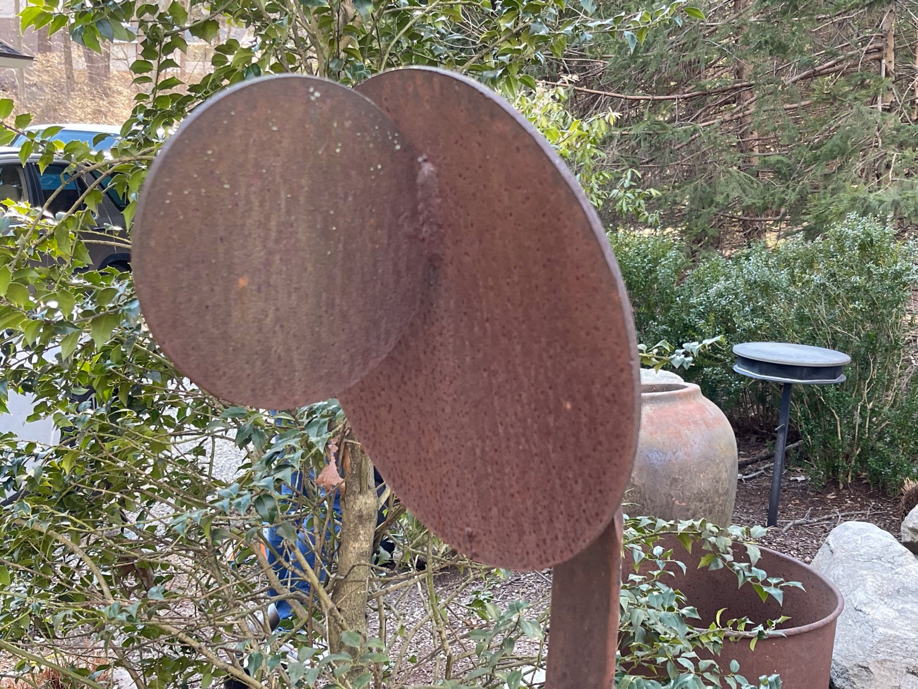 Modern and abstract outdoor wrought iron sculpture. The whole is raised on a circular base. A great piece for any house!