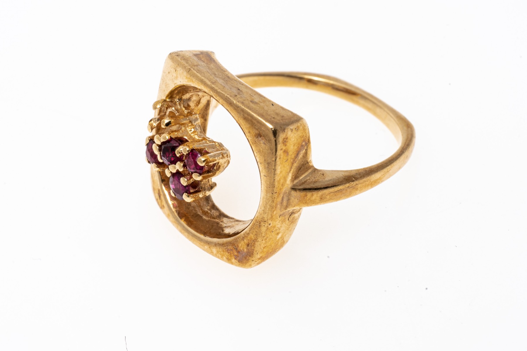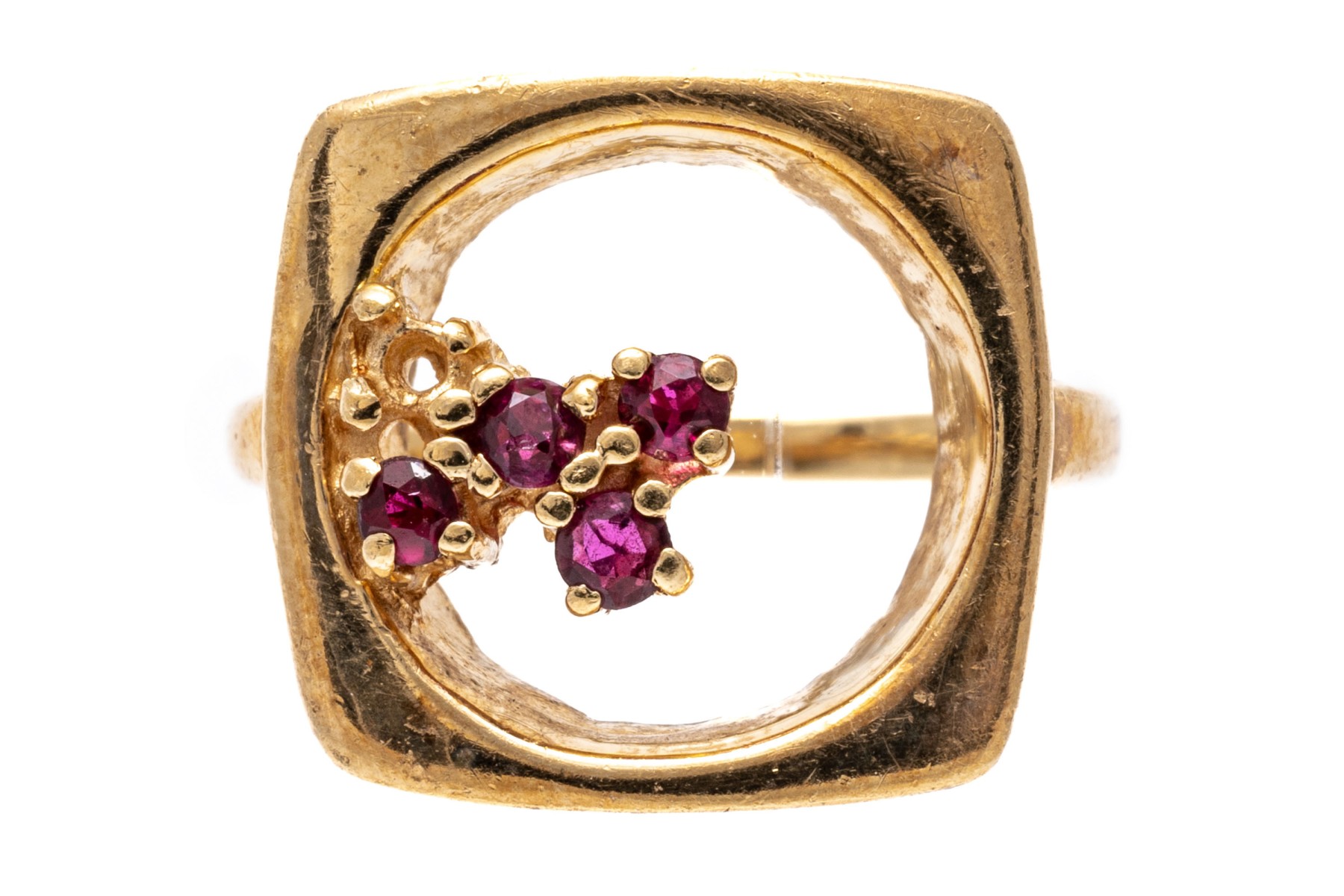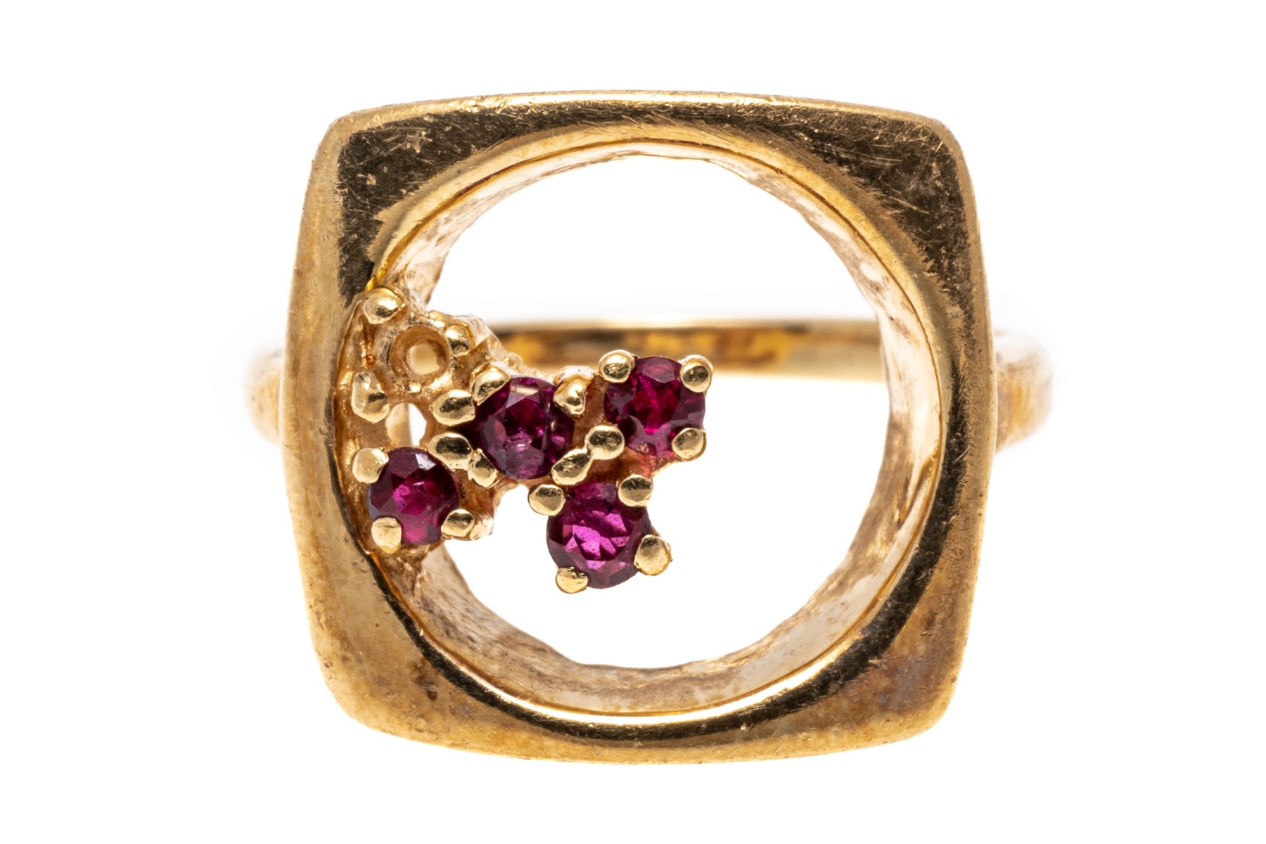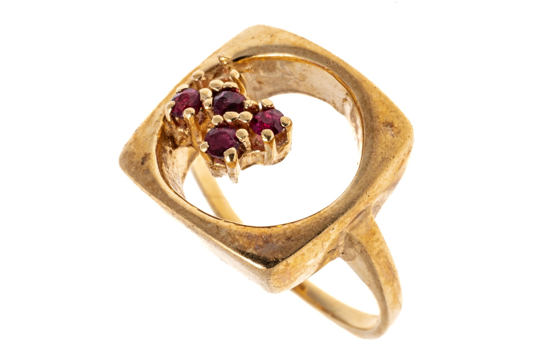14K yellow gold ring. The artistic design of the ring features an open circle within a square fame. Off set into the circle are four small round cut rubies, approximately 0.1 TCW. Ring size 4.