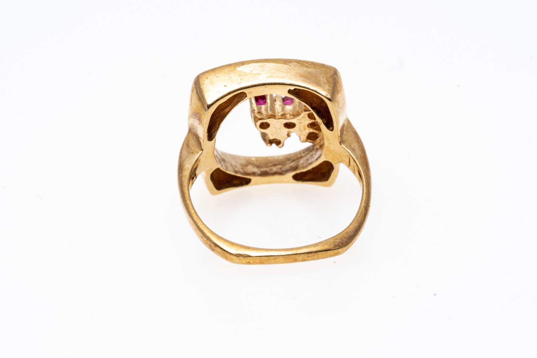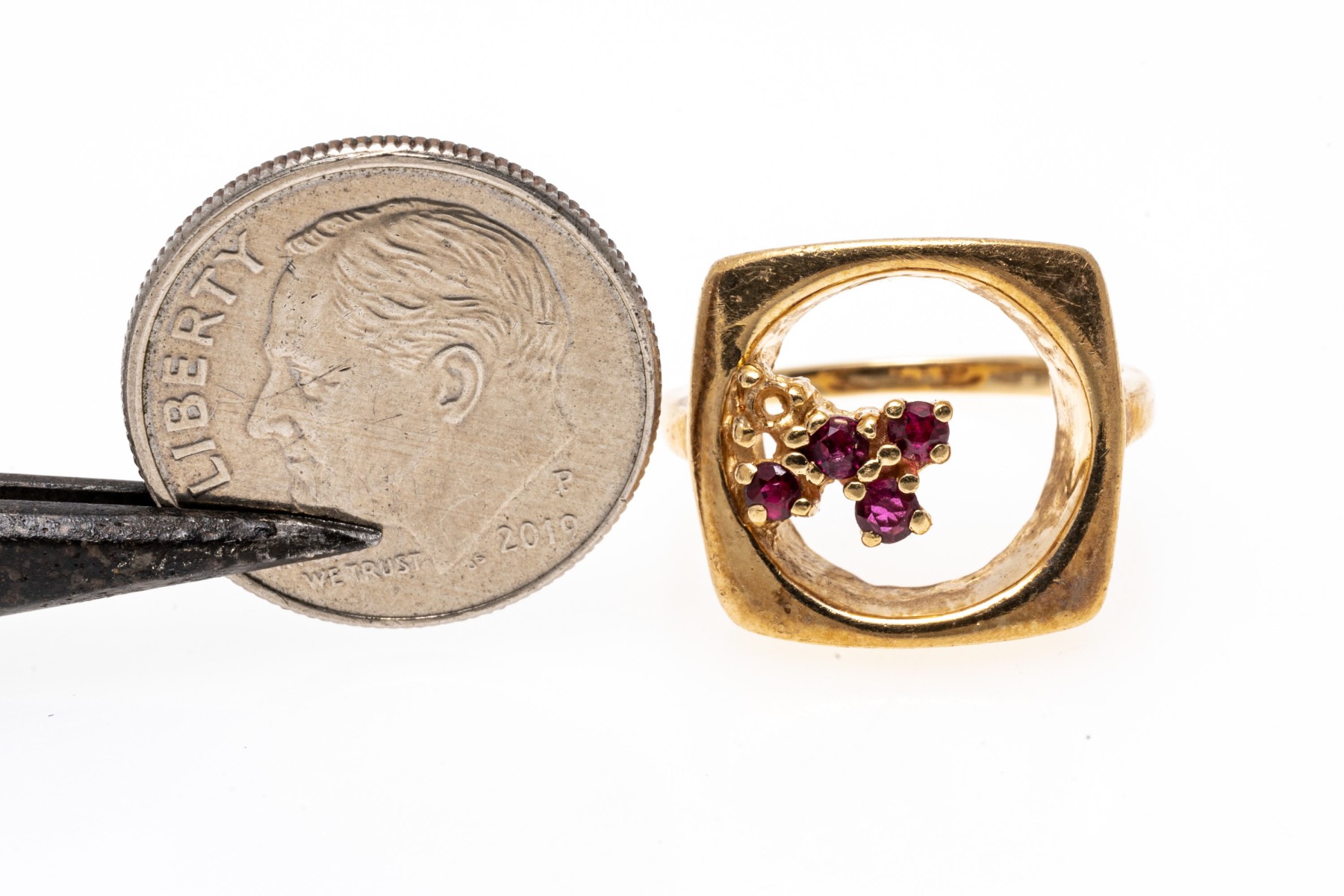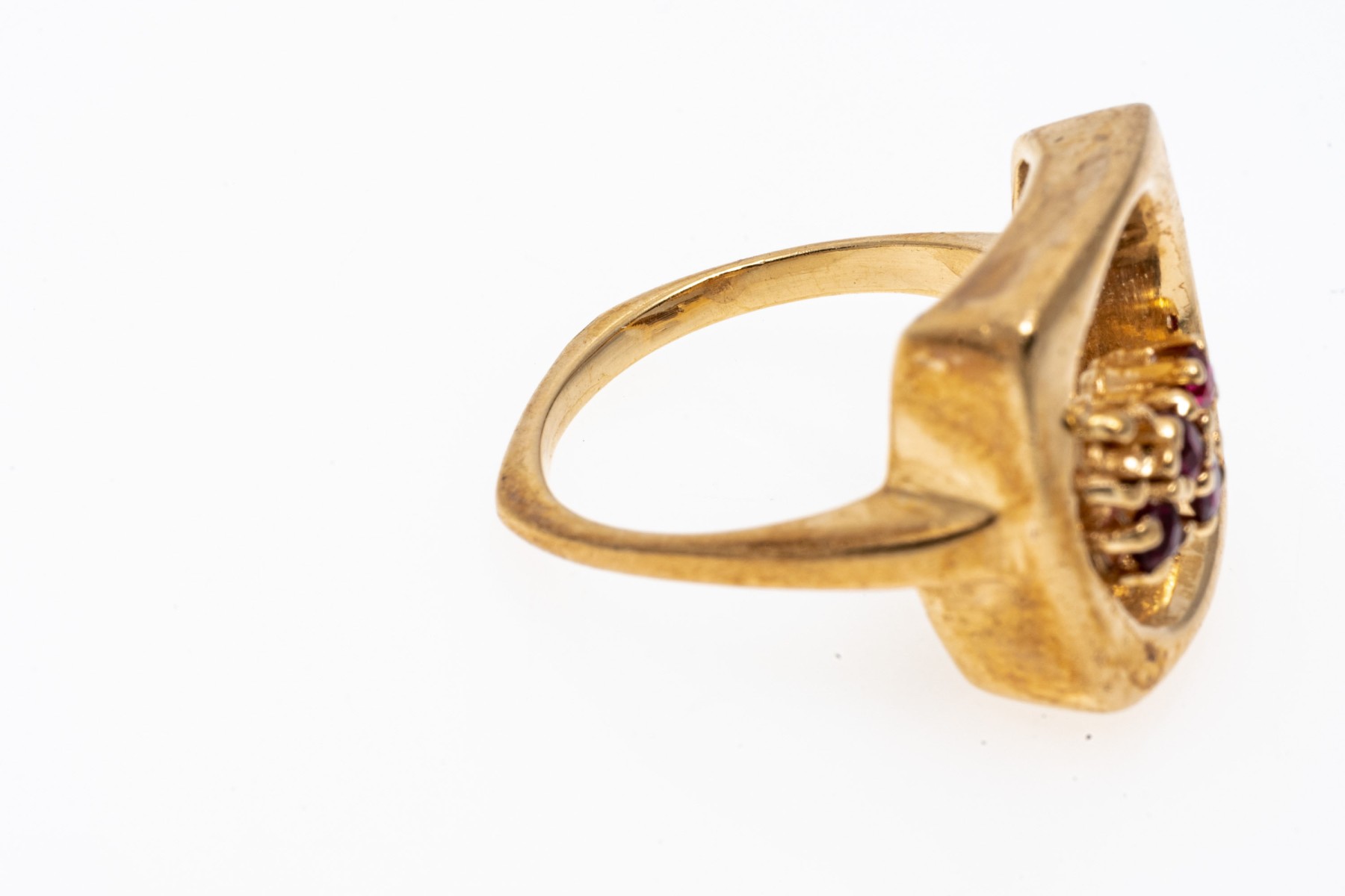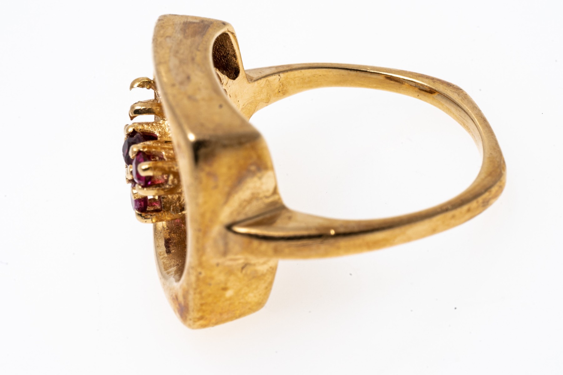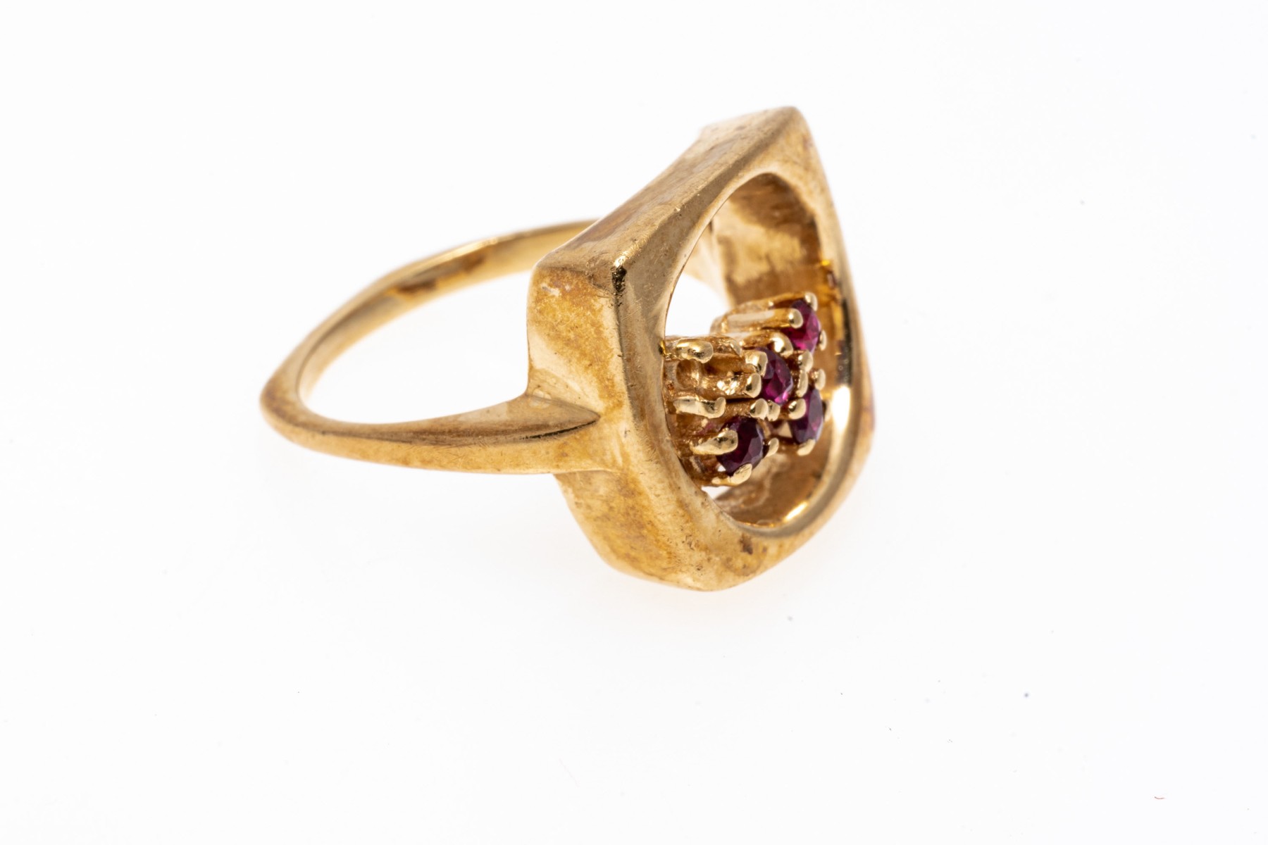14K yellow gold ring. The artistic design of the ring features an open circle within a square fame. Off set into the circle are four small round cut rubies, approximately 0.1 TCW. Ring size 4.