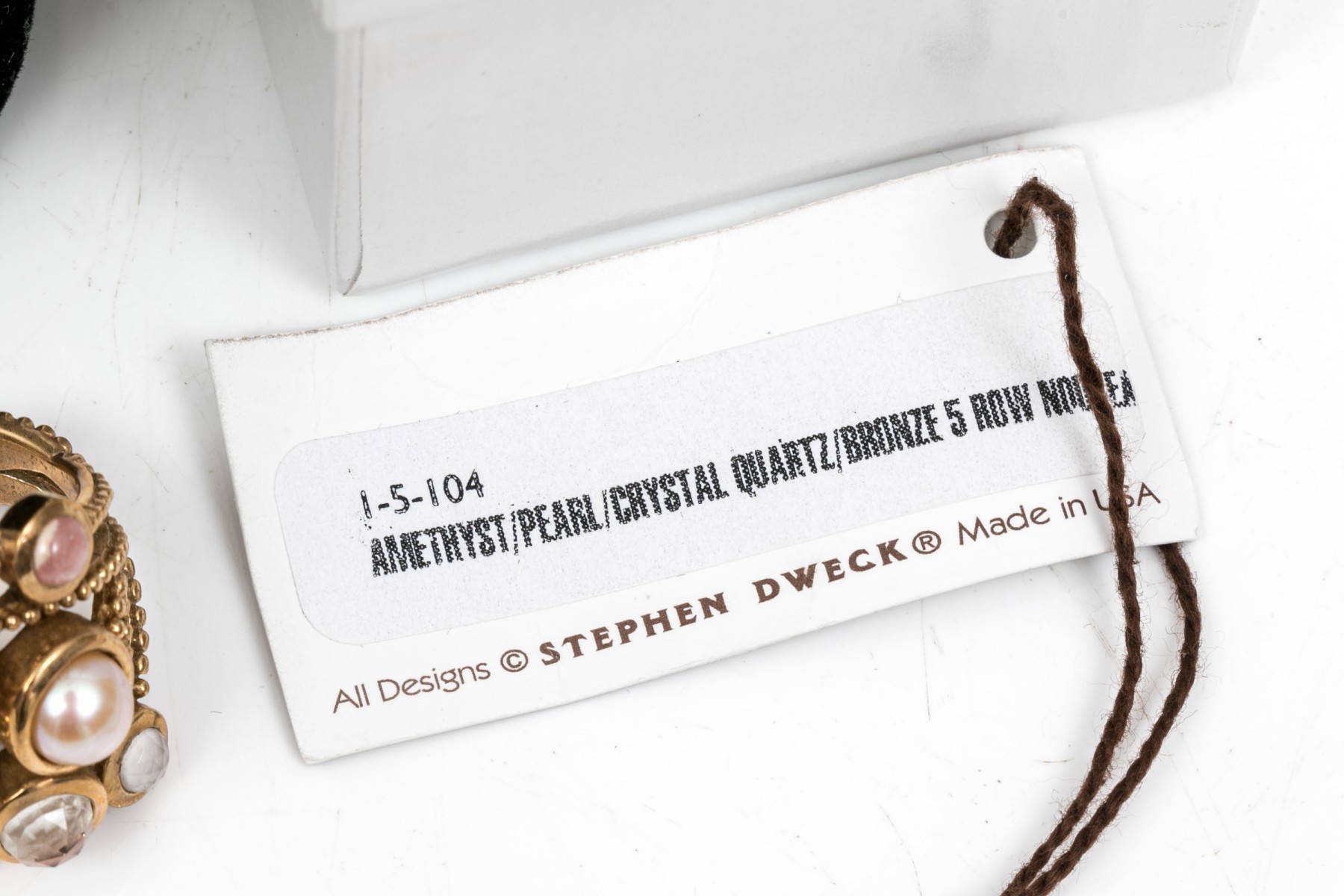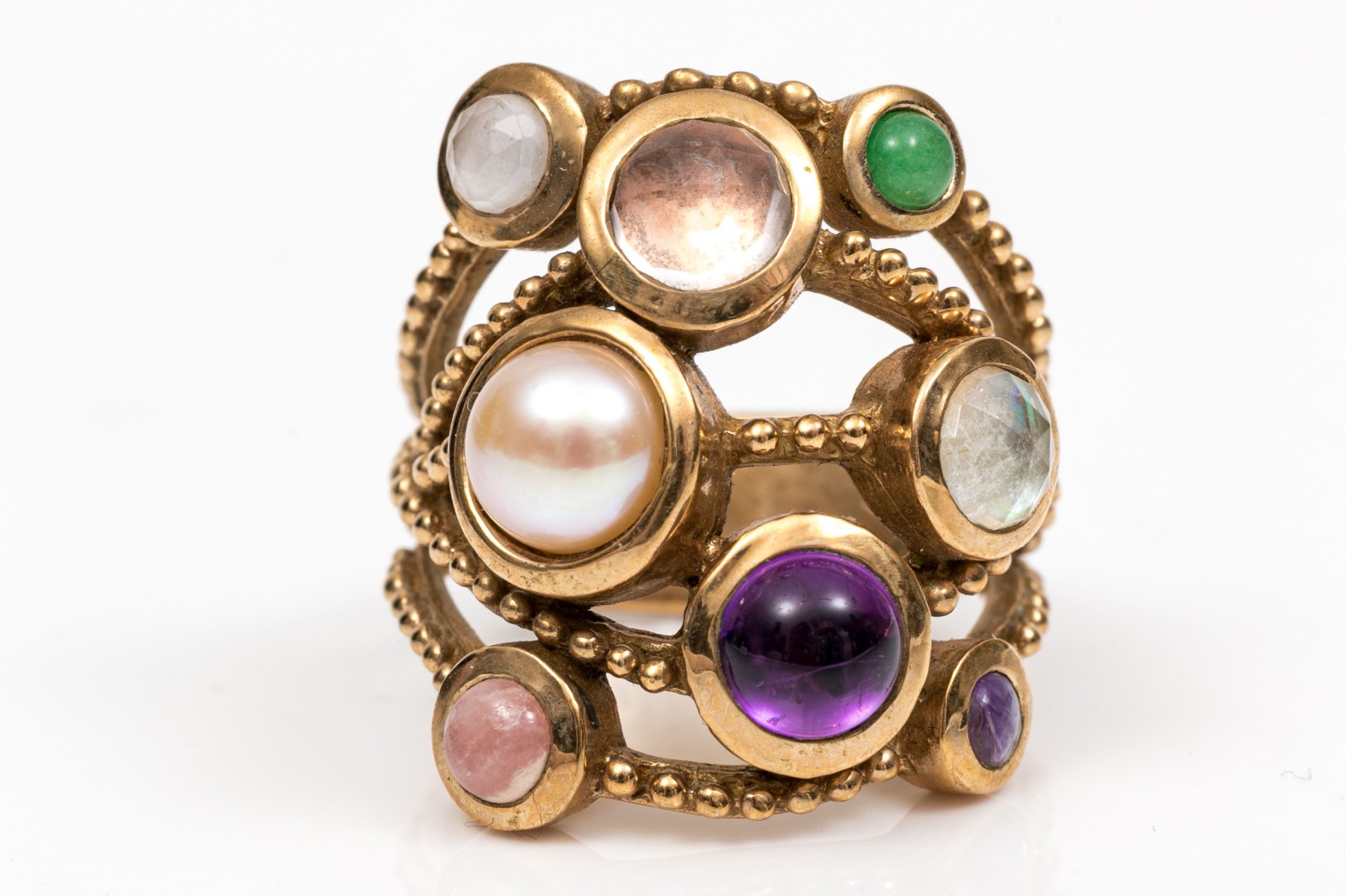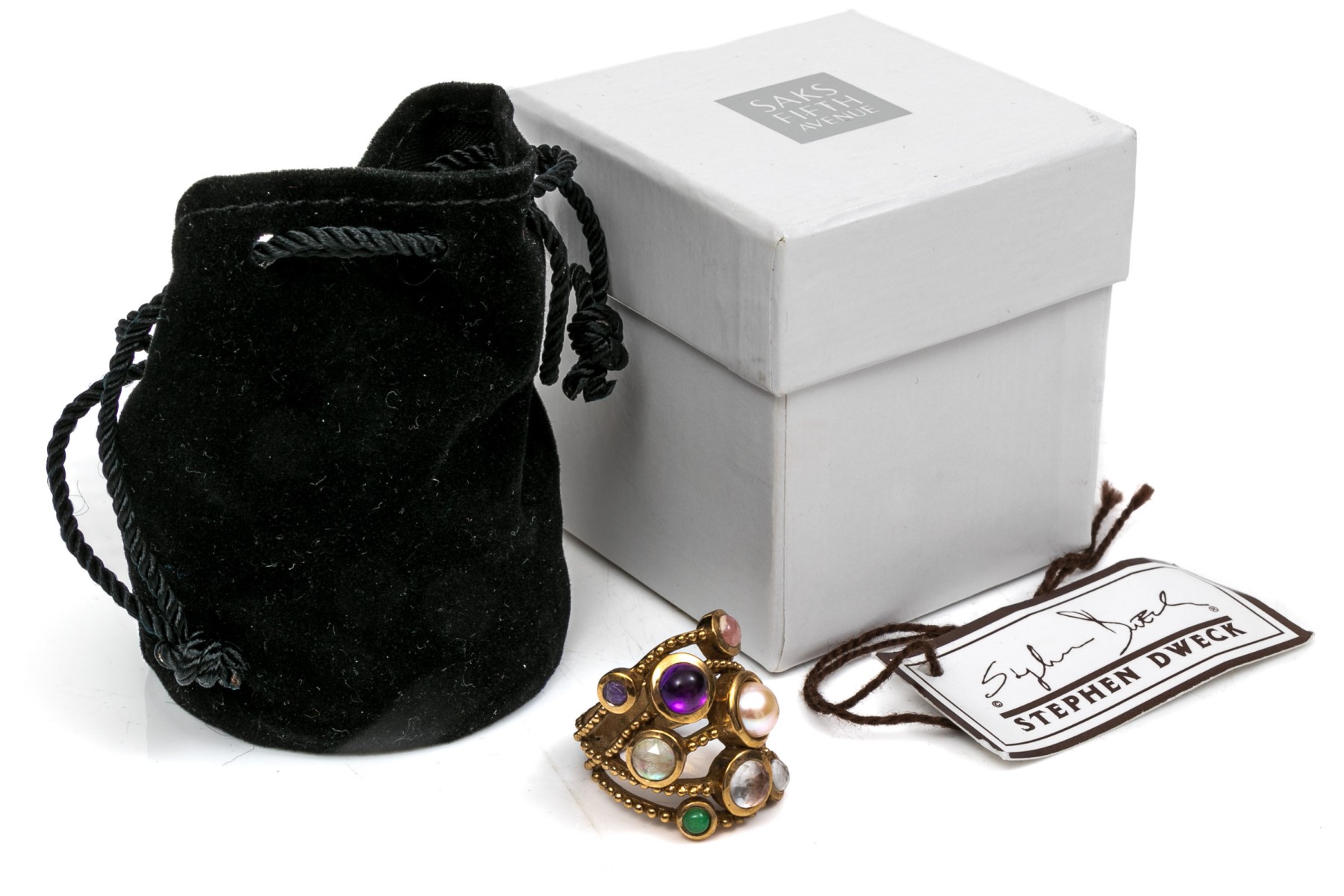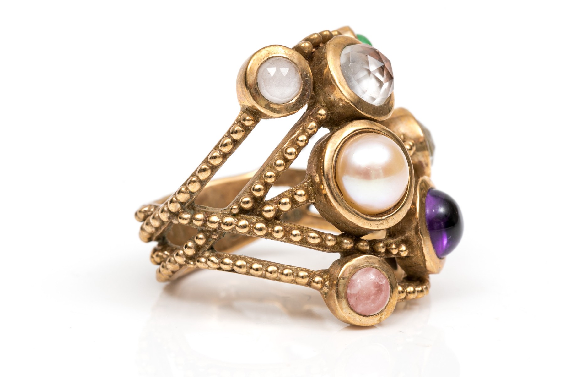 An artistic ring by Stephen Dweck. The ring has an open design and is set with amethyst and white quarts stones. Beadwork shanks and band. Ring size7