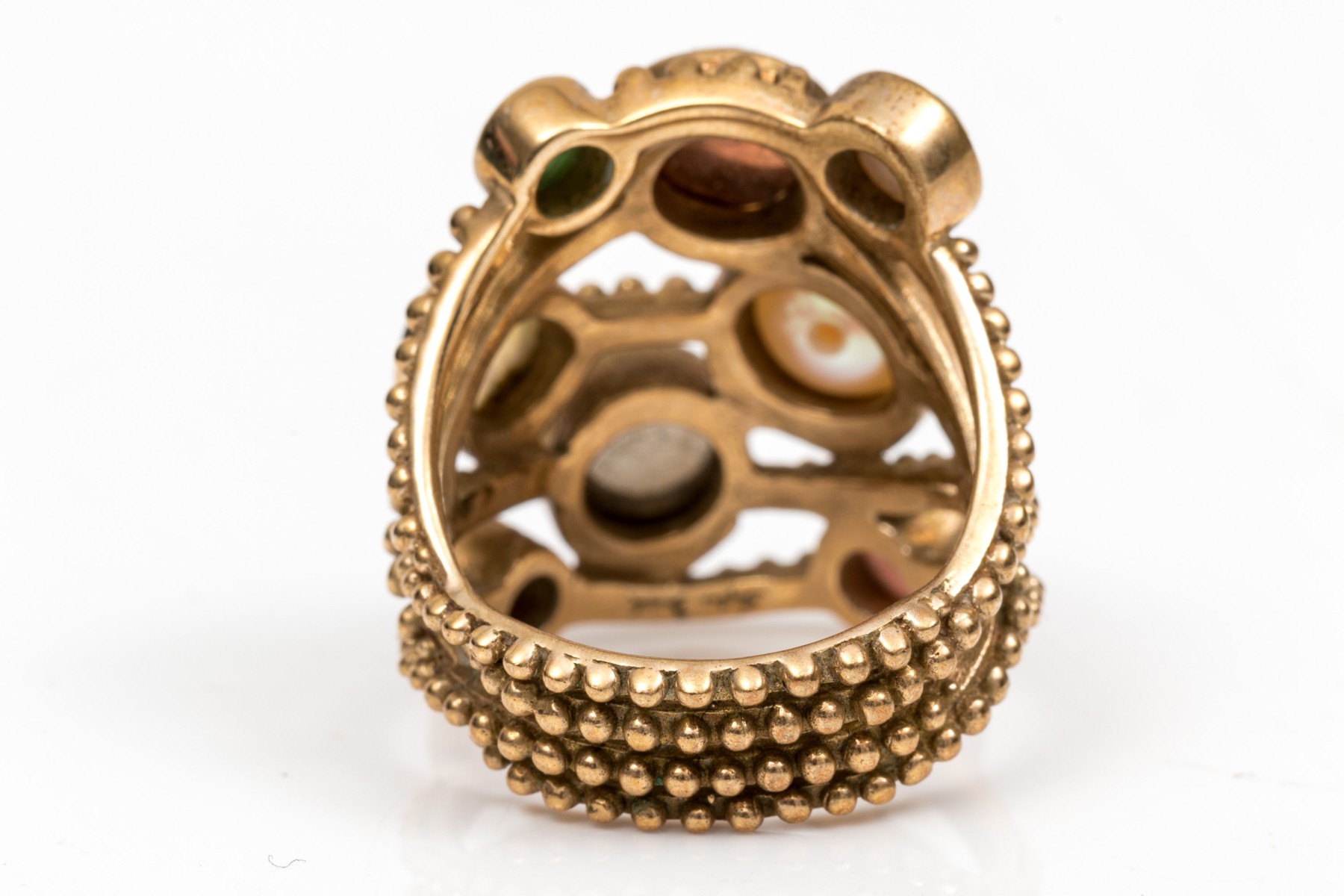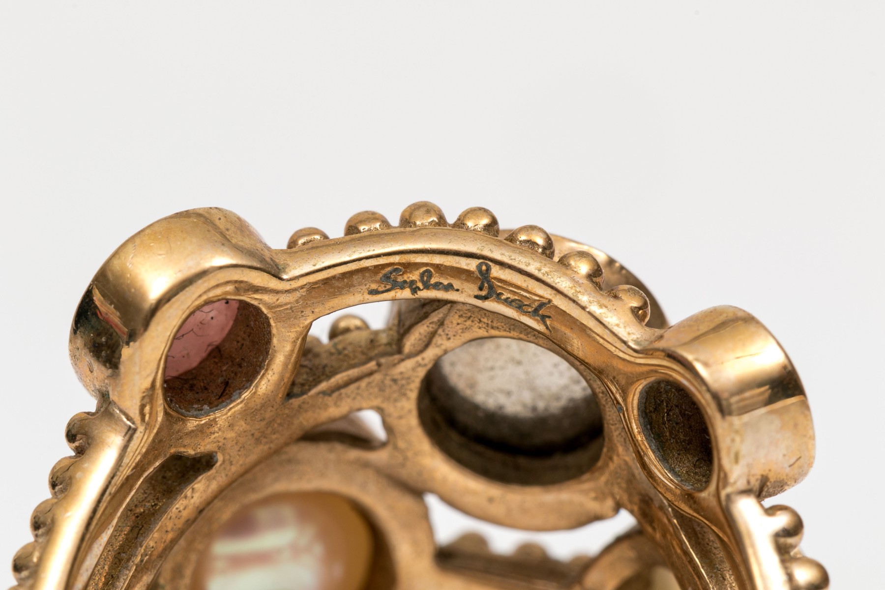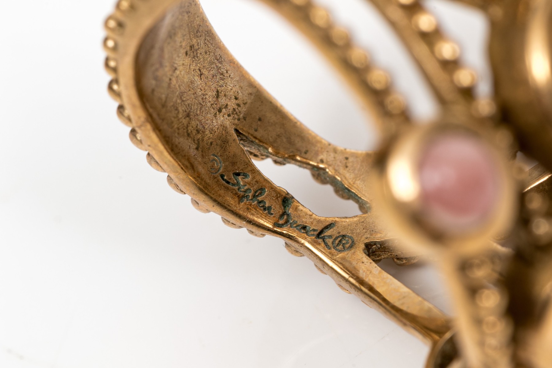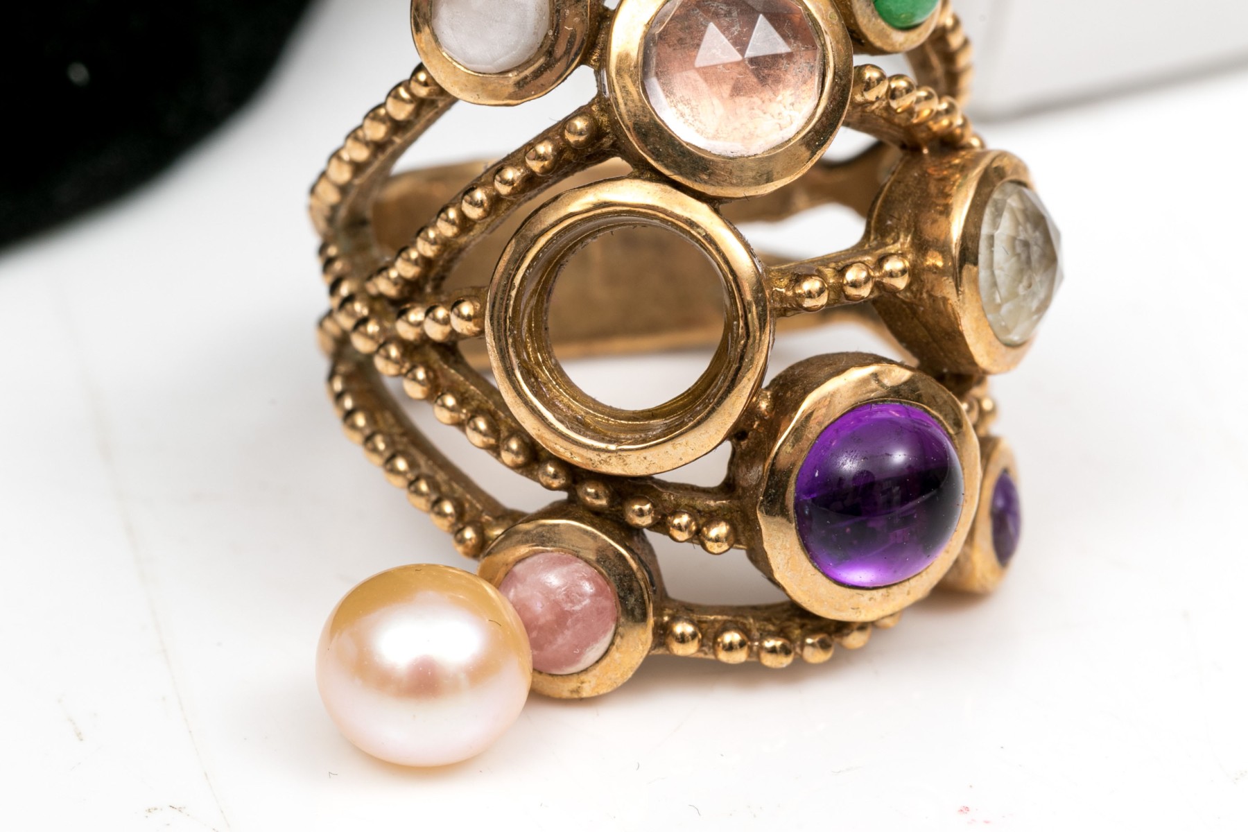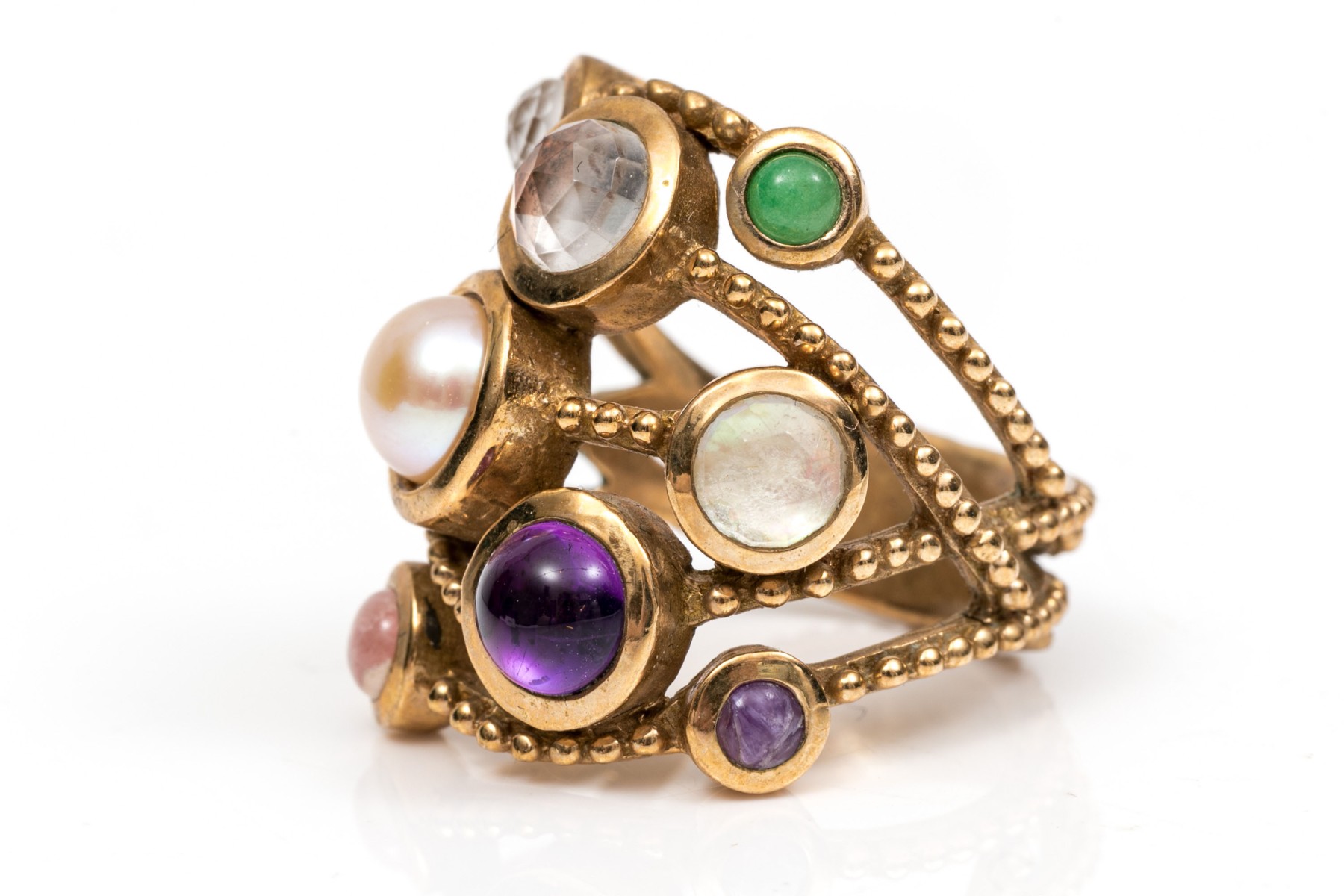 An artistic ring by Stephen Dweck. The ring has an open design and is set with amethyst and white quarts stones. Beadwork shanks and band. Ring size7