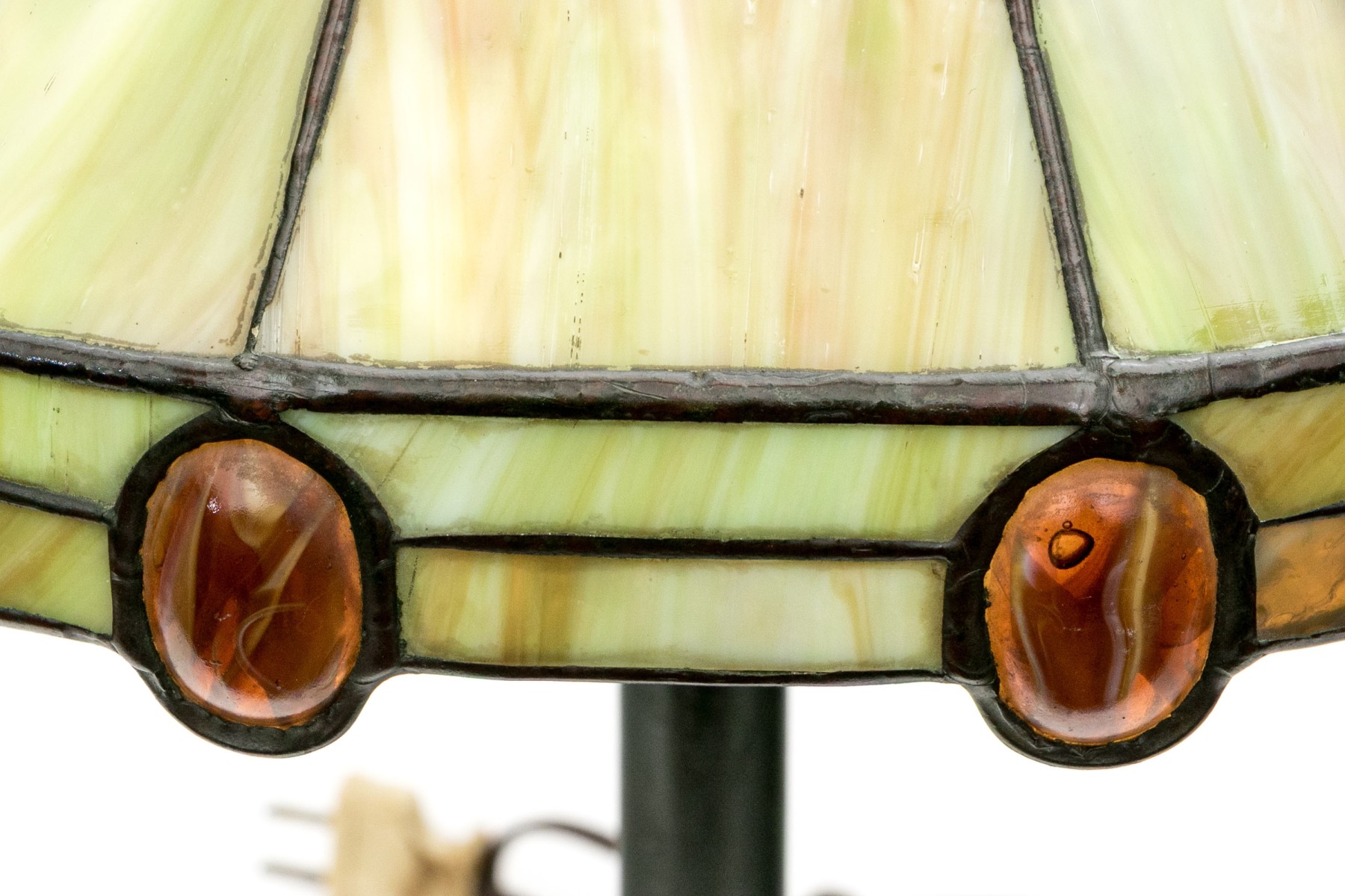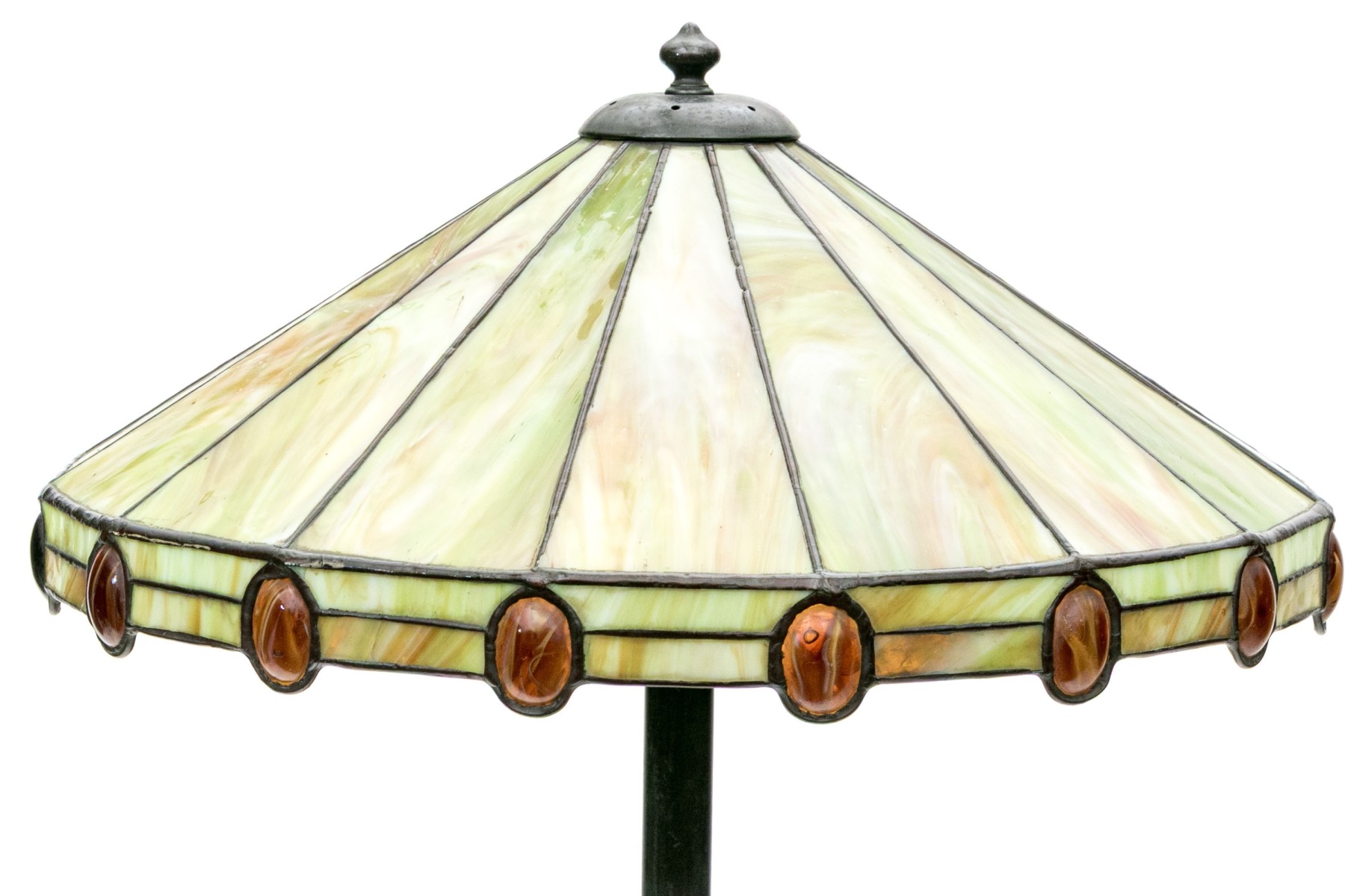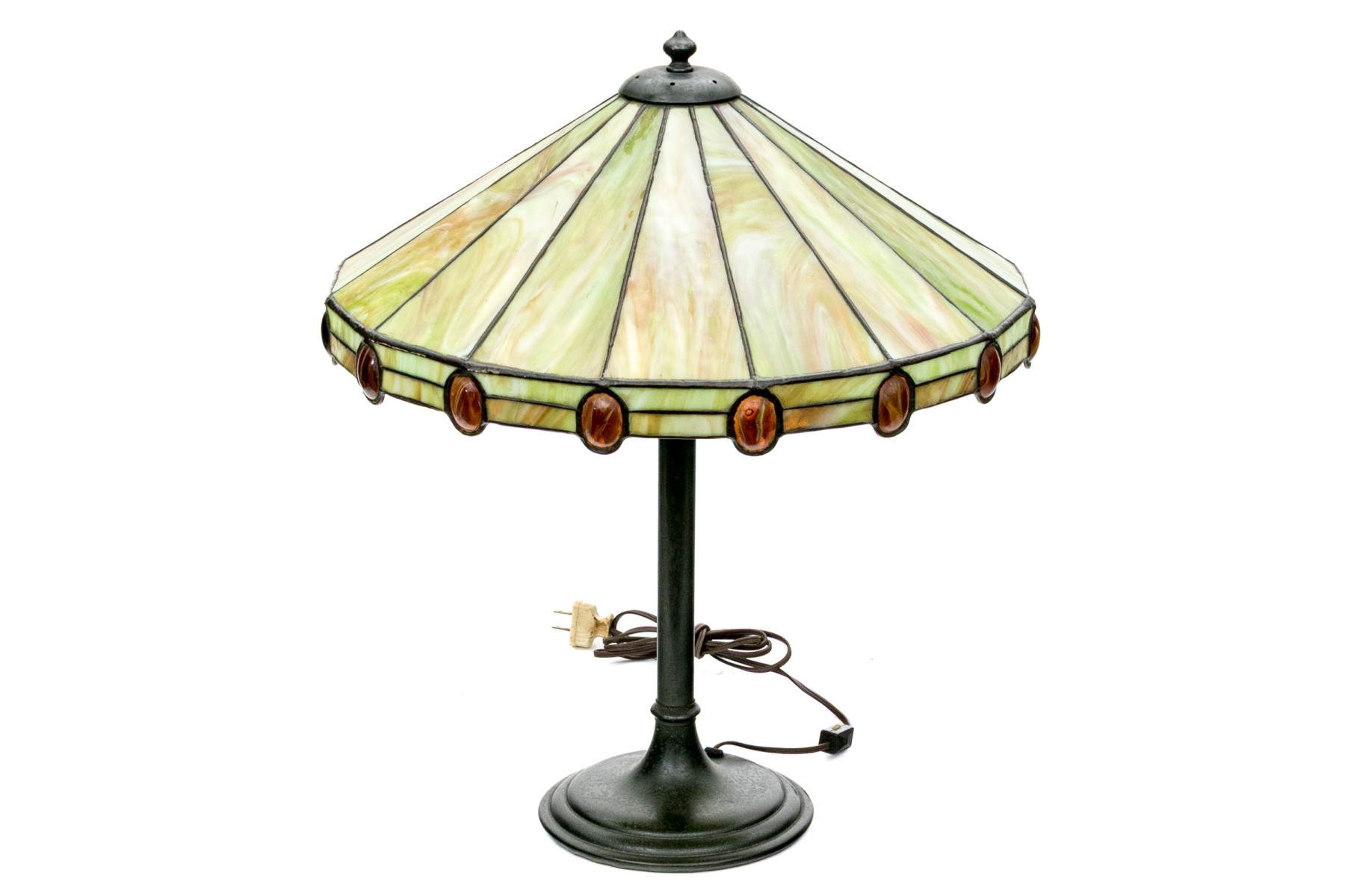 A gorgeous leaded glass period table lamp with a stunning conical paneled slag glass shade marbled in spring green, orange, and white. Topped with a dark patinaed finial, the shade, sports a rim of eye-catching arrangement of orange cabochon style oval medallions with a rich amber-orange hue. The lamp is supported by a sleek cylindrical column over a circular base with a stepped edge.