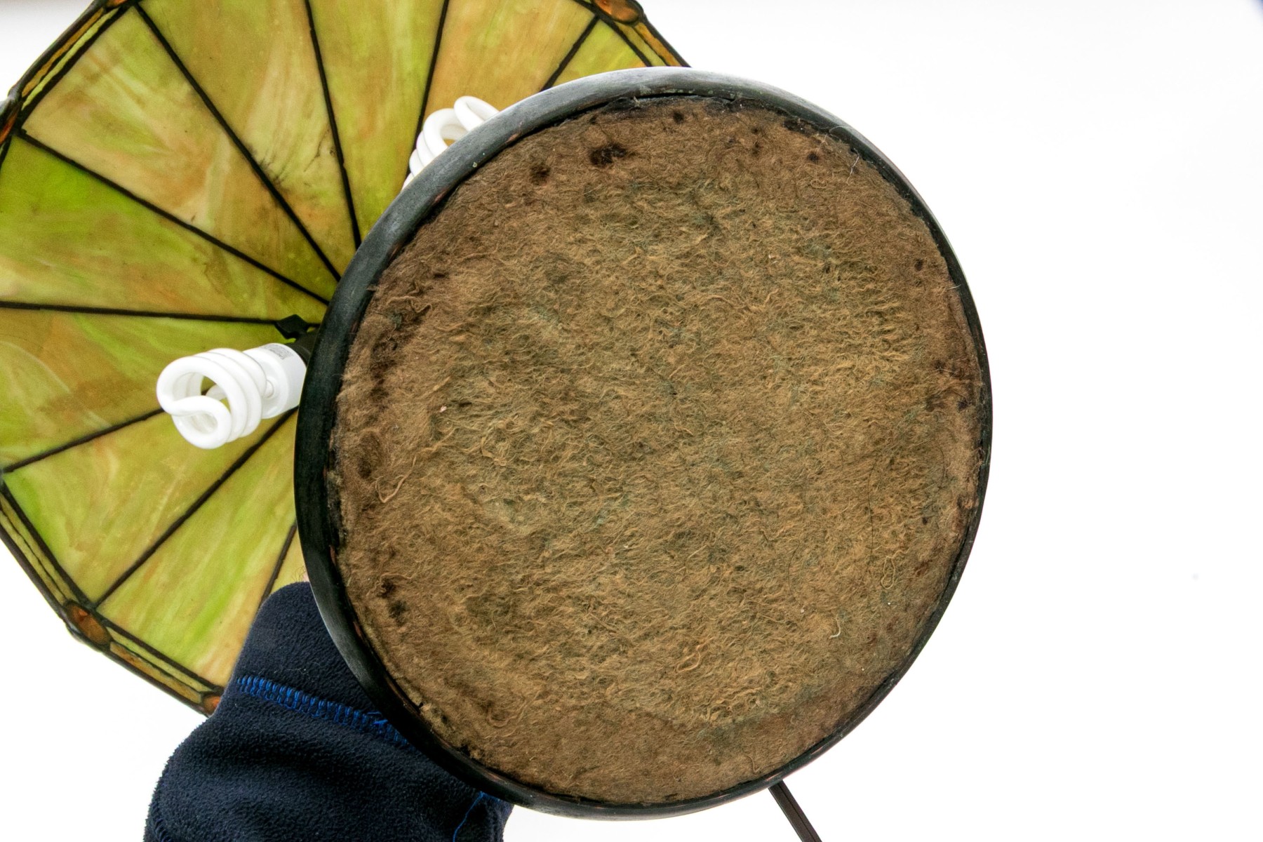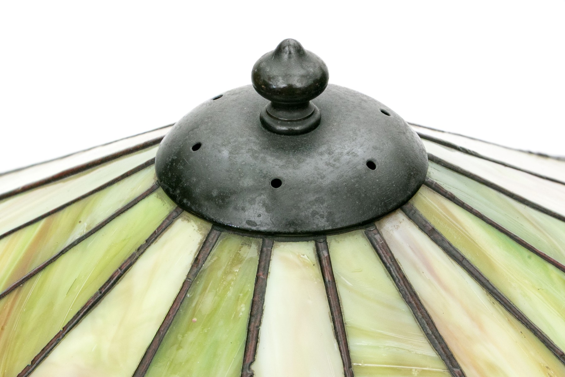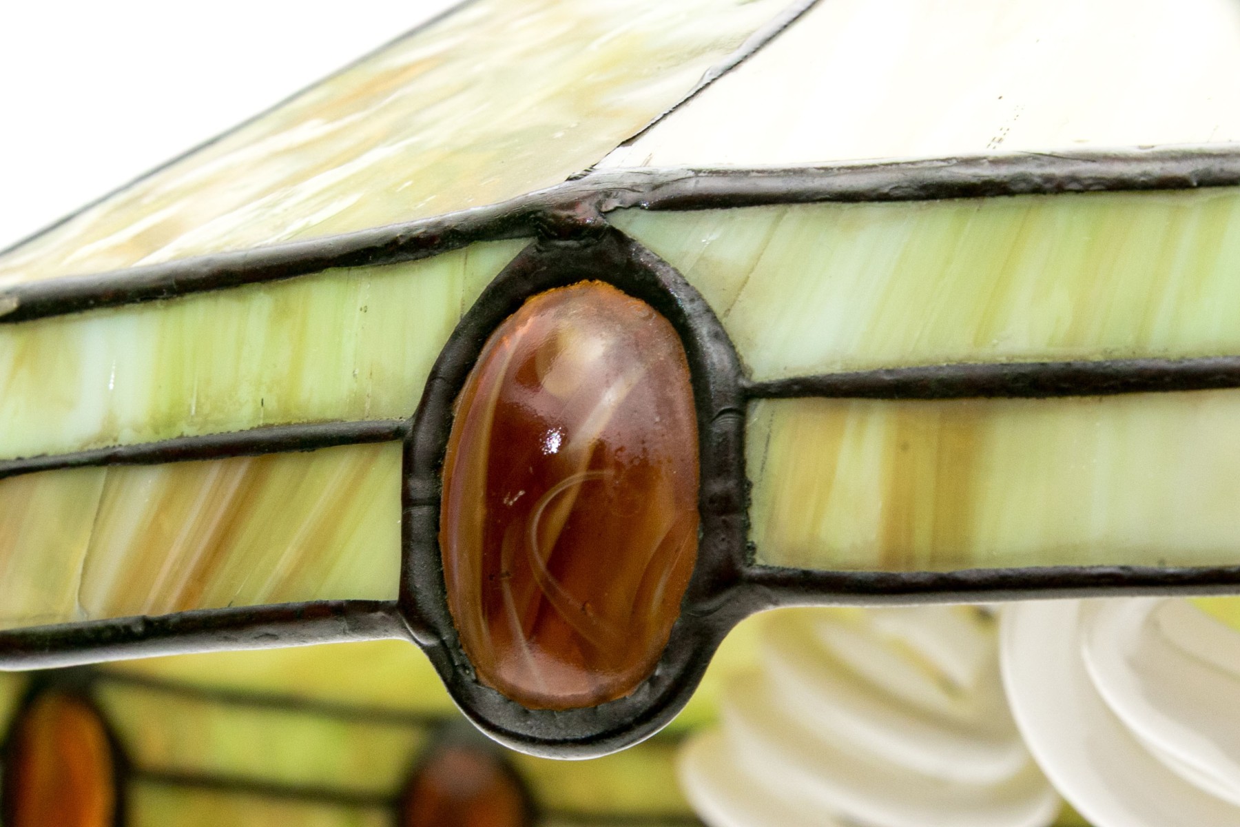 A gorgeous leaded glass period table lamp with a stunning conical paneled slag glass shade marbled in spring green, orange, and white. Topped with a dark patinaed finial, the shade, sports a rim of eye-catching arrangement of orange cabochon style oval medallions with a rich amber-orange hue. The lamp is supported by a sleek cylindrical column over a circular base with a stepped edge.