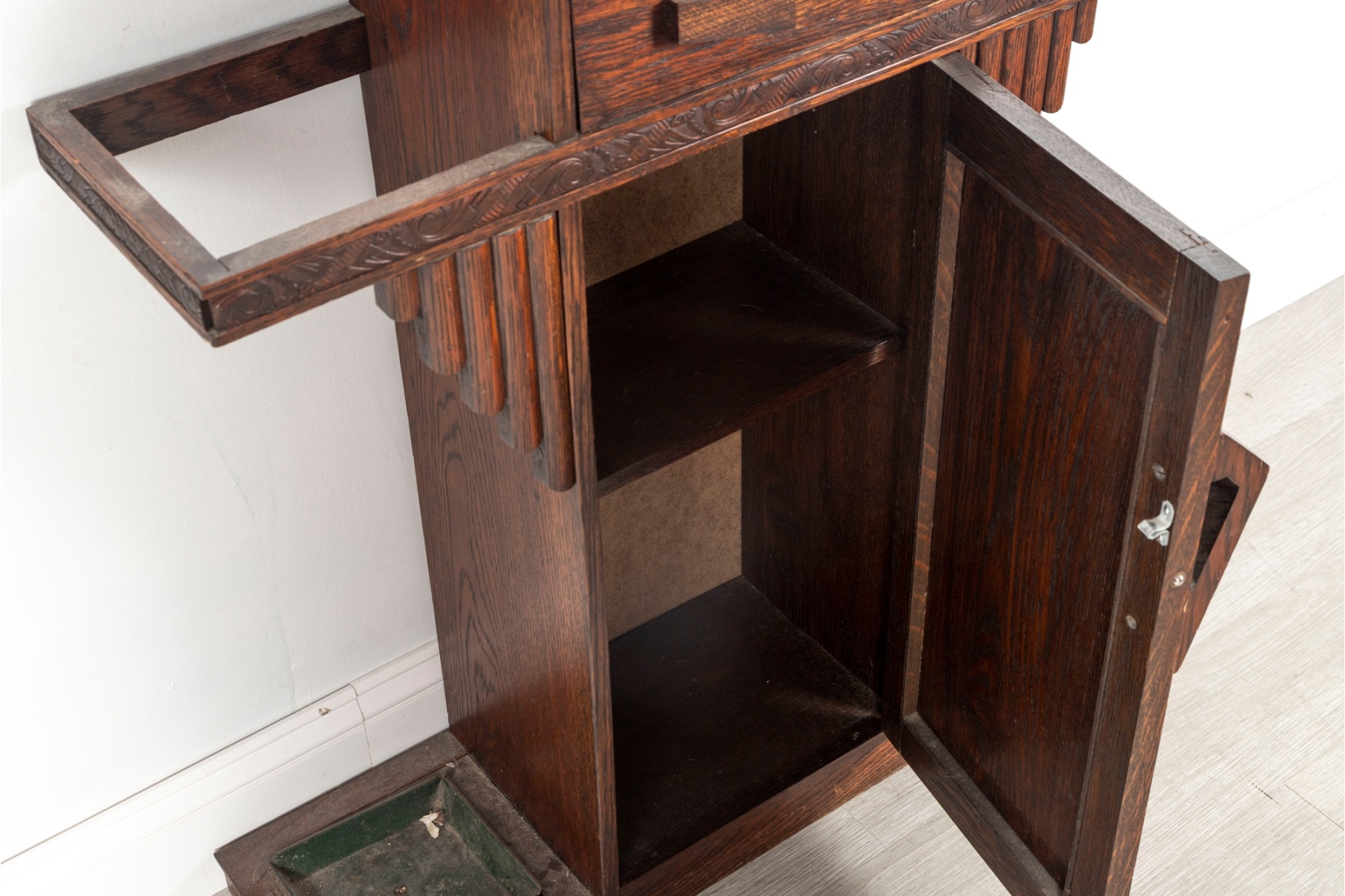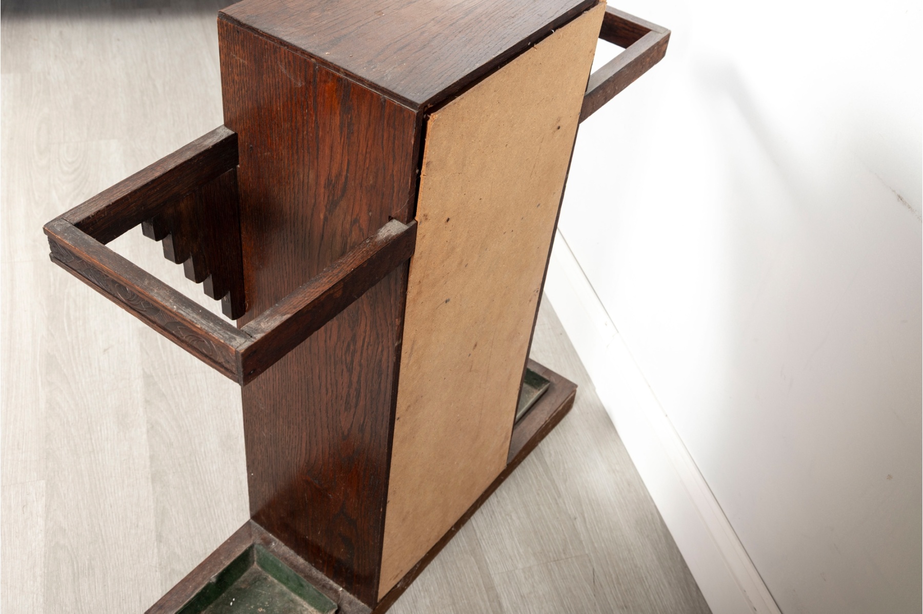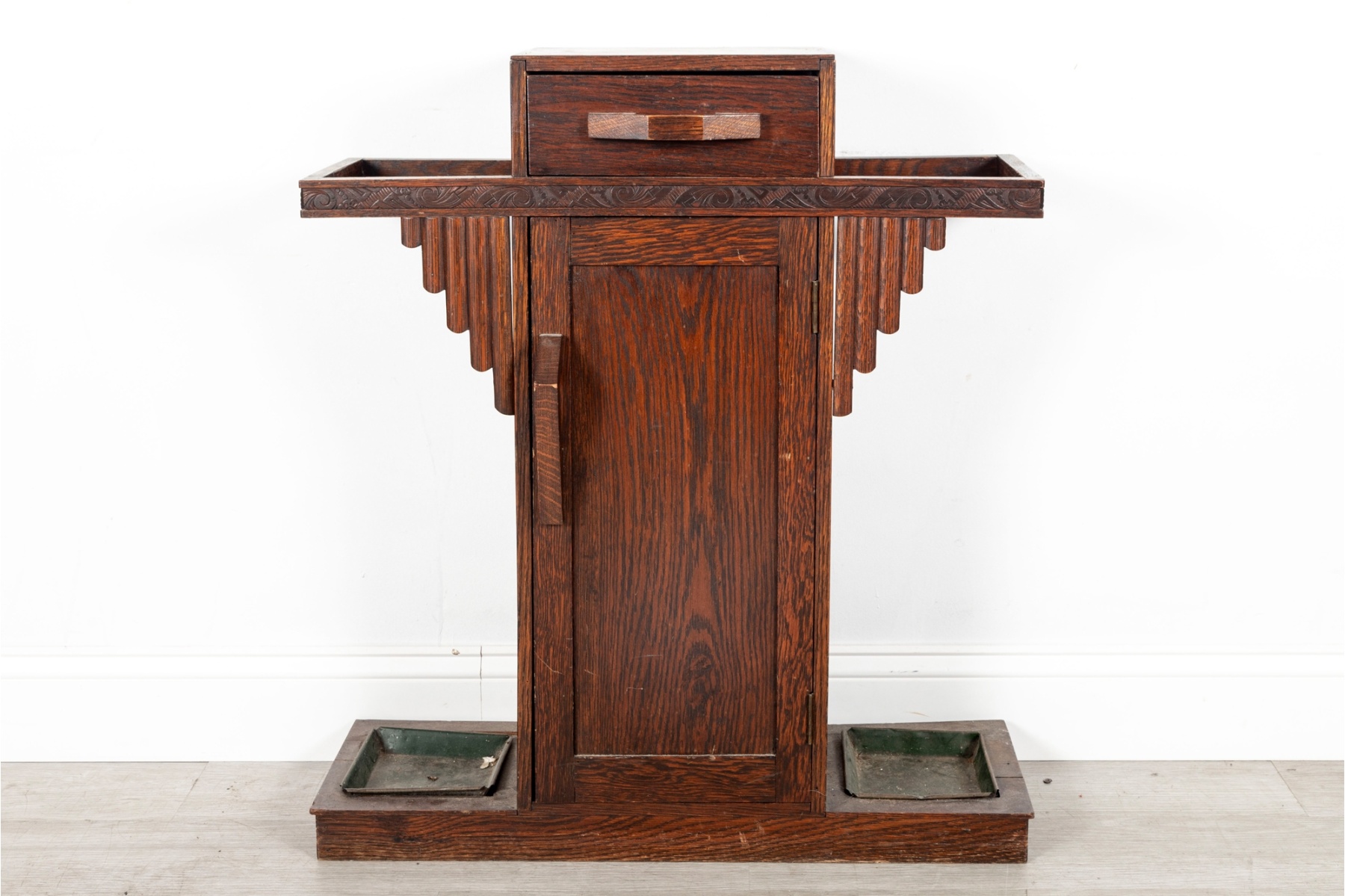 An early 20th-century Arts and Crafts style oak umbrella stand featuring a carved geometric border, central cabinet door, and upper drawer. Extending side trays and inset metal liners to the base. Handsome dark oak finish with linear form and subtle decorative detail.