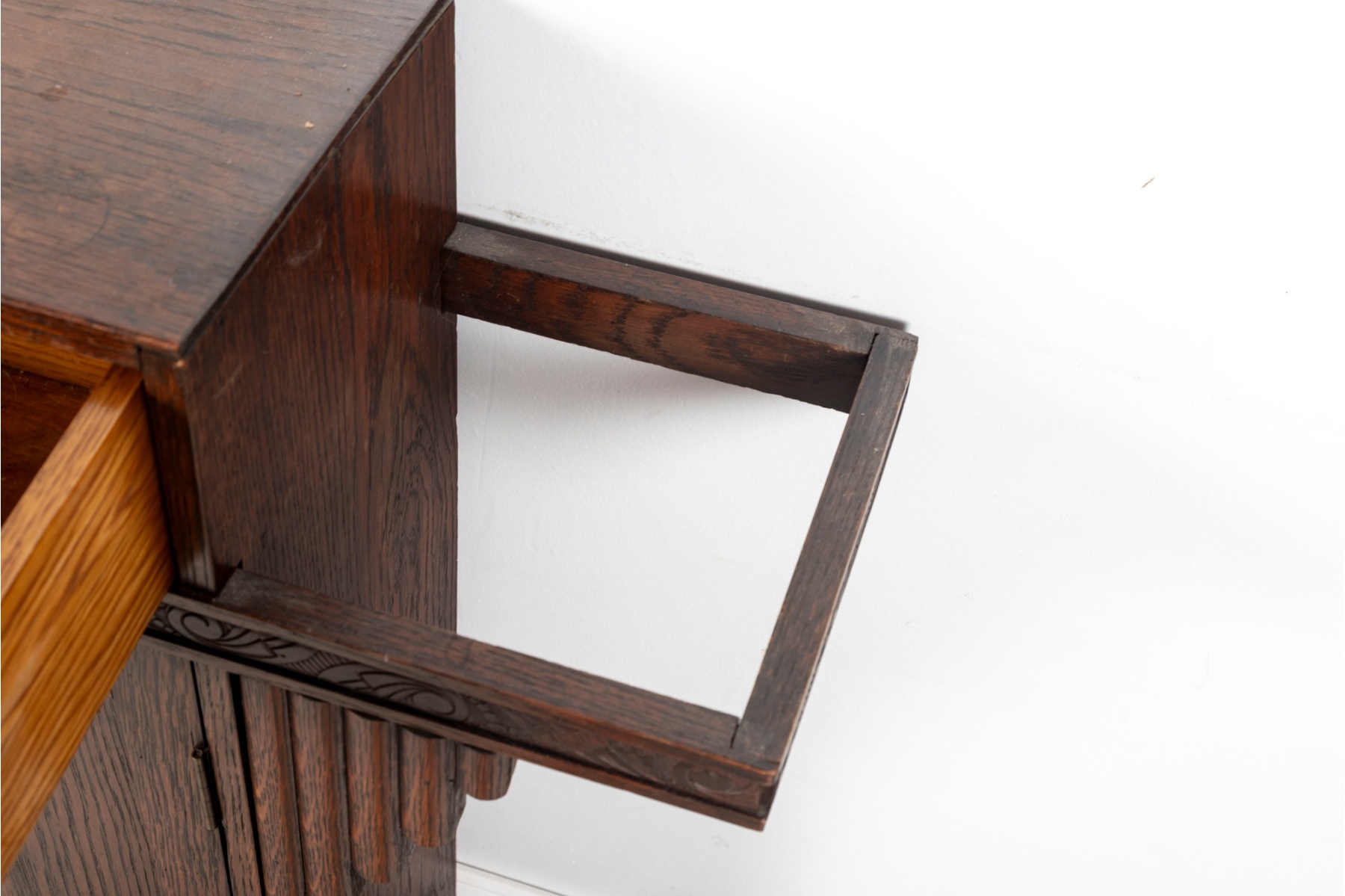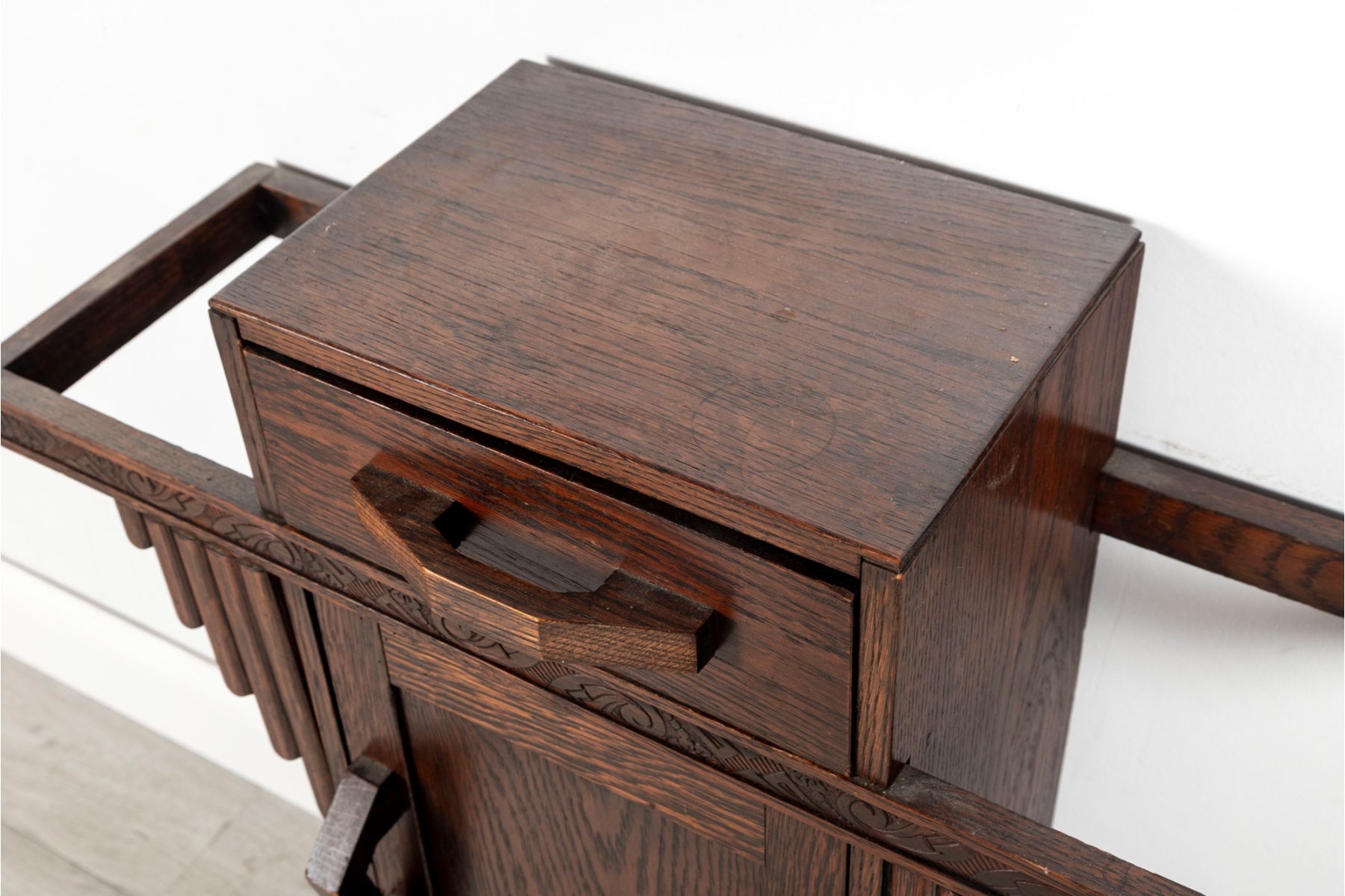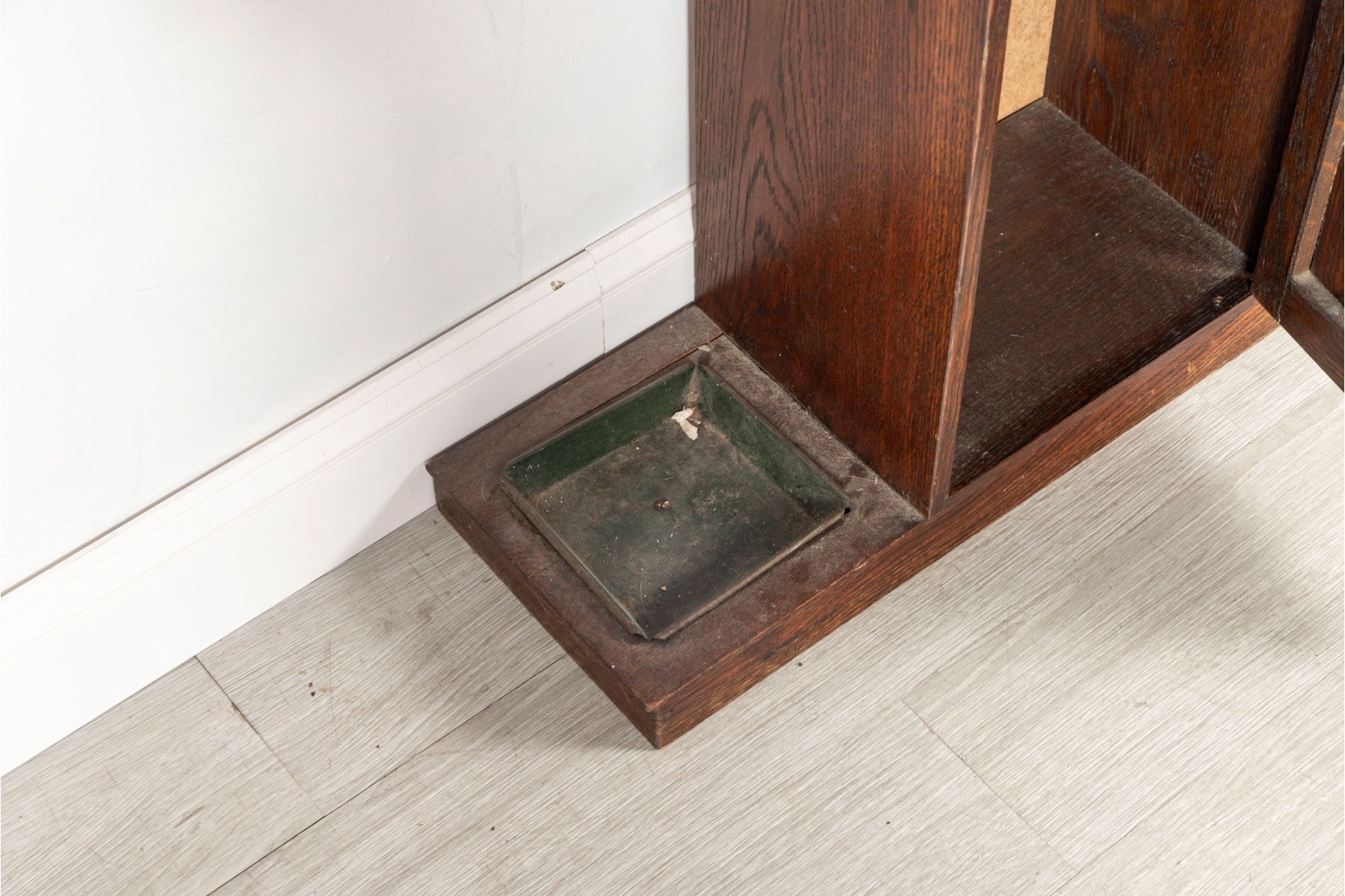 An early 20th-century Arts and Crafts style oak umbrella stand featuring a carved geometric border, central cabinet door, and upper drawer. Extending side trays and inset metal liners to the base. Handsome dark oak finish with linear form and subtle decorative detail.