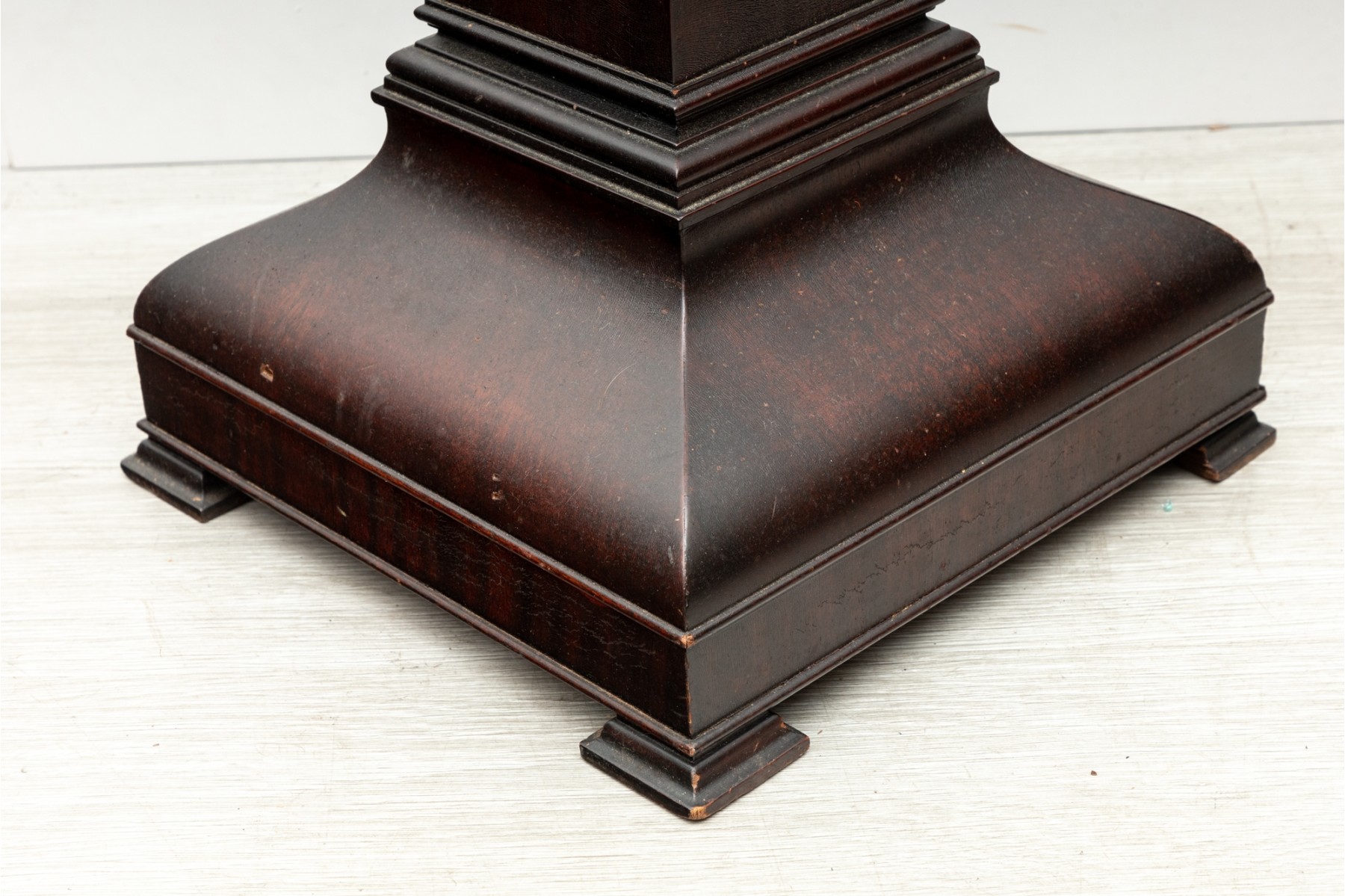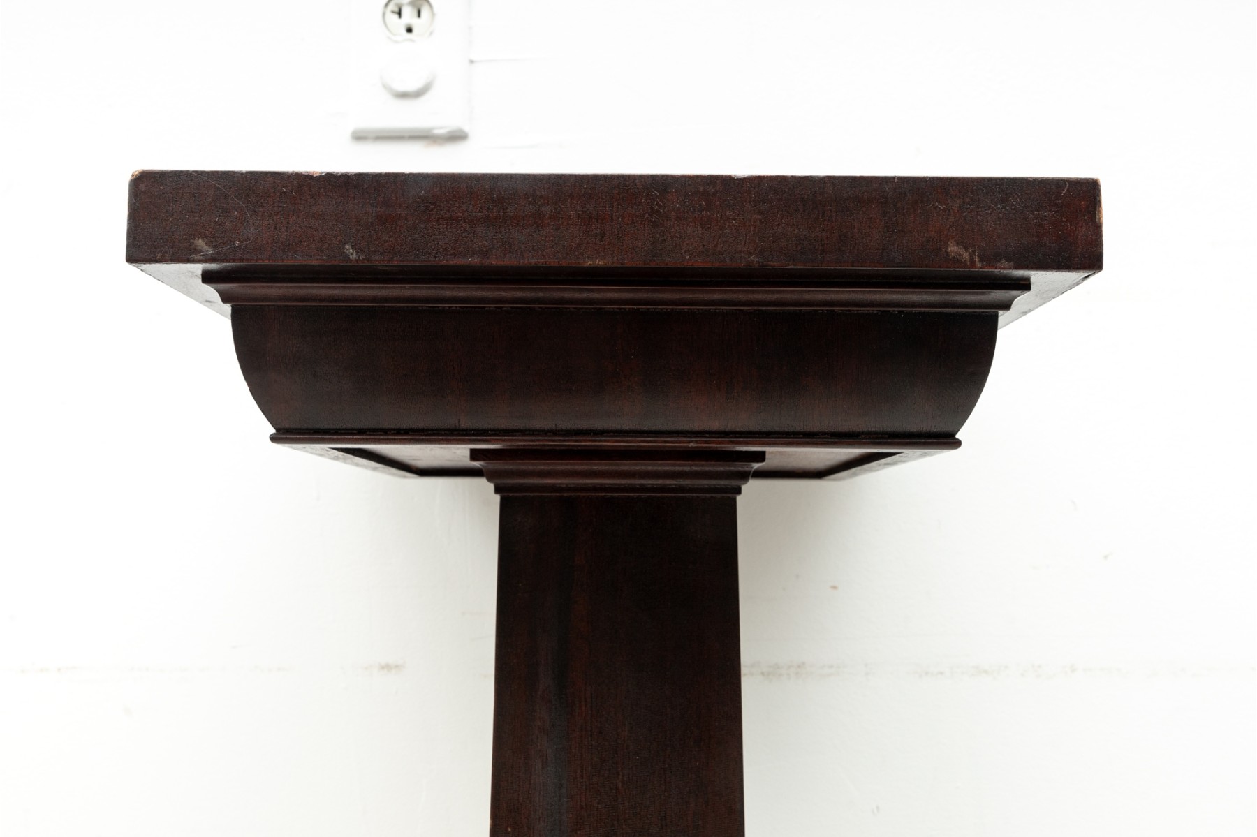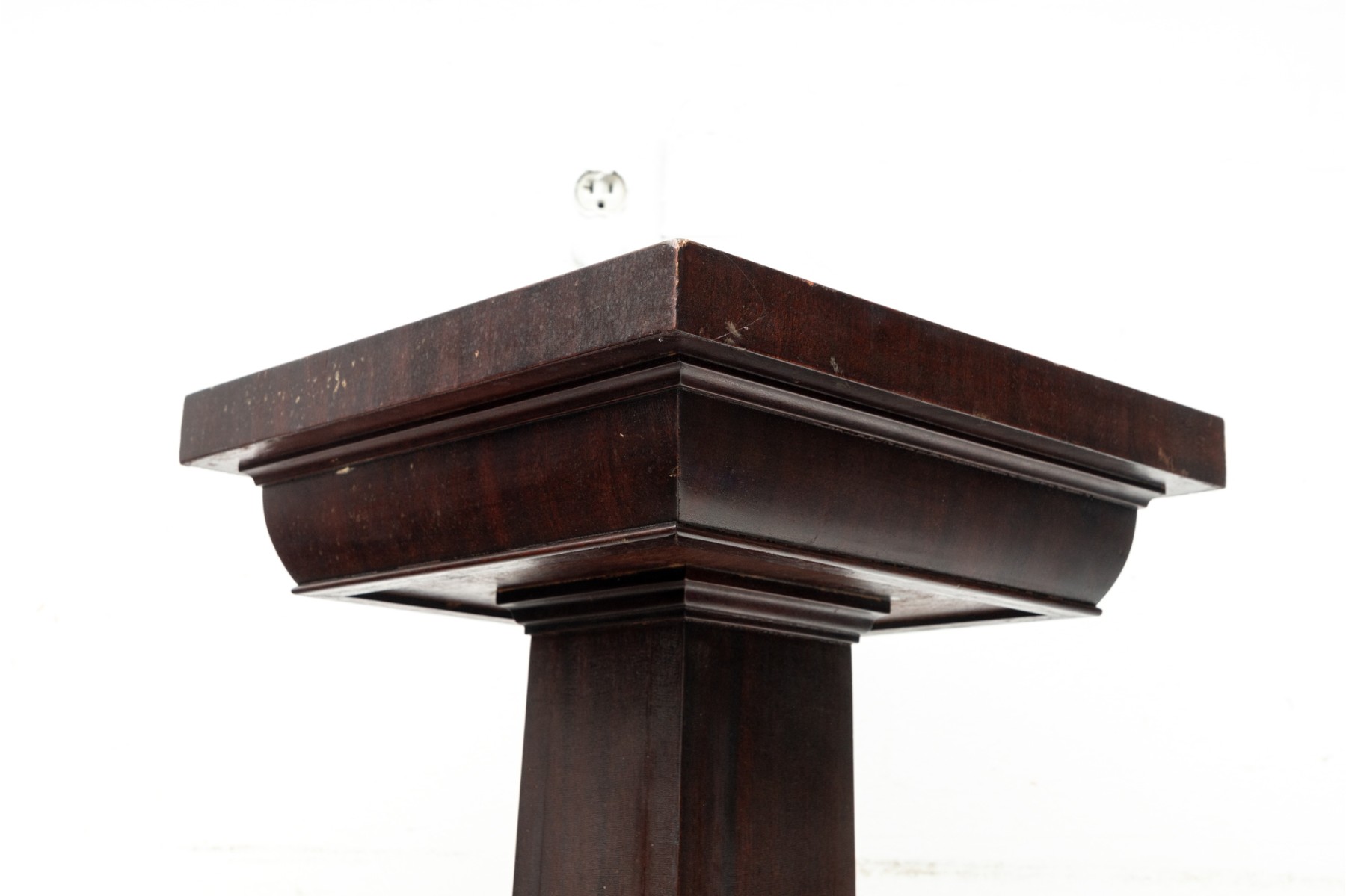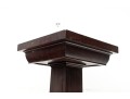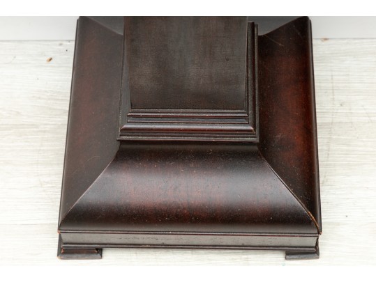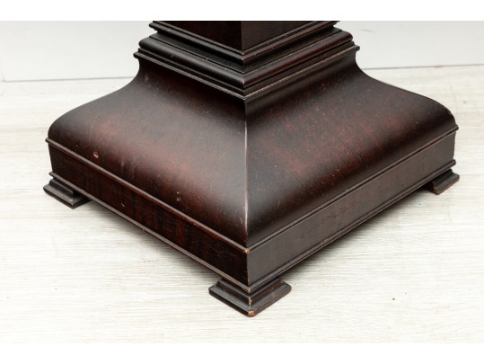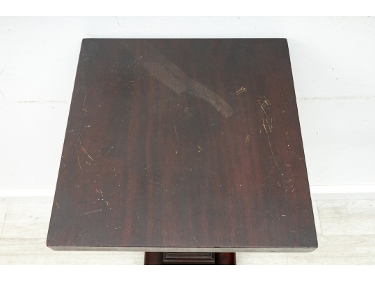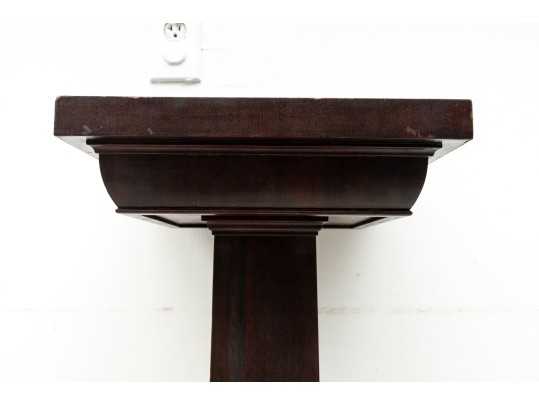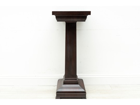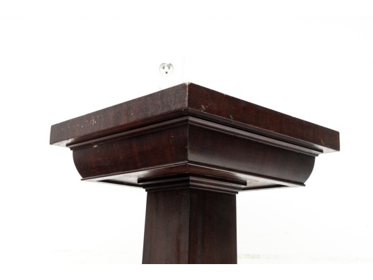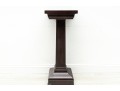 A simple wood art & crafts style pedestal column with dark mahogany veneers and a 14x14" surface area for display purposes.