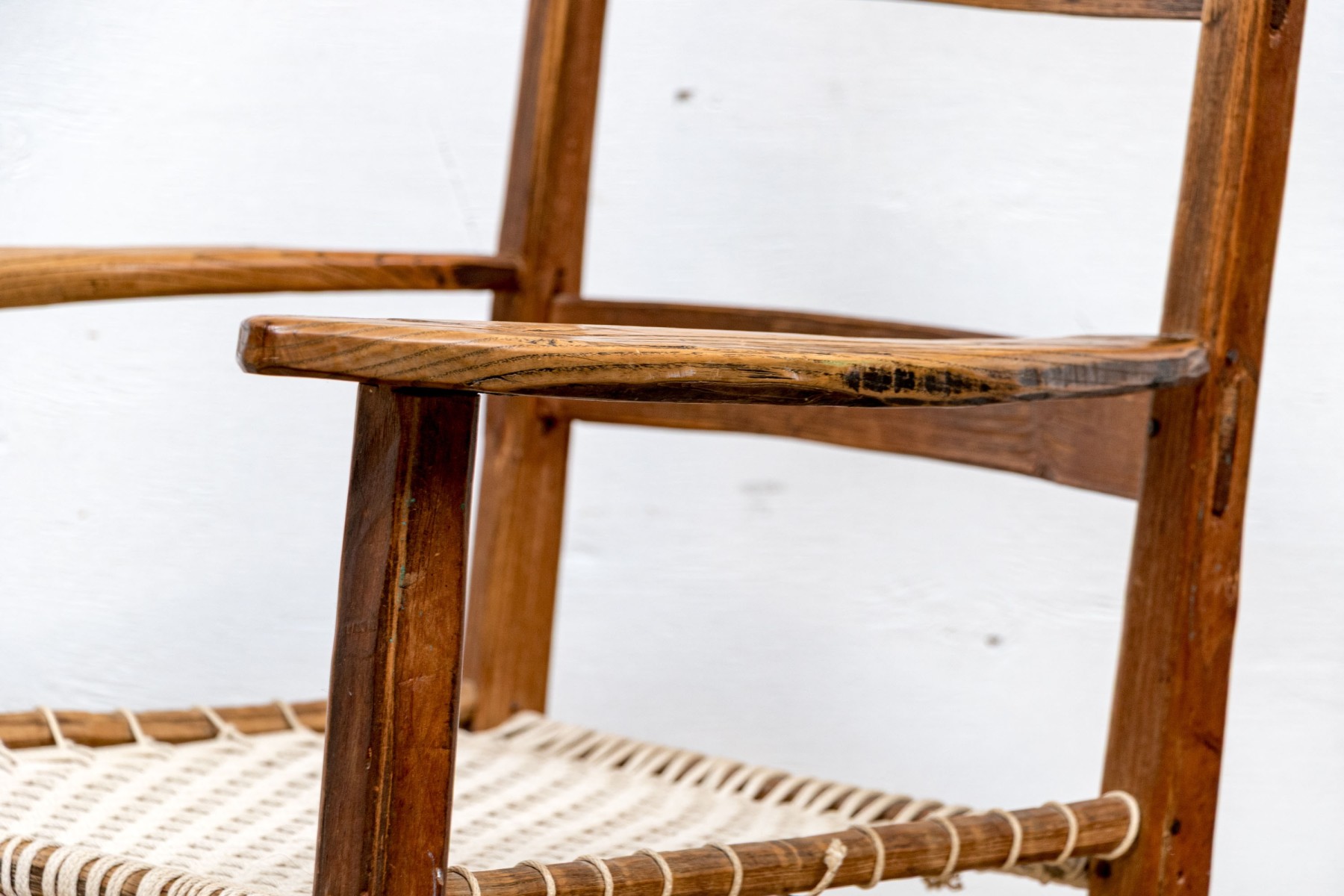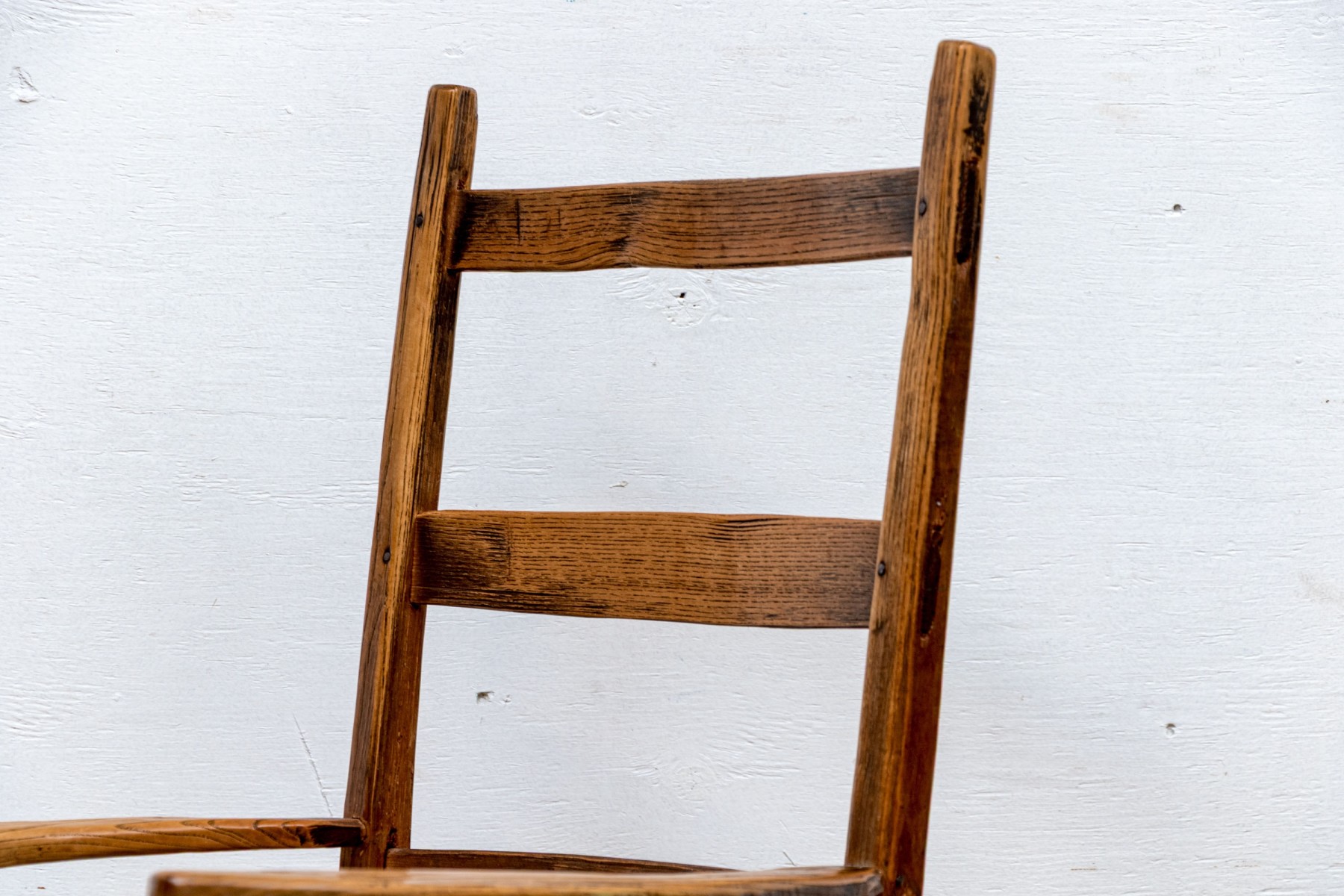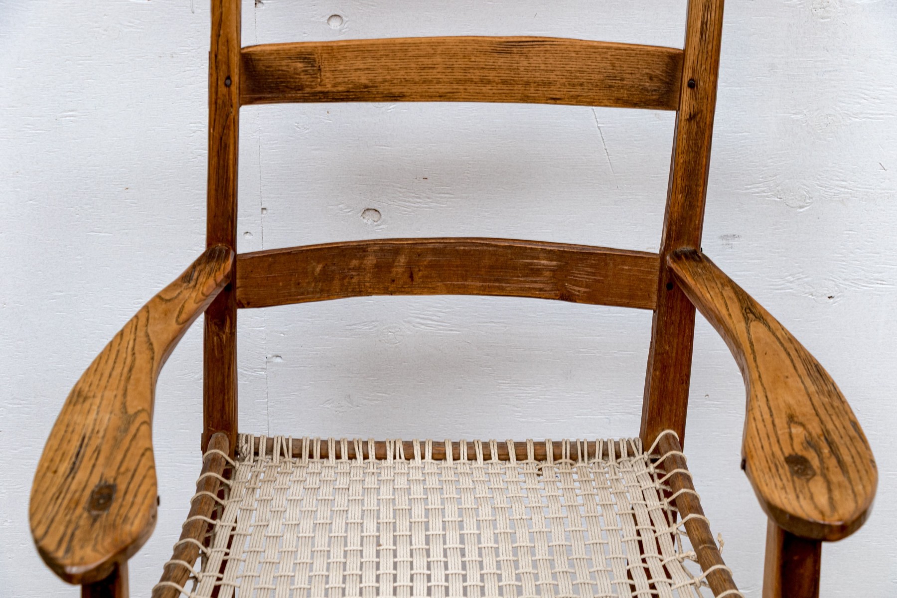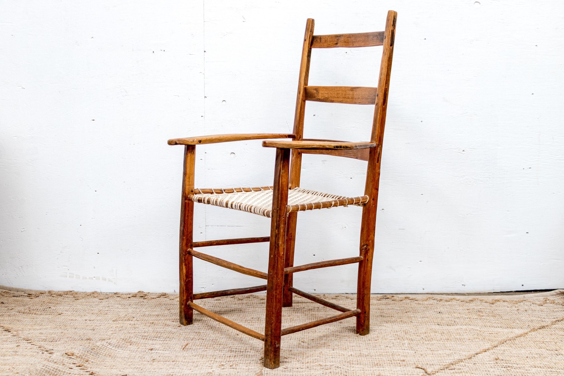 On four squared hand-carved legs with stretcher supports. Two nicely shaped arms with ladder seat back.