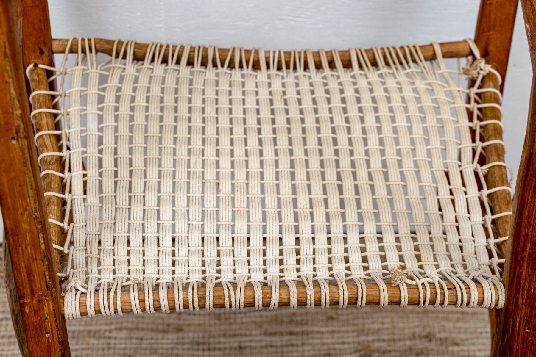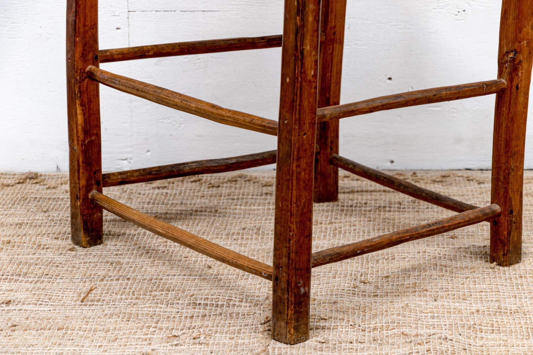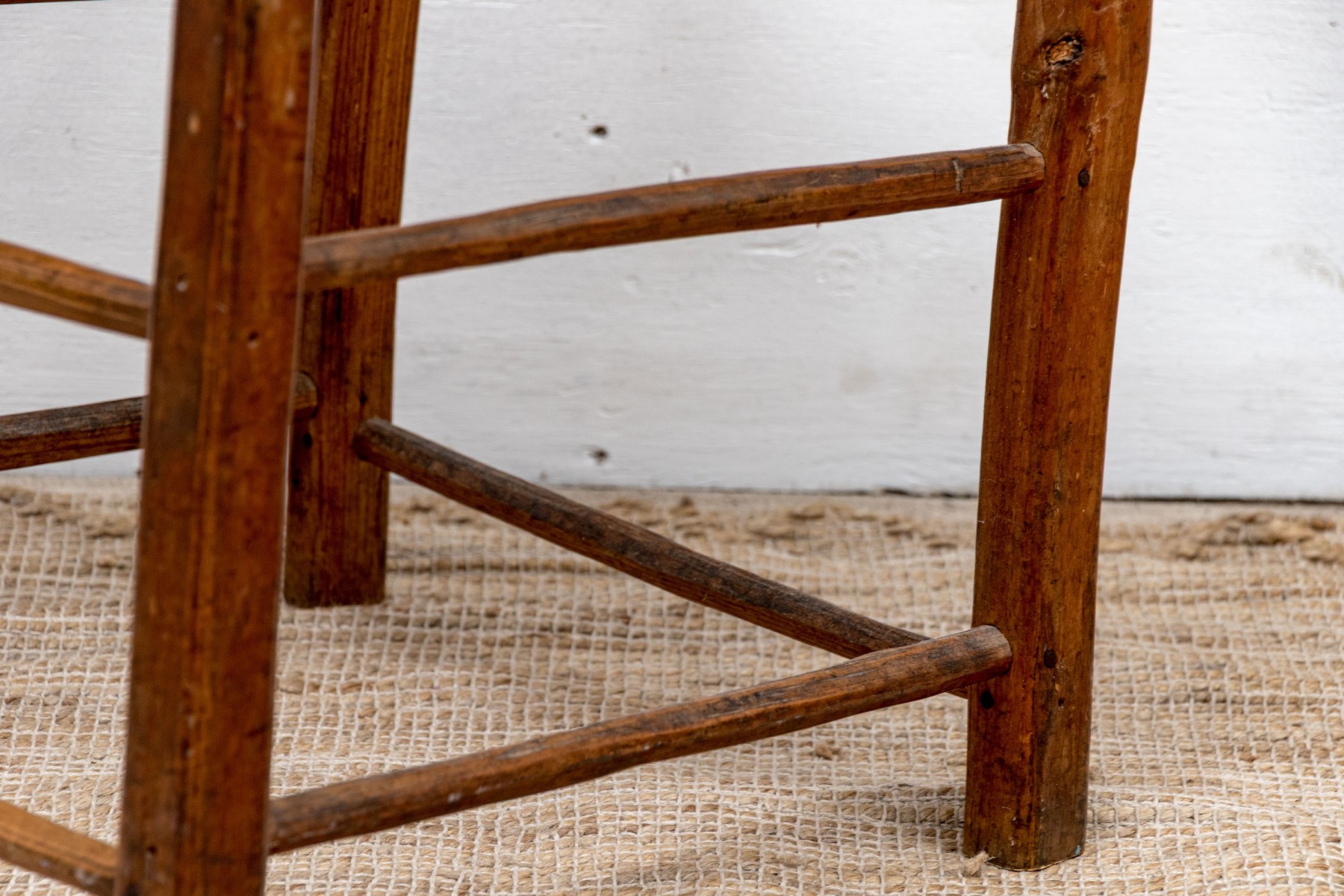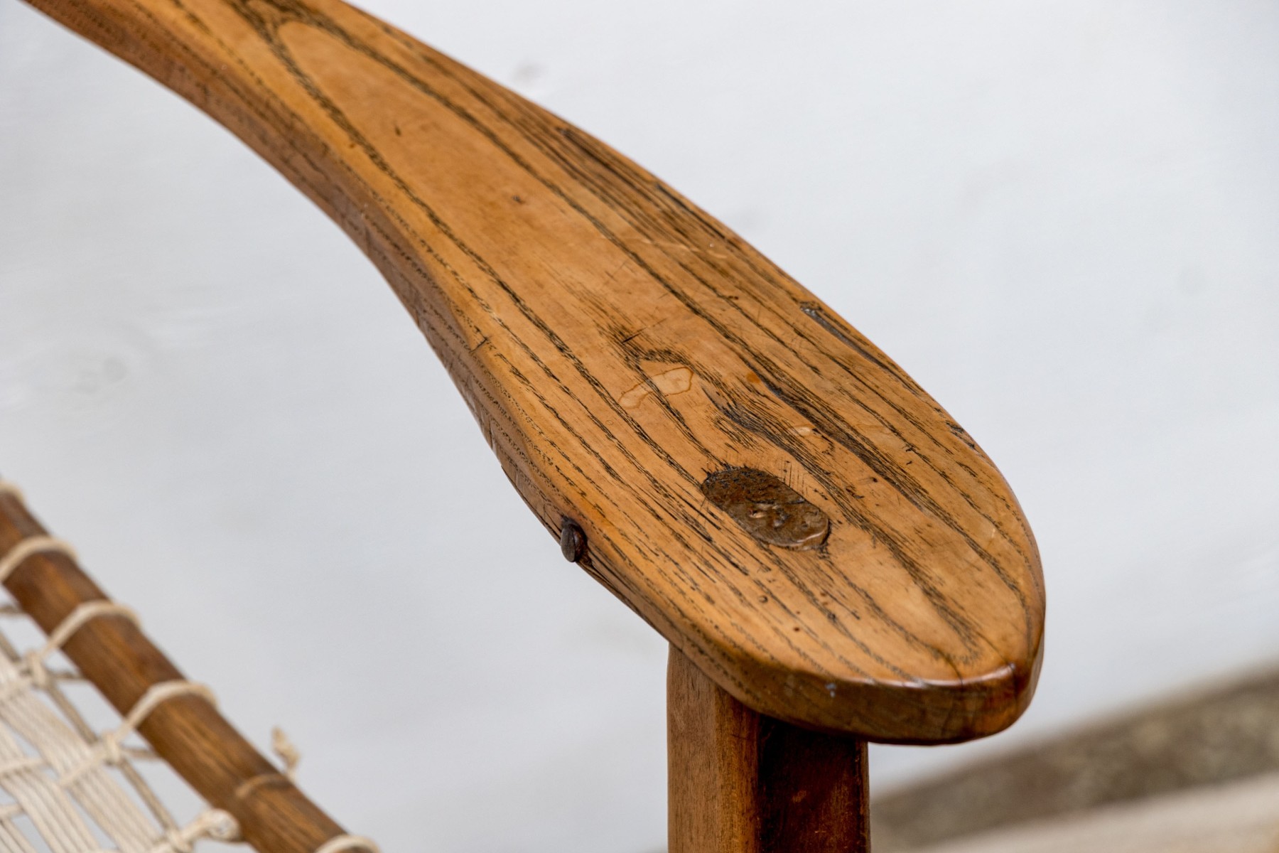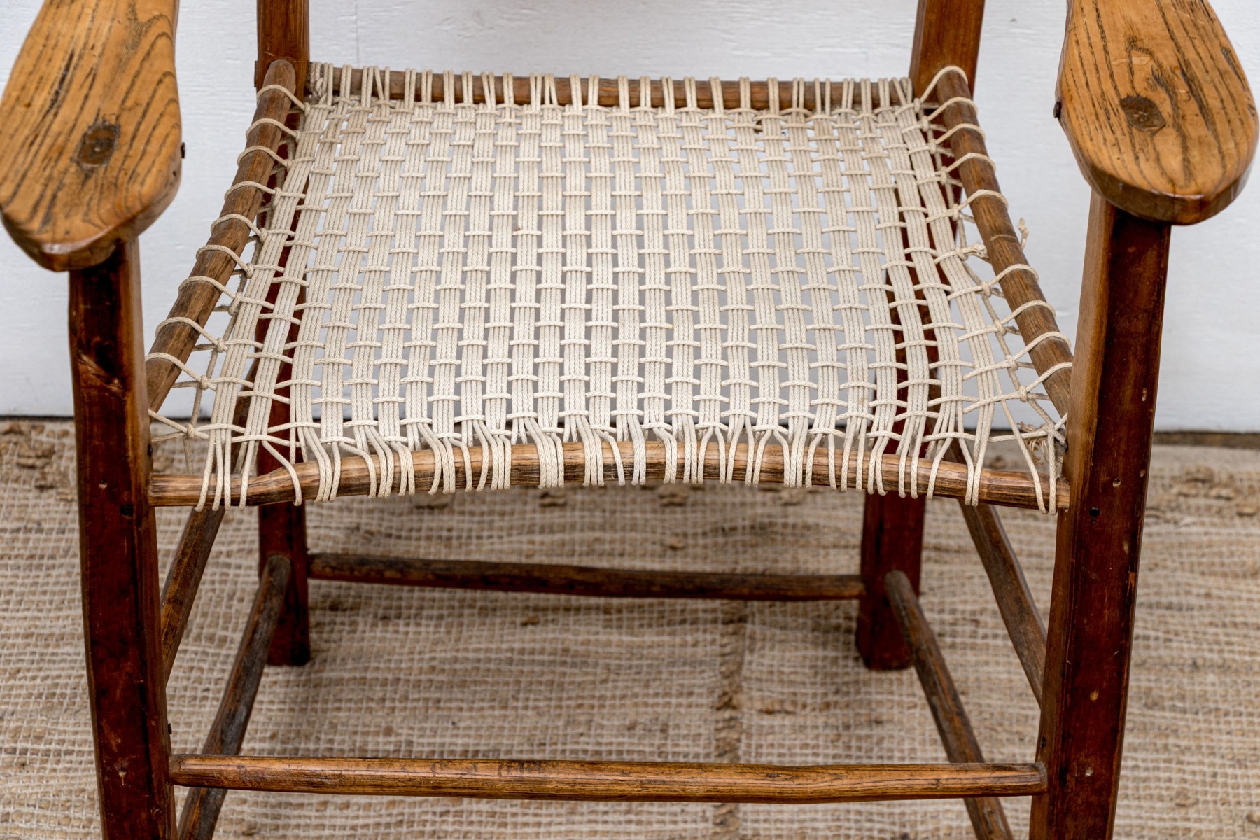 On four squared hand-carved legs with stretcher supports. Two nicely shaped arms with ladder seat back.