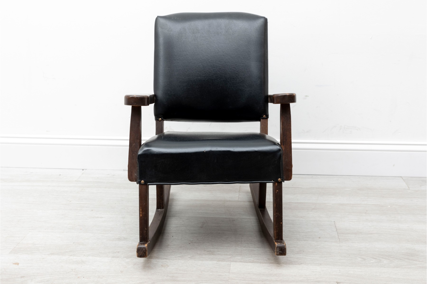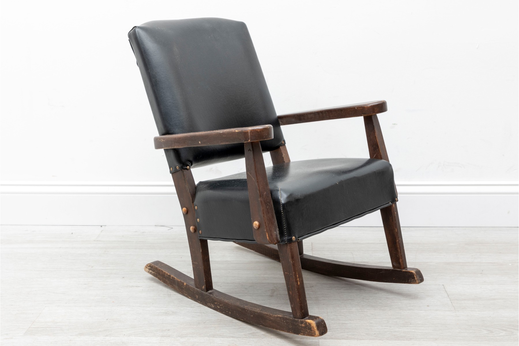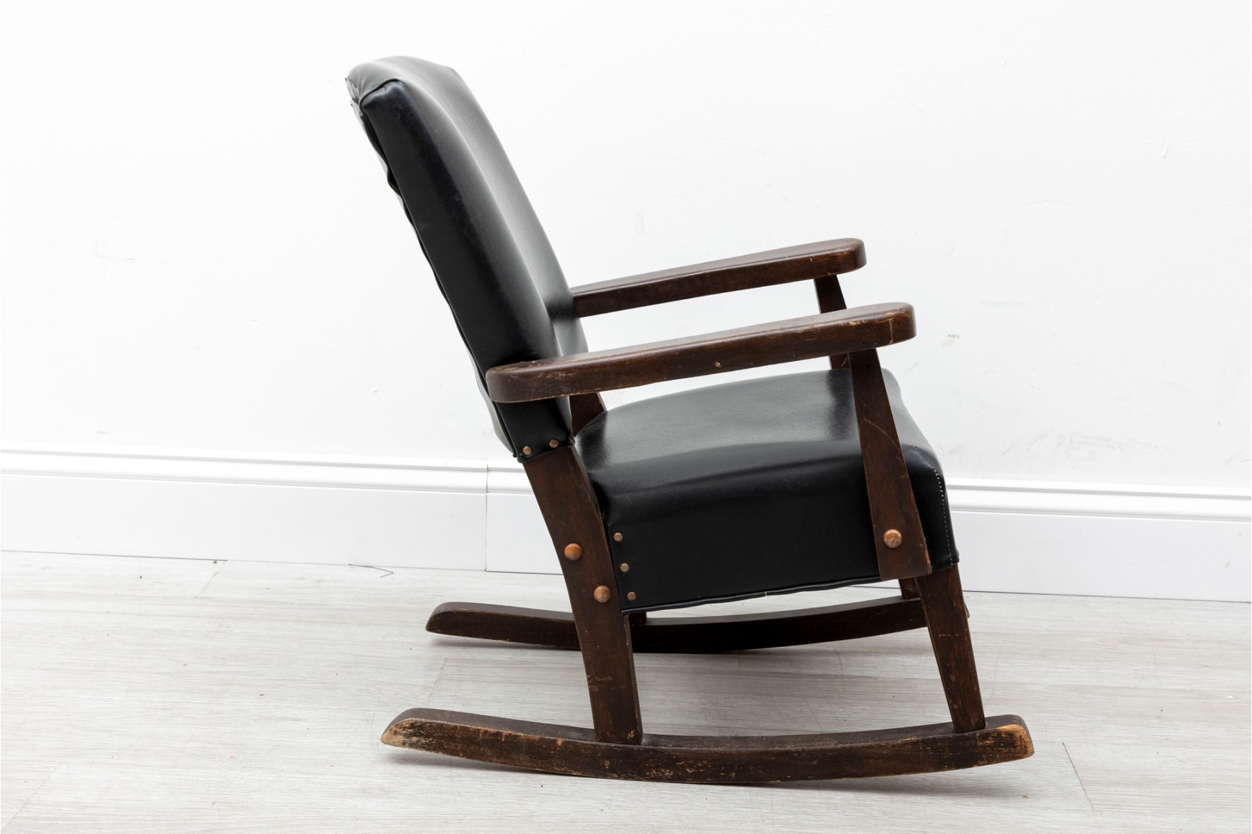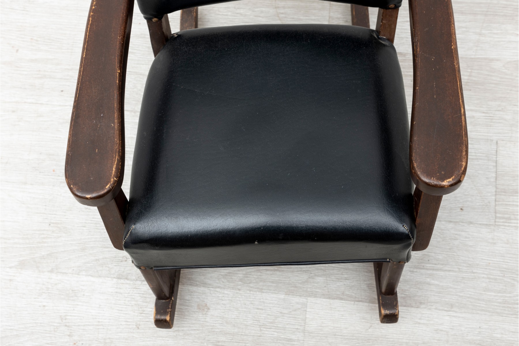 A small childs rocking chair -- Arts & Crafts style, vintage and upholstered in black poly-leather over a wood base.