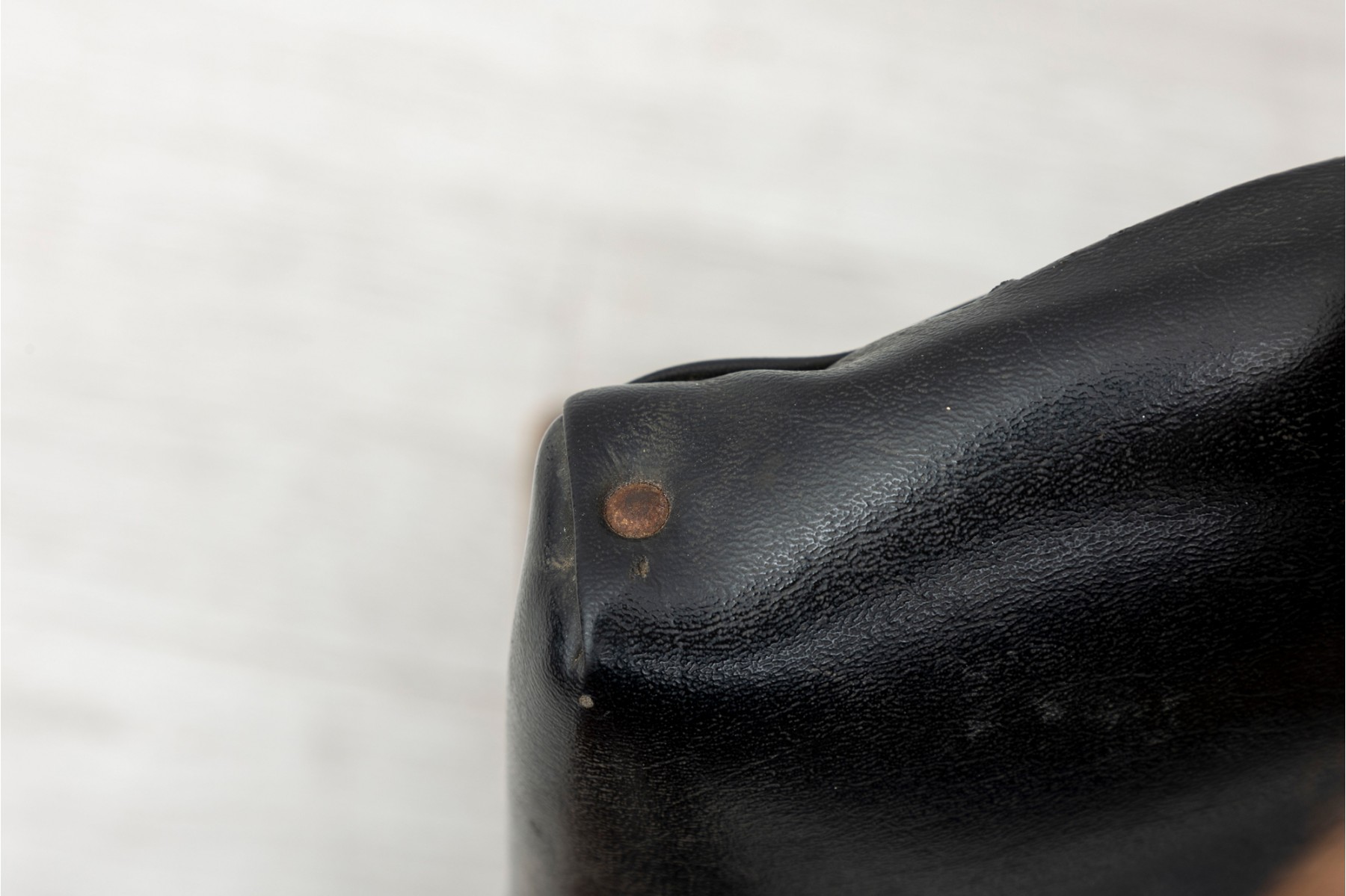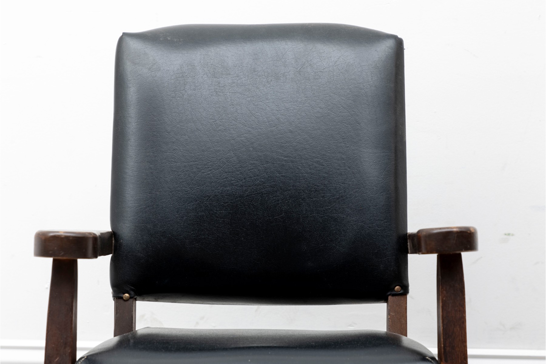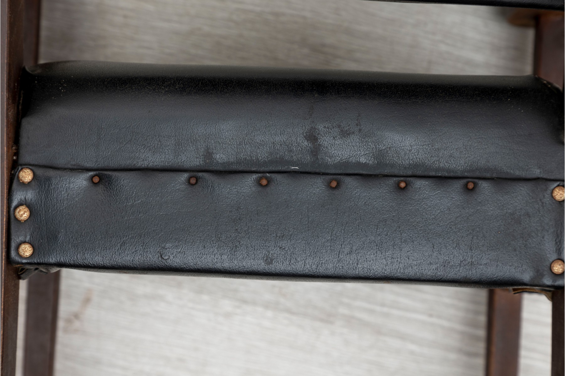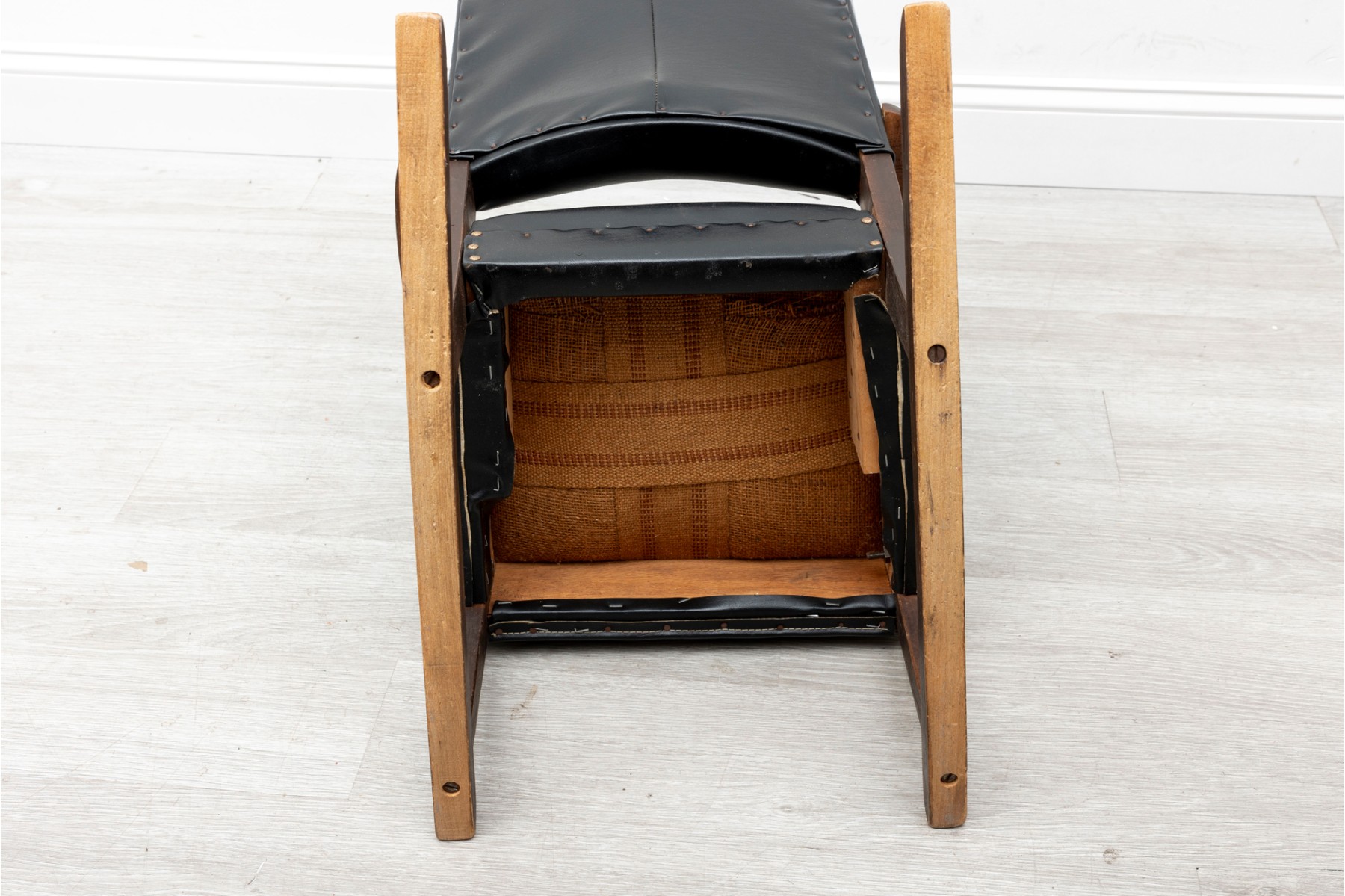 A small childs rocking chair -- Arts & Crafts style, vintage and upholstered in black poly-leather over a wood base.