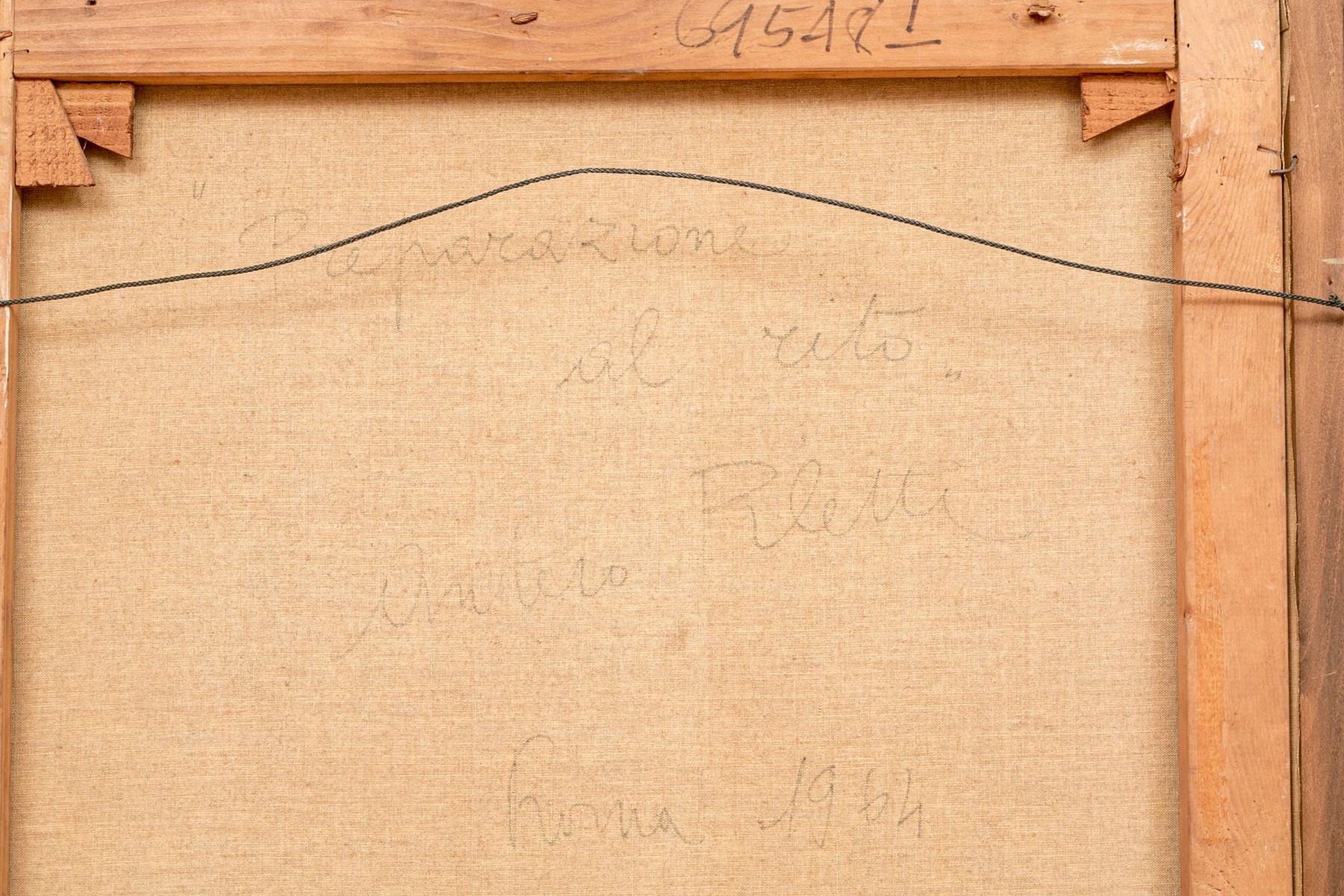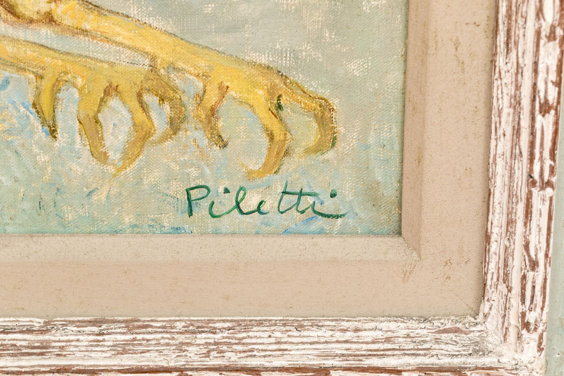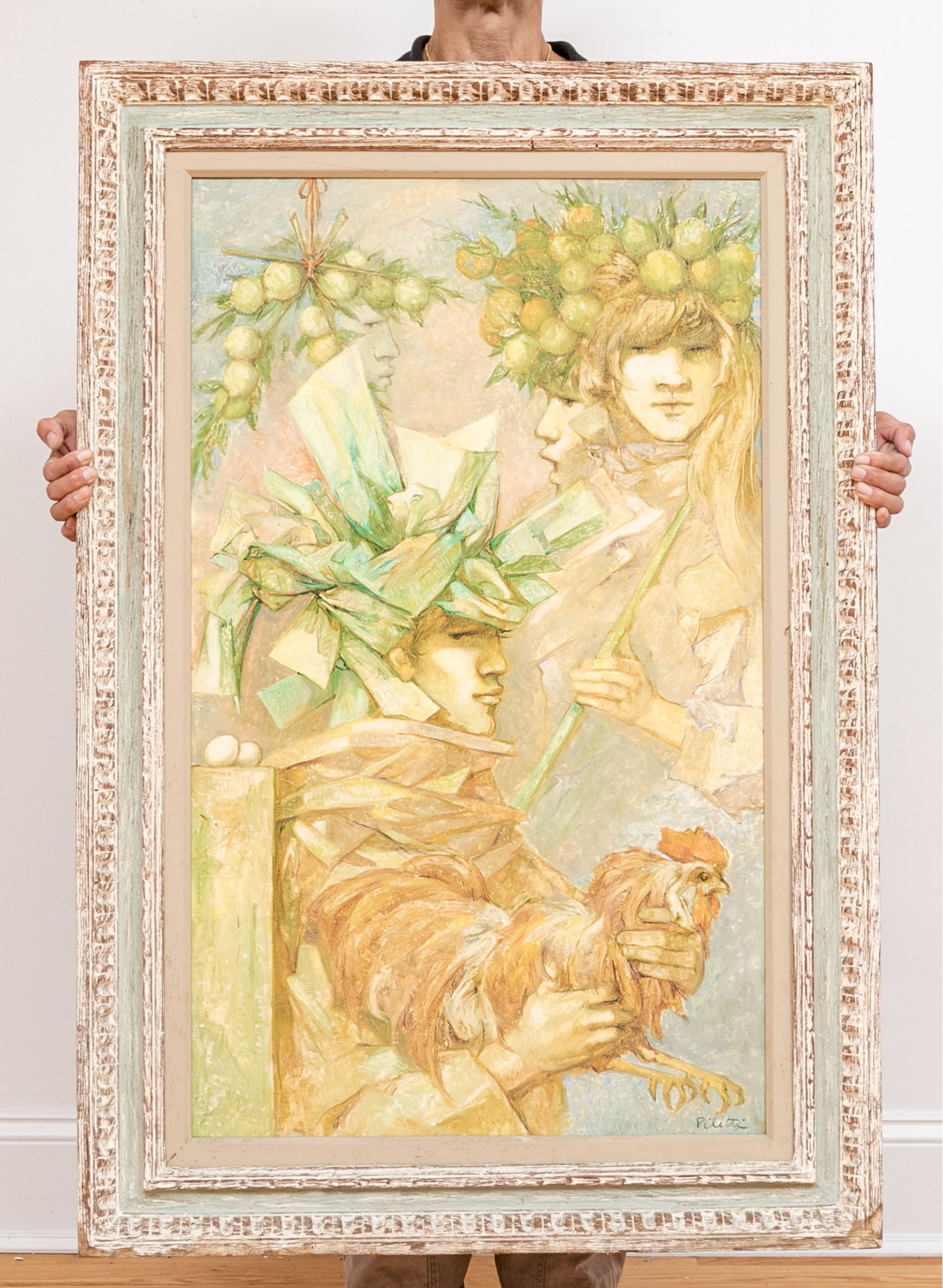 Arturo Piletti (Italian, 1922-1988) oil on canvas featuring four figures wearing headdresses, one holding a flute, and another holding a chicken. The artwork is signed "Piletti" in the lower right corner and is presented in a carved and distressed painted wood frame. Titled in Italian and dated on verso.