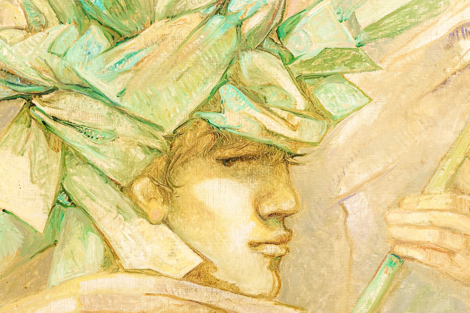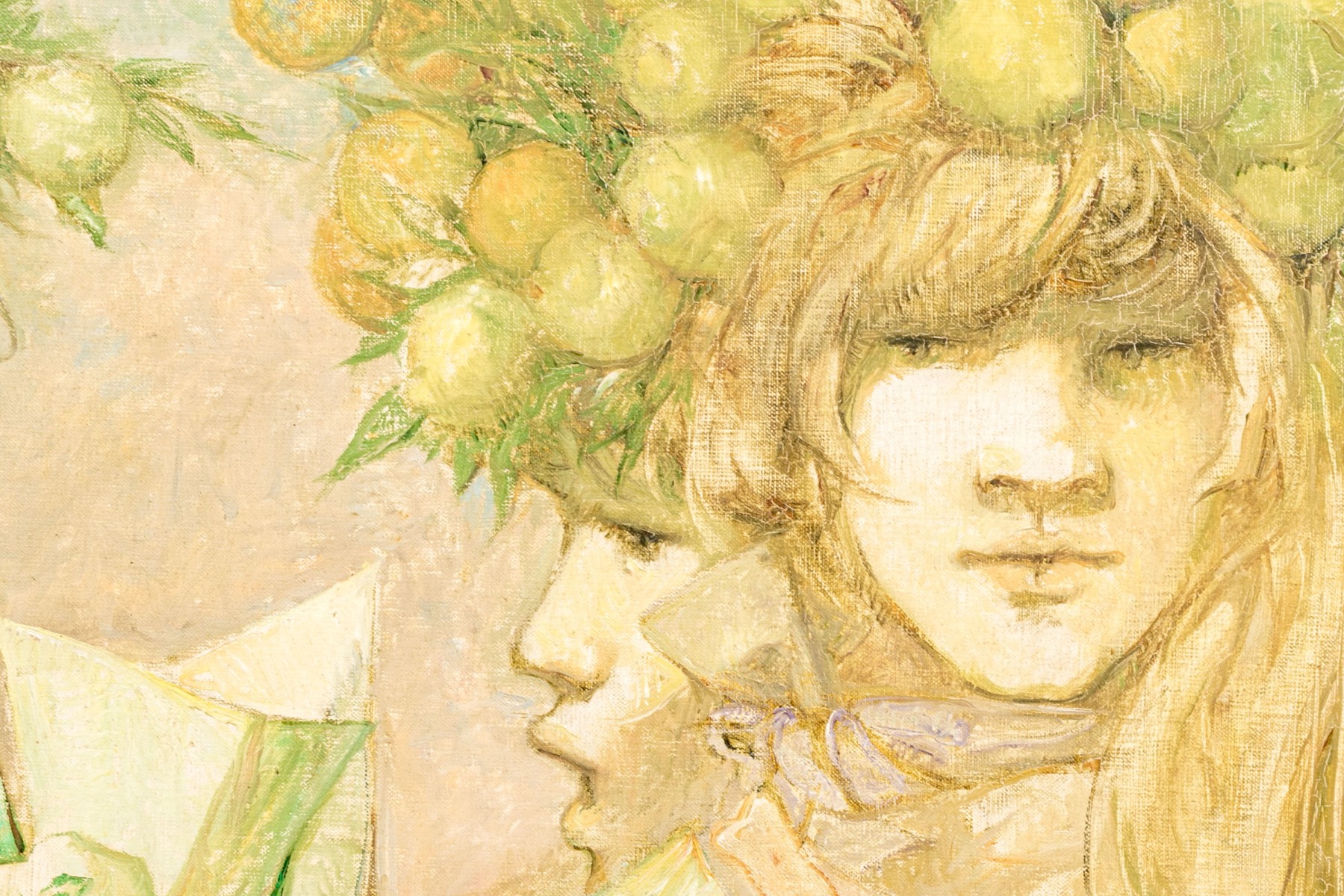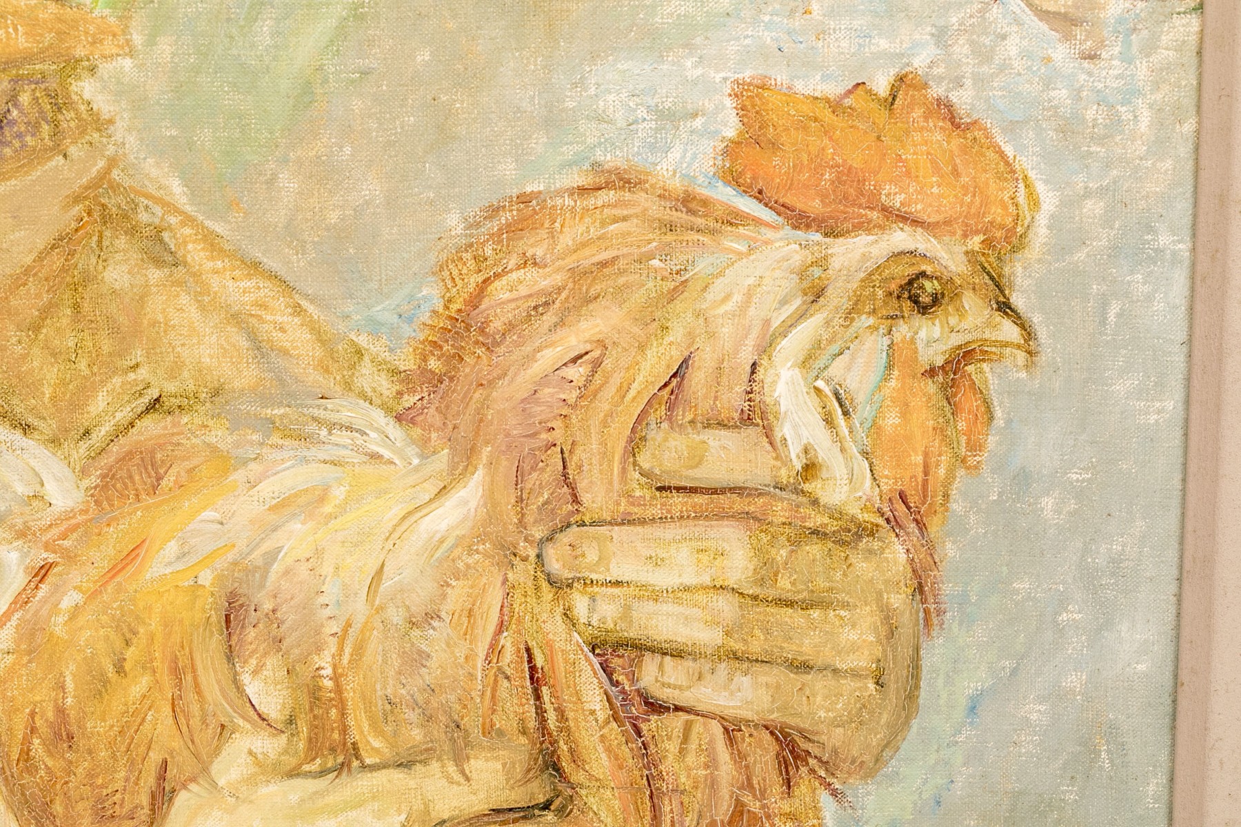 Arturo Piletti (Italian, 1922-1988) oil on canvas featuring four figures wearing headdresses, one holding a flute, and another holding a chicken. The artwork is signed "Piletti" in the lower right corner and is presented in a carved and distressed painted wood frame. Titled in Italian and dated on verso.