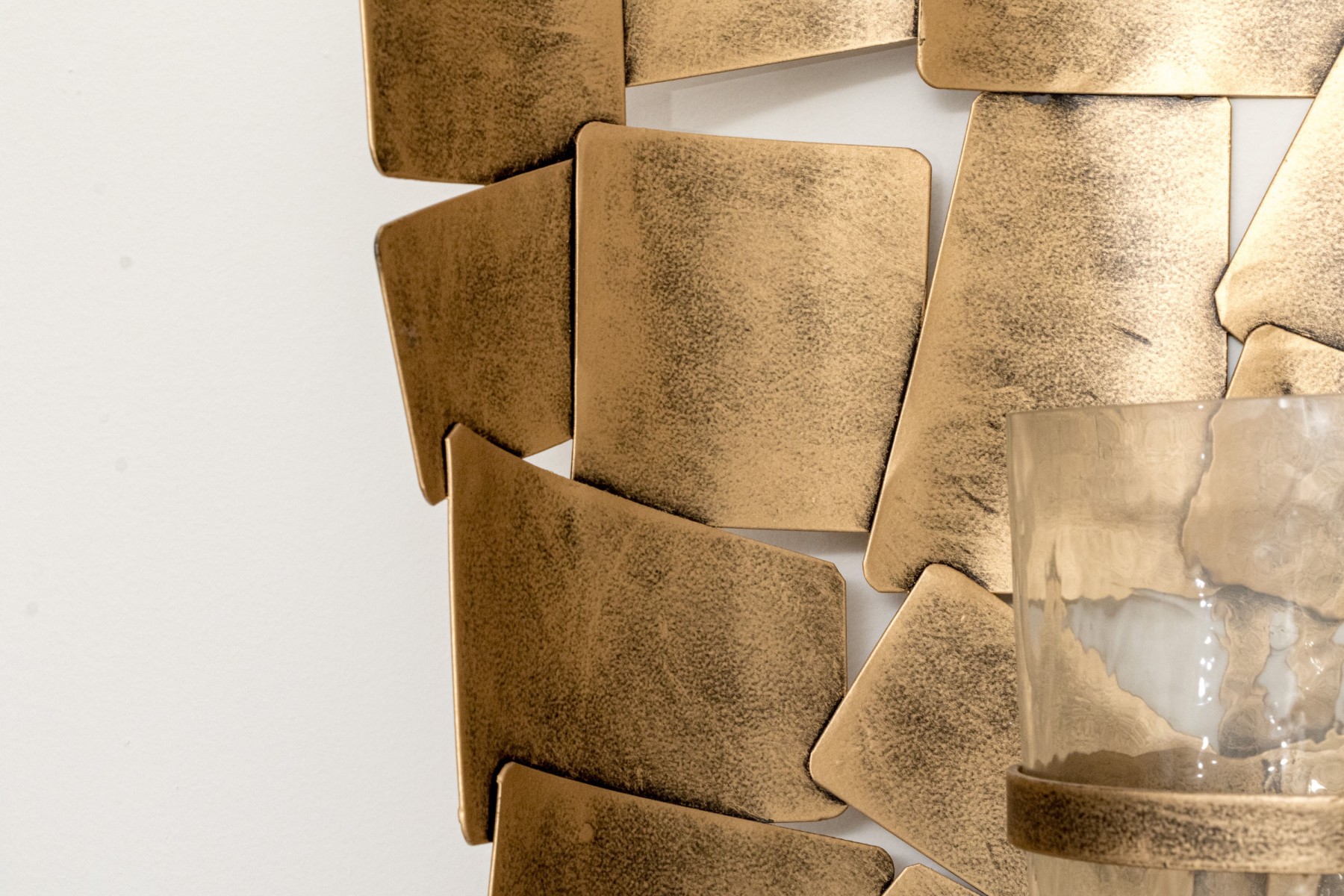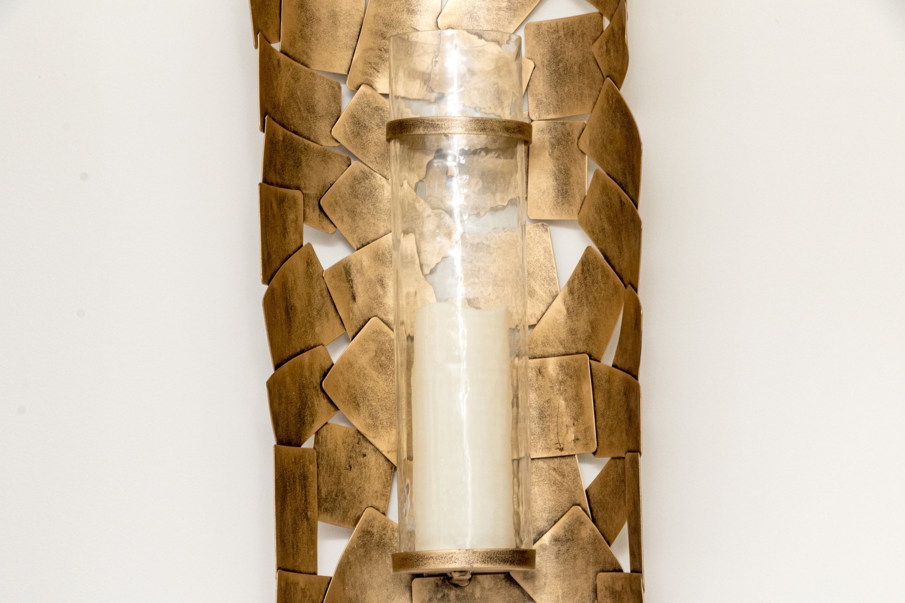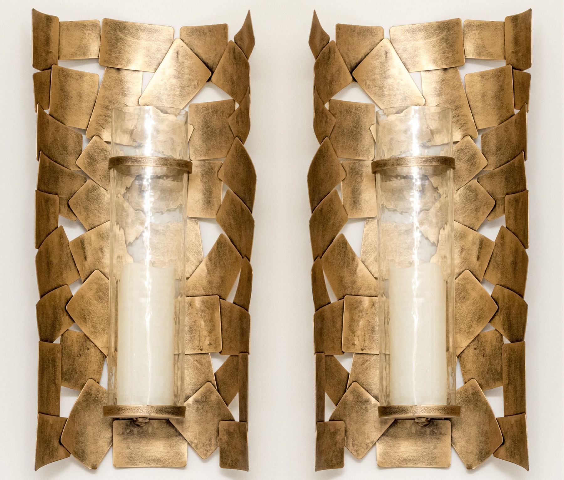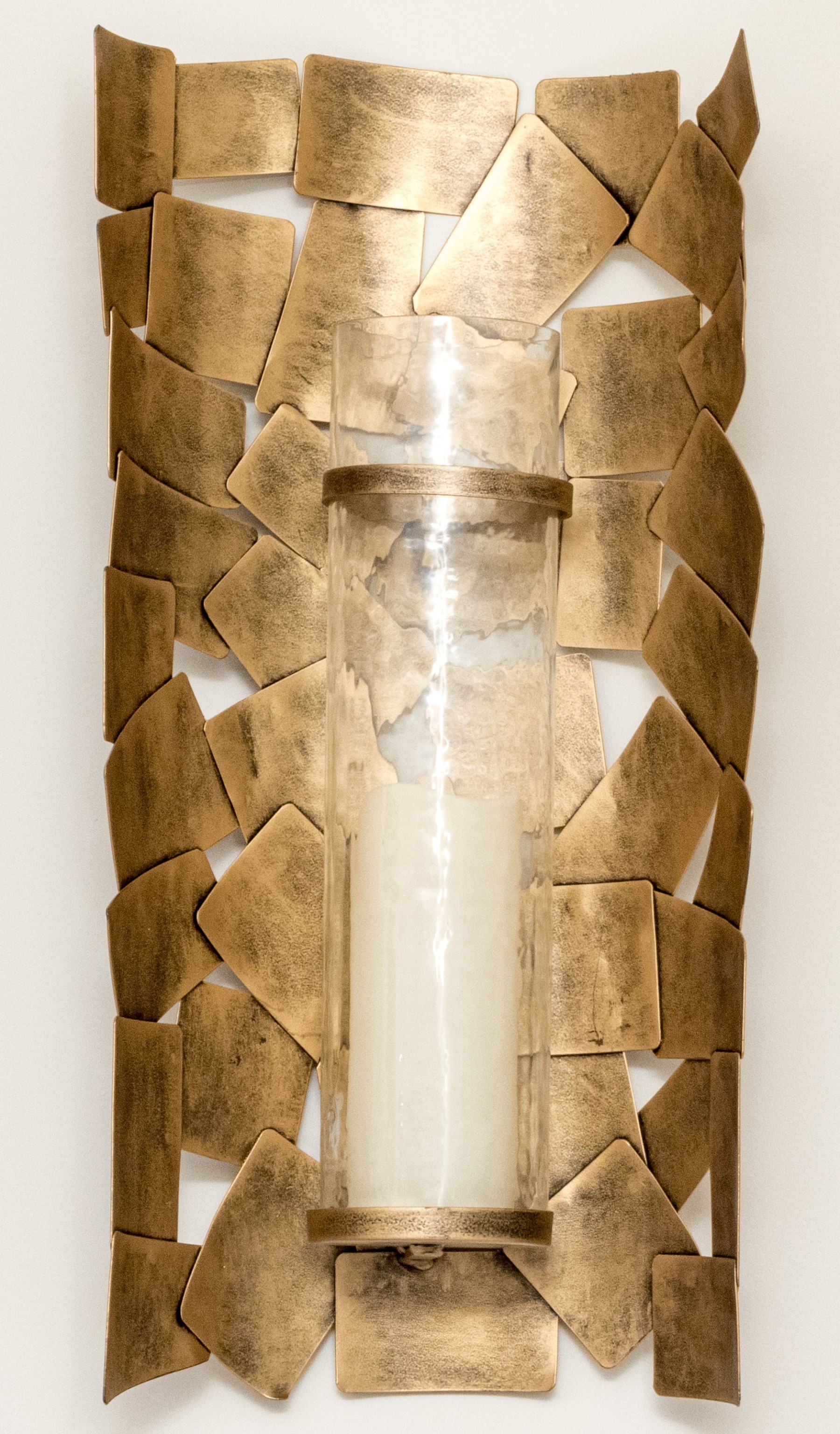 A pair of chic Ashley Furniture "Jailene" wall sconces displaying cylindrical candle and hurricane centers over half-dome arrangements of overlapping brass tone squares.