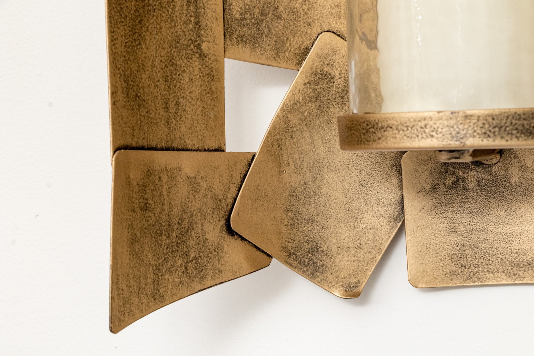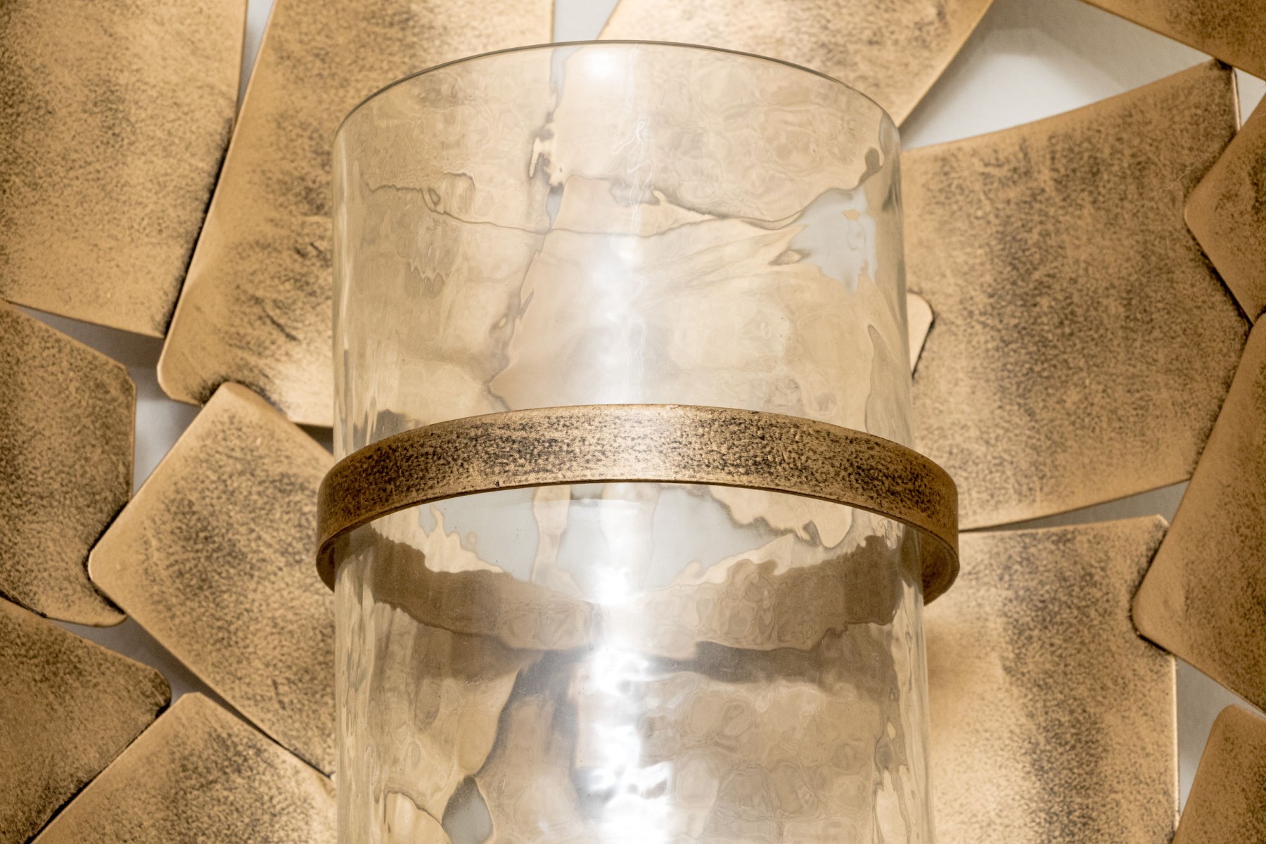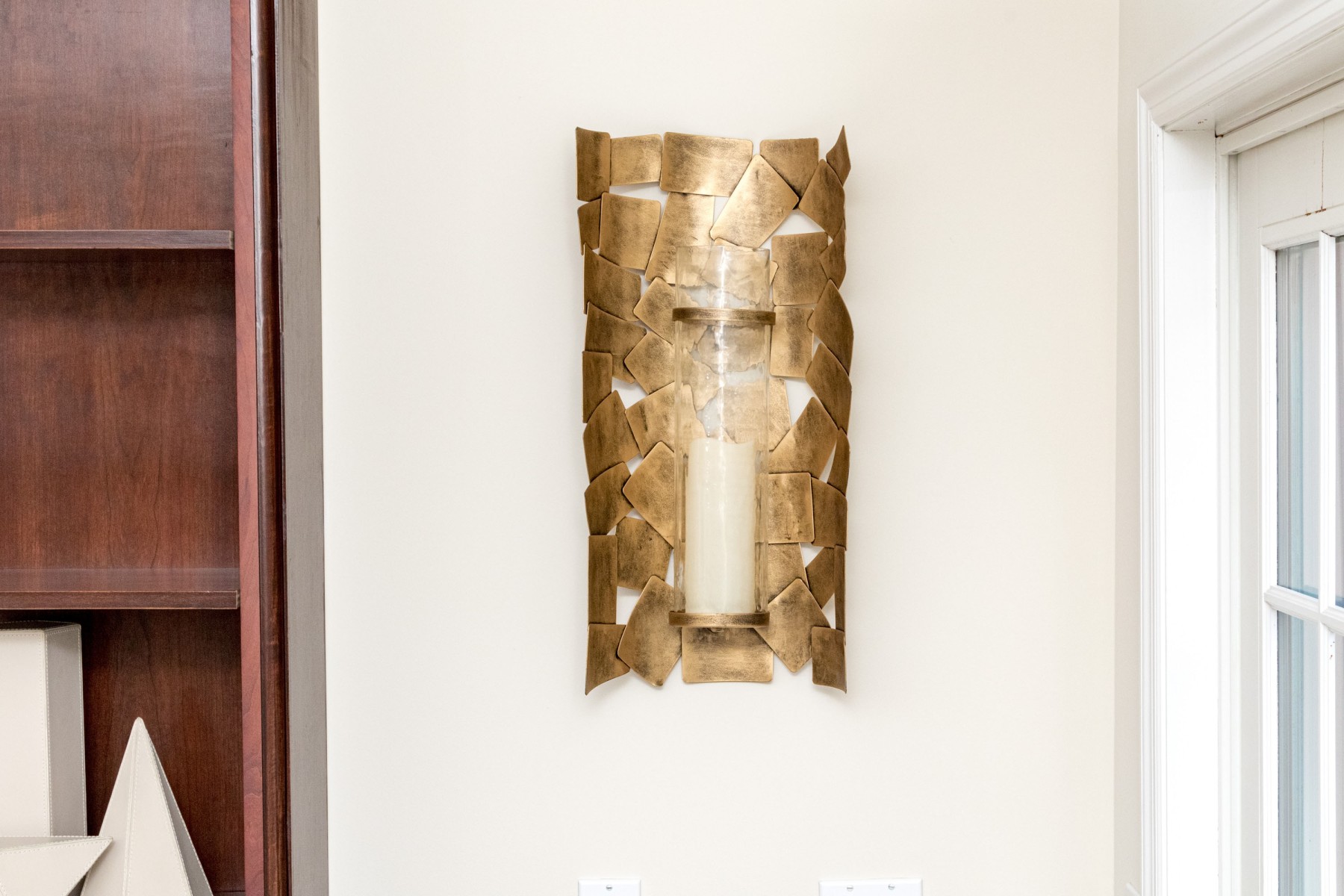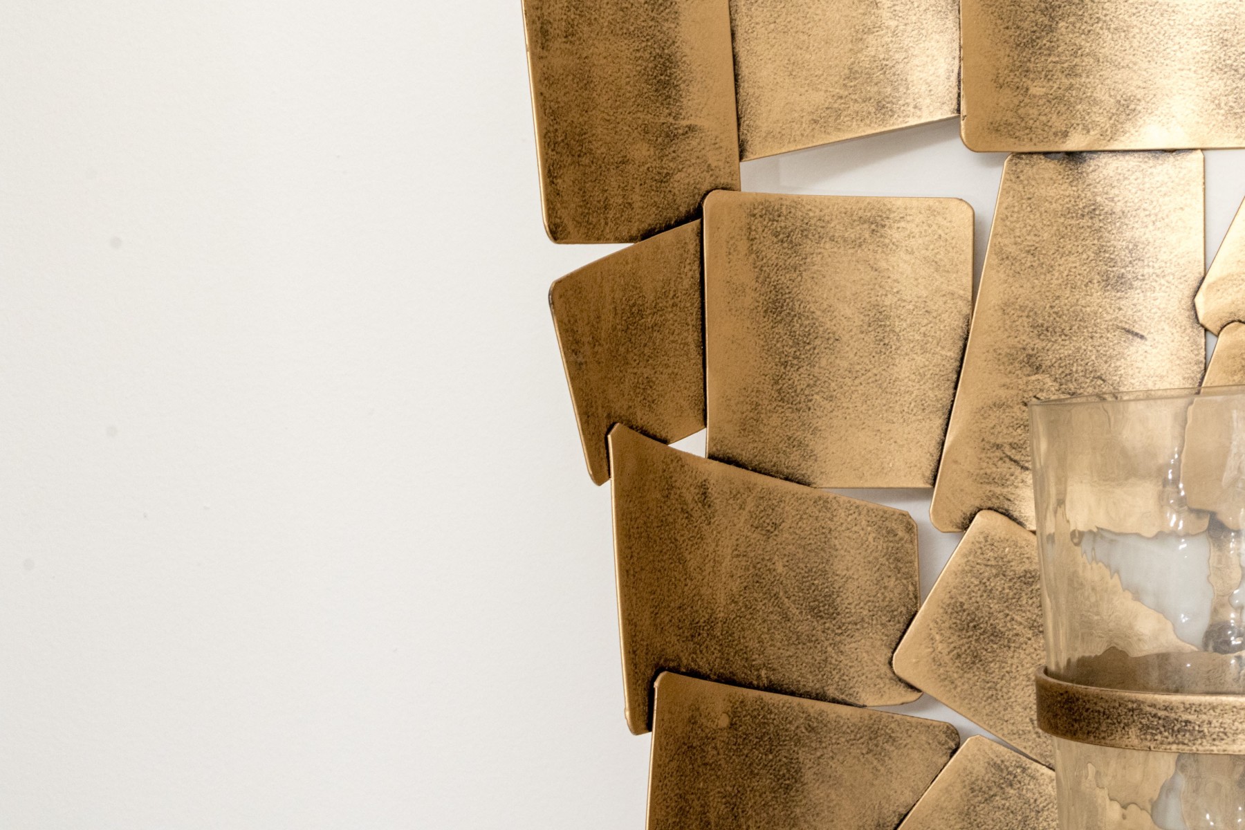 A pair of chic Ashley Furniture "Jailene" wall sconces displaying cylindrical candle and hurricane centers over half-dome arrangements of overlapping brass tone squares.
