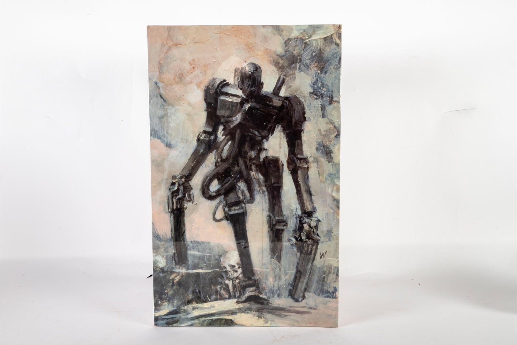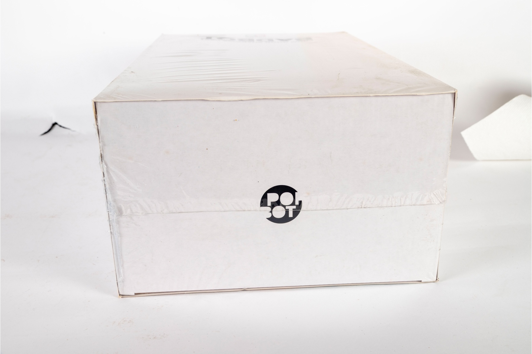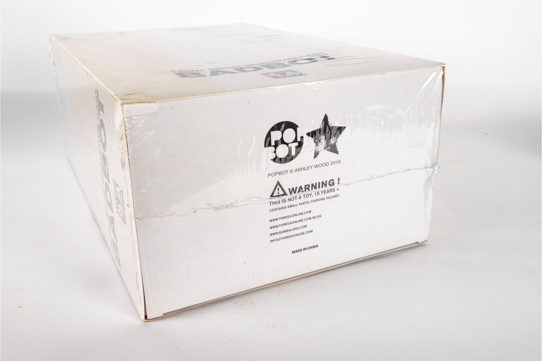 This 1/6 scale Badbot figure is highly detailed and fully articulated, designed with Wood’s distinctive weathered, industrial aesthetic. The packaging features his original concept artwork, making this piece equally desirable to fans of designer art toys and contemporary pop culture collectibles. Stock photo of figure included.
