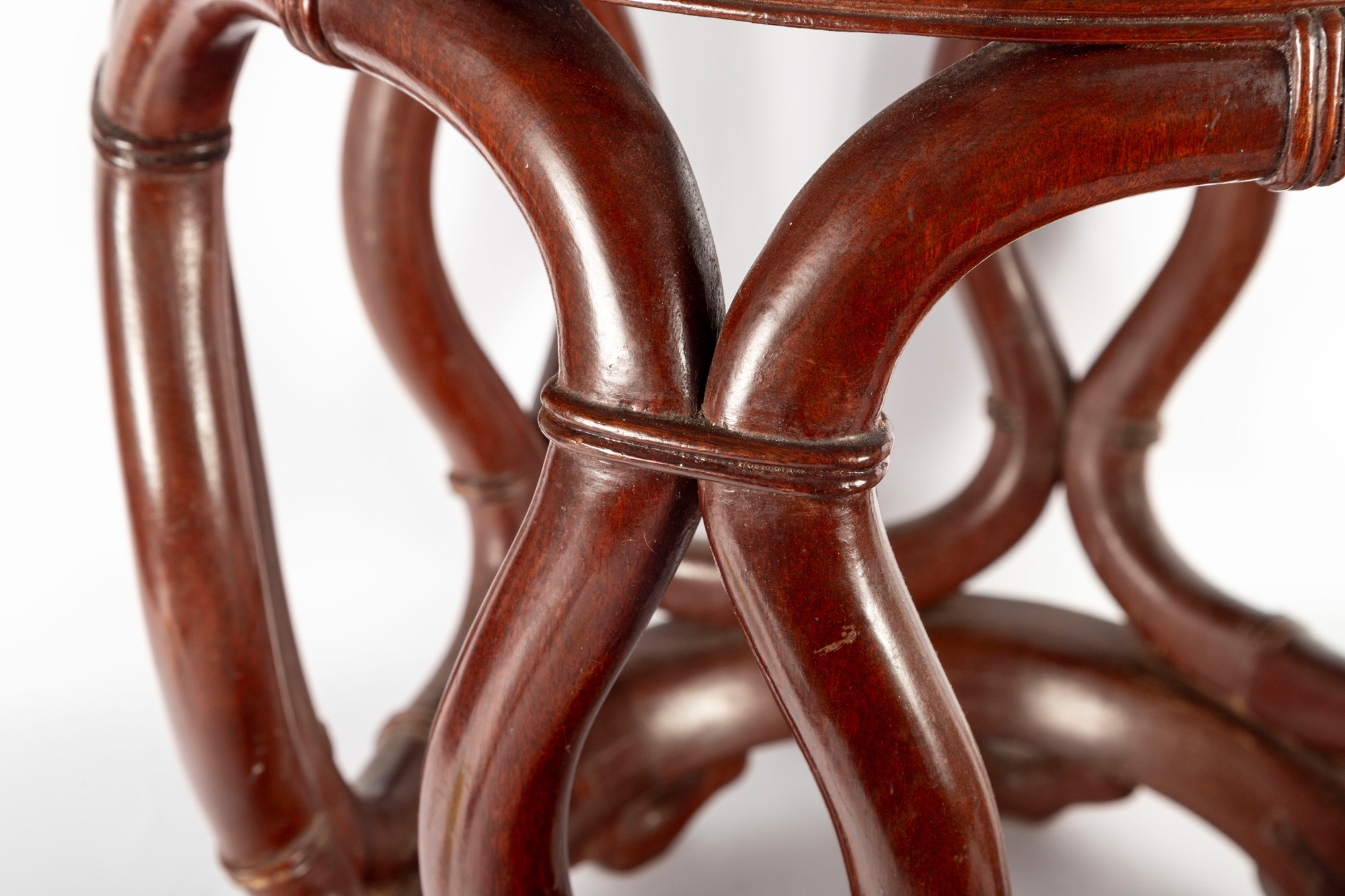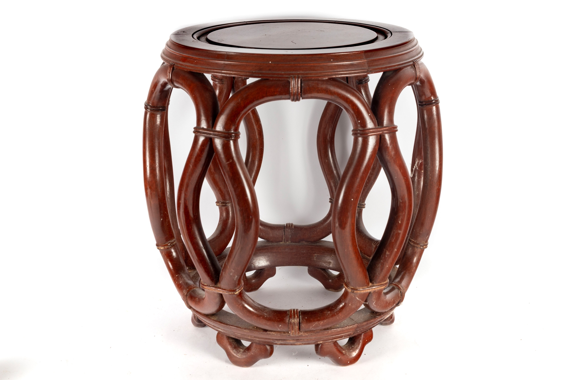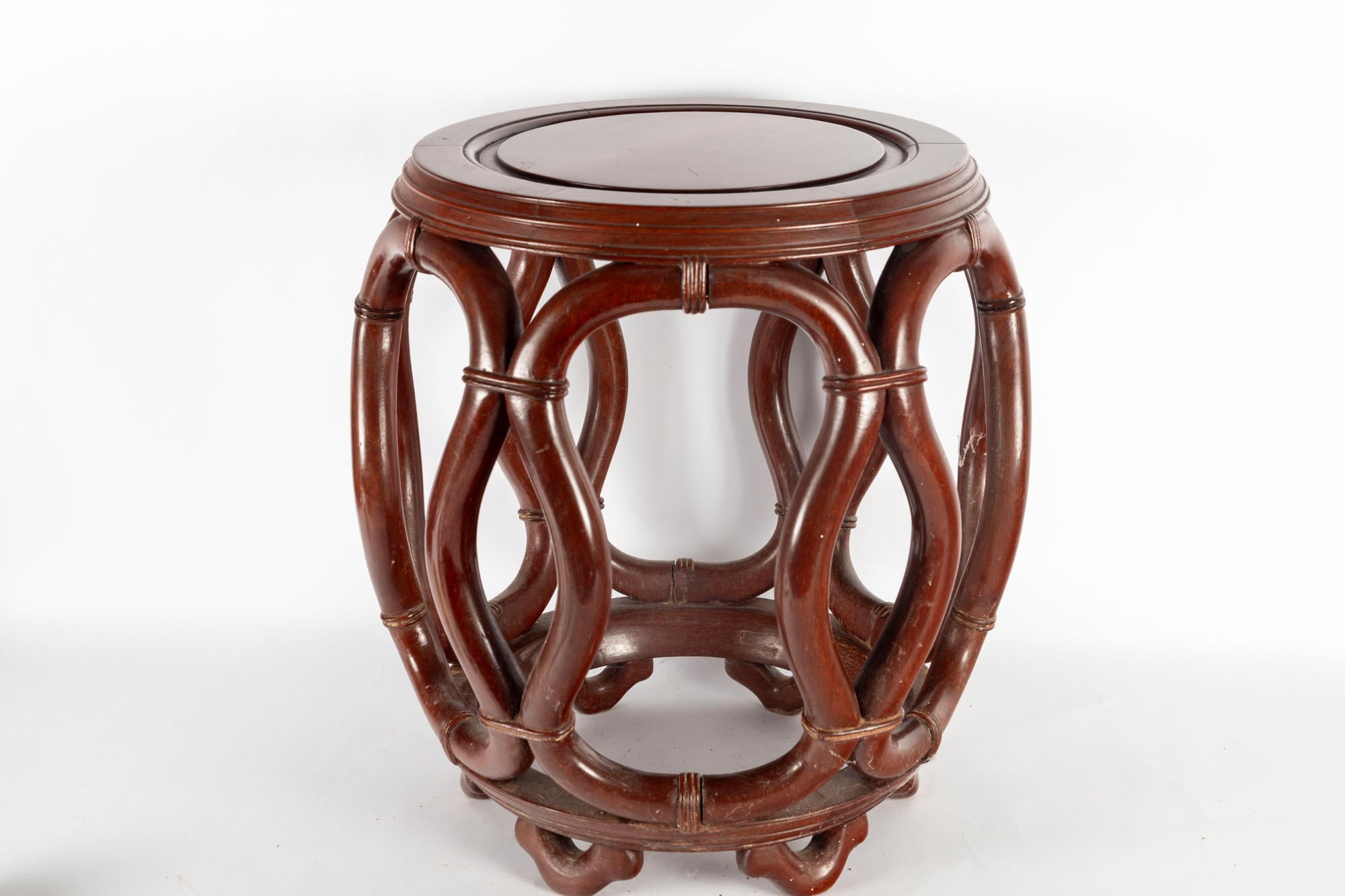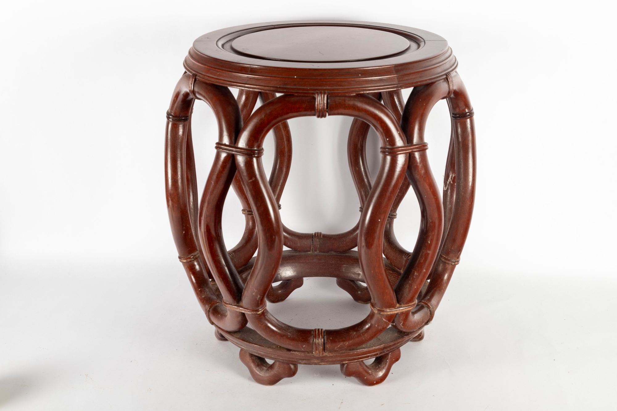 An elegant Asian-style mahogany finished bentwood drum stool or side table, featuring a rounded openwork design with natural wood grain finish.