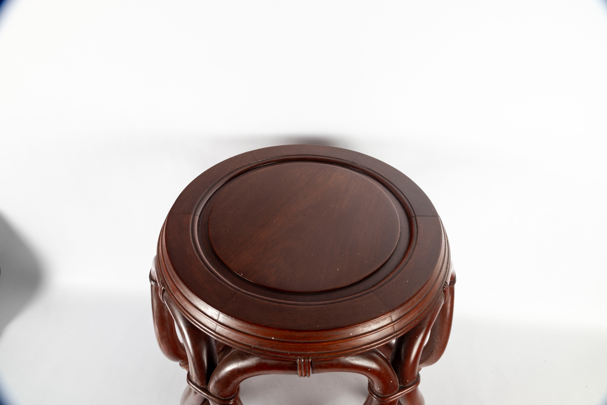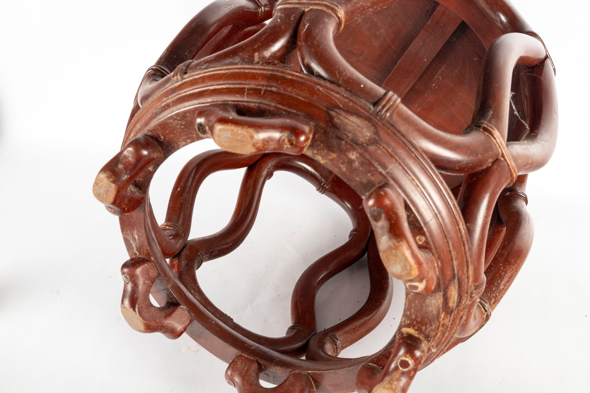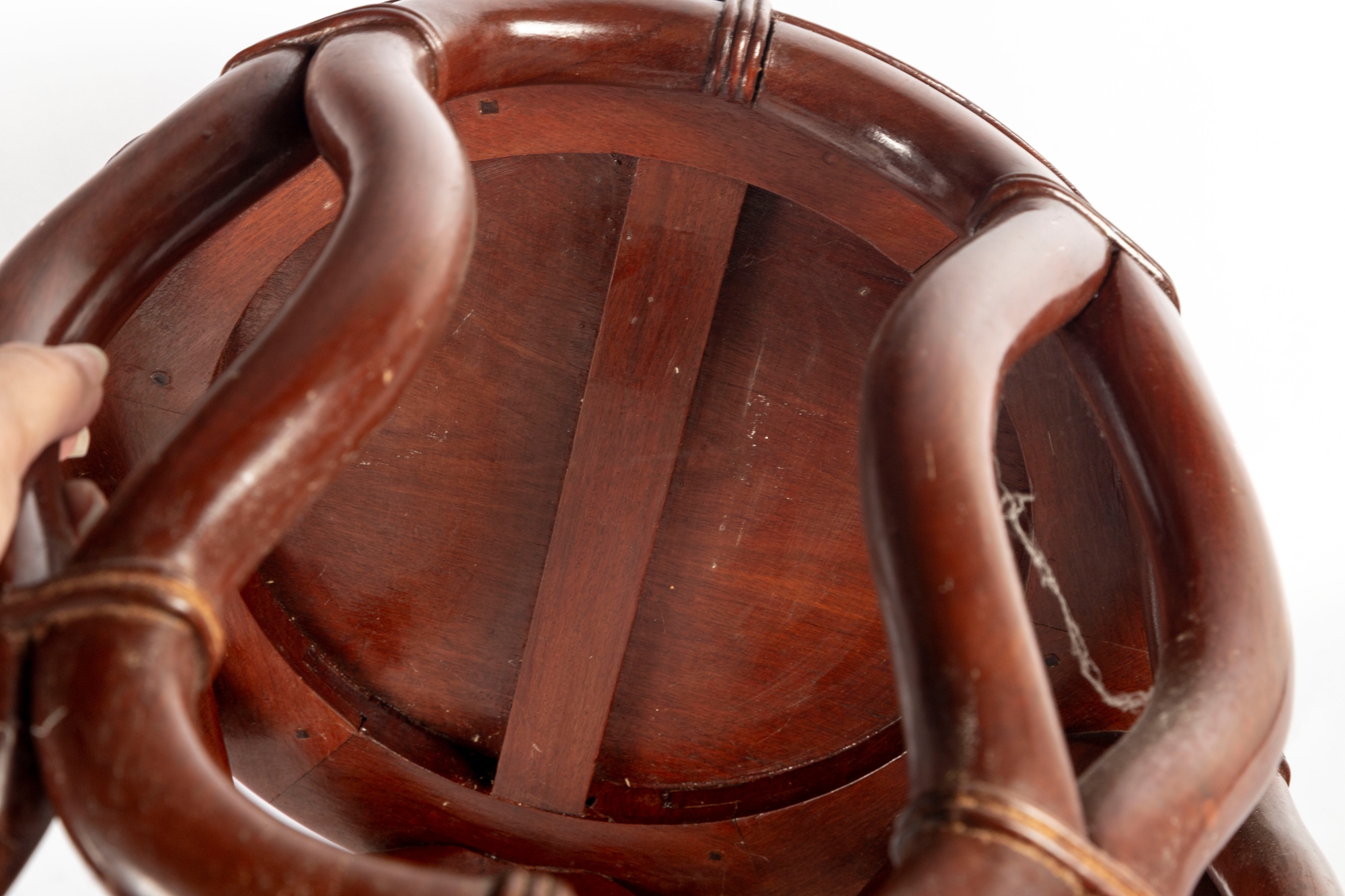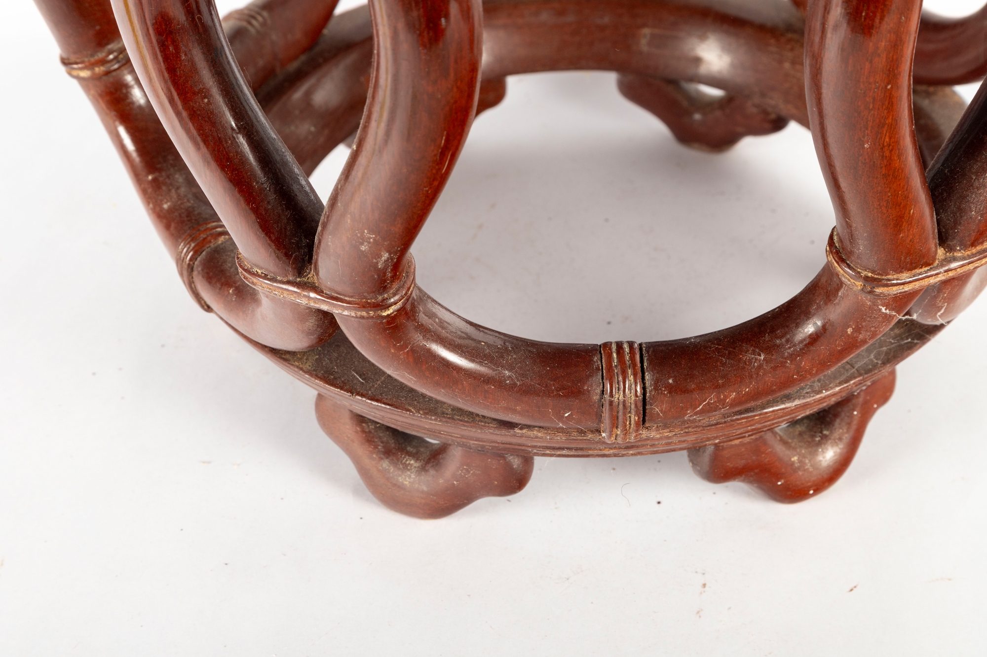 An elegant Asian-style mahogany finished bentwood drum stool or side table, featuring a rounded openwork design with natural wood grain finish.