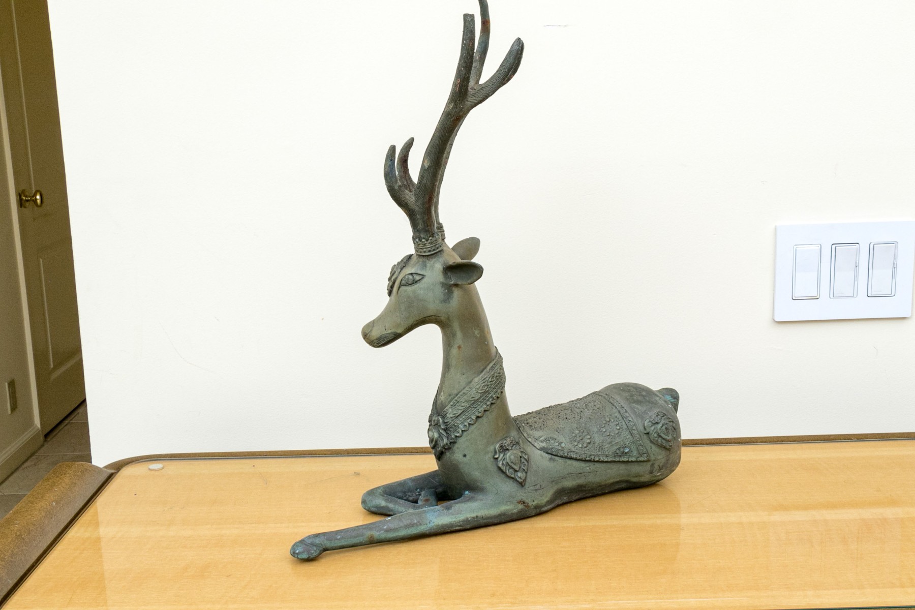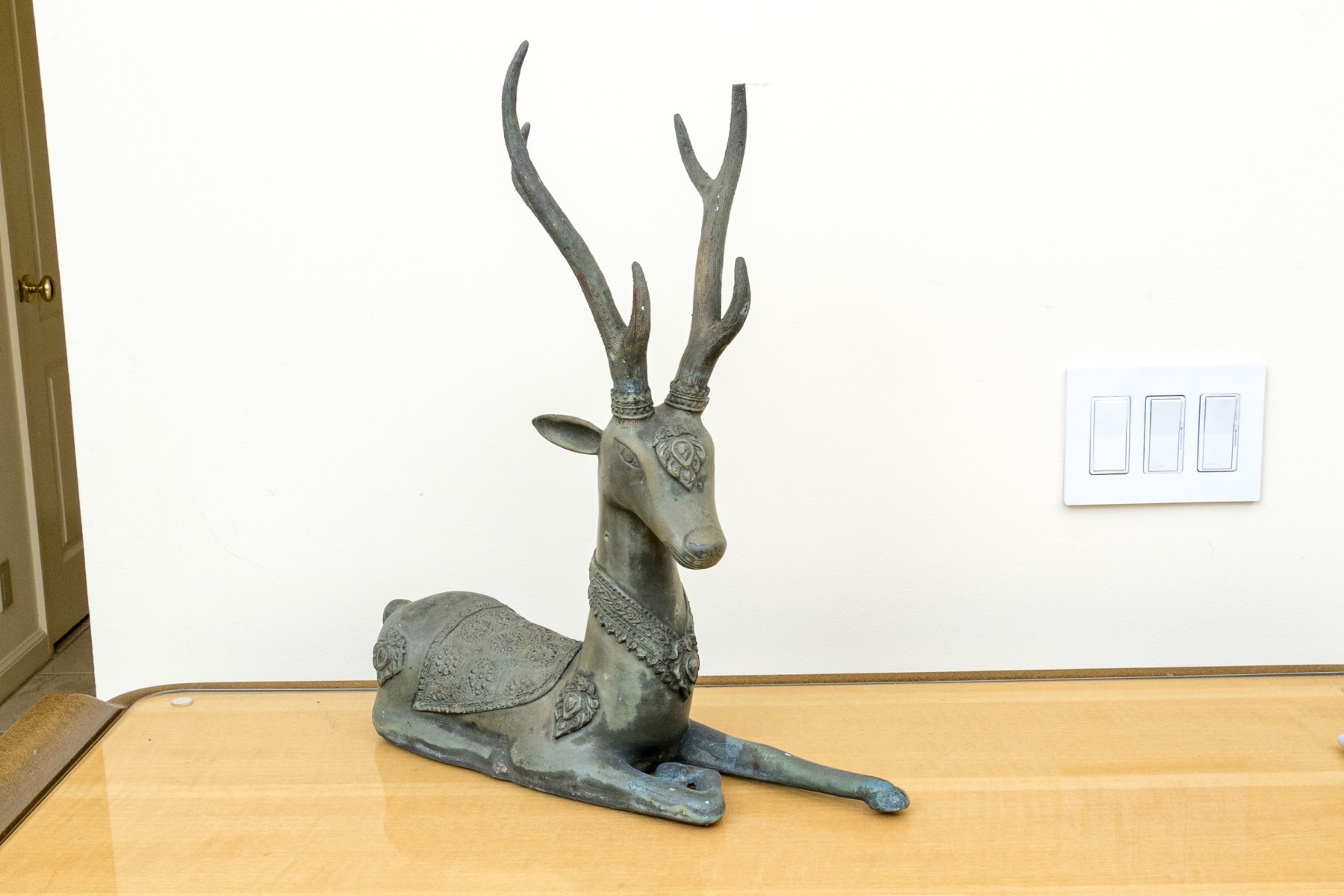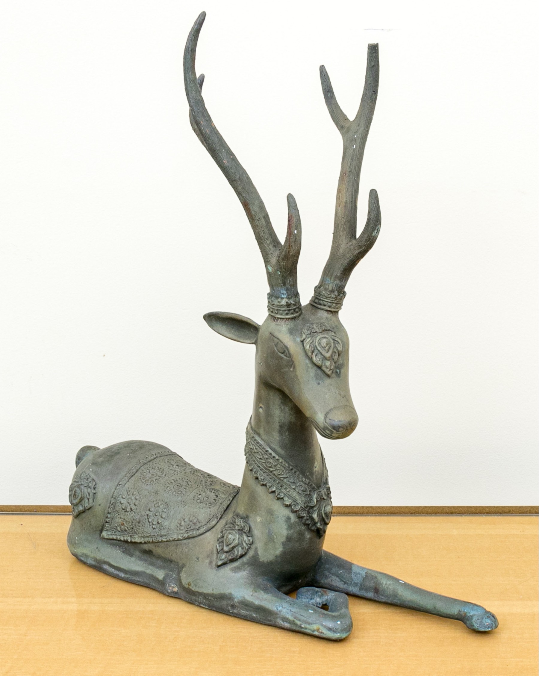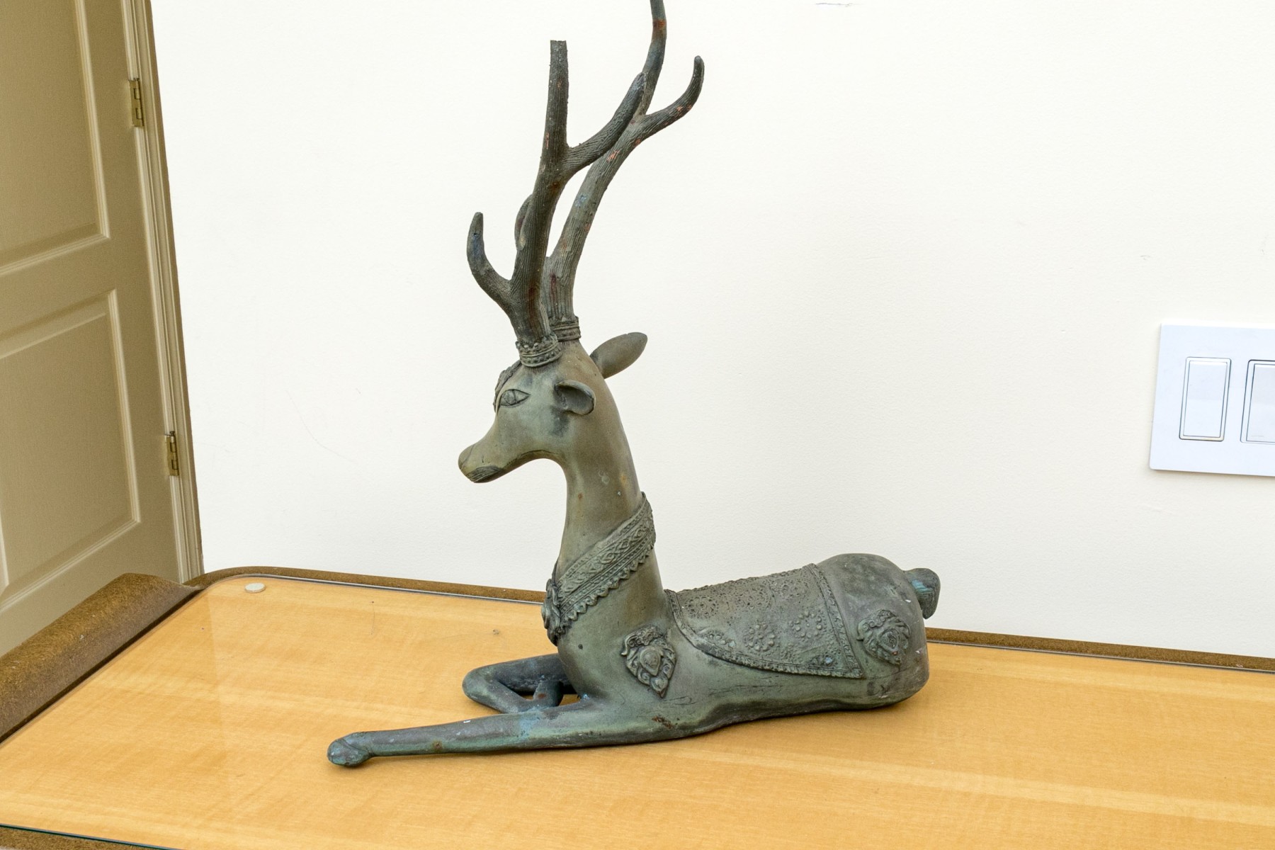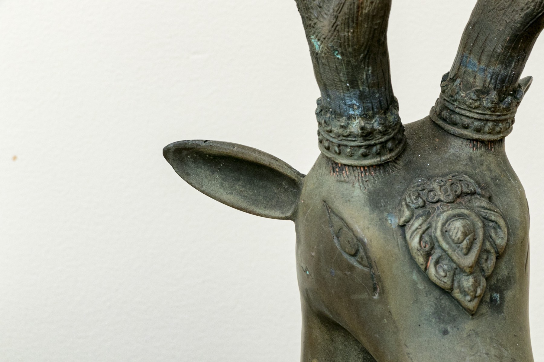 A beautiful Asian brass sculpture of a deer or antelope in a relaxed recumbent pose. Tall, impressively pointed horns are decorated with stippled bands around the bases, complimenting decorative relief on the forehead, neck, and back. Beautifully detailed and finished in an antiqued patina.
