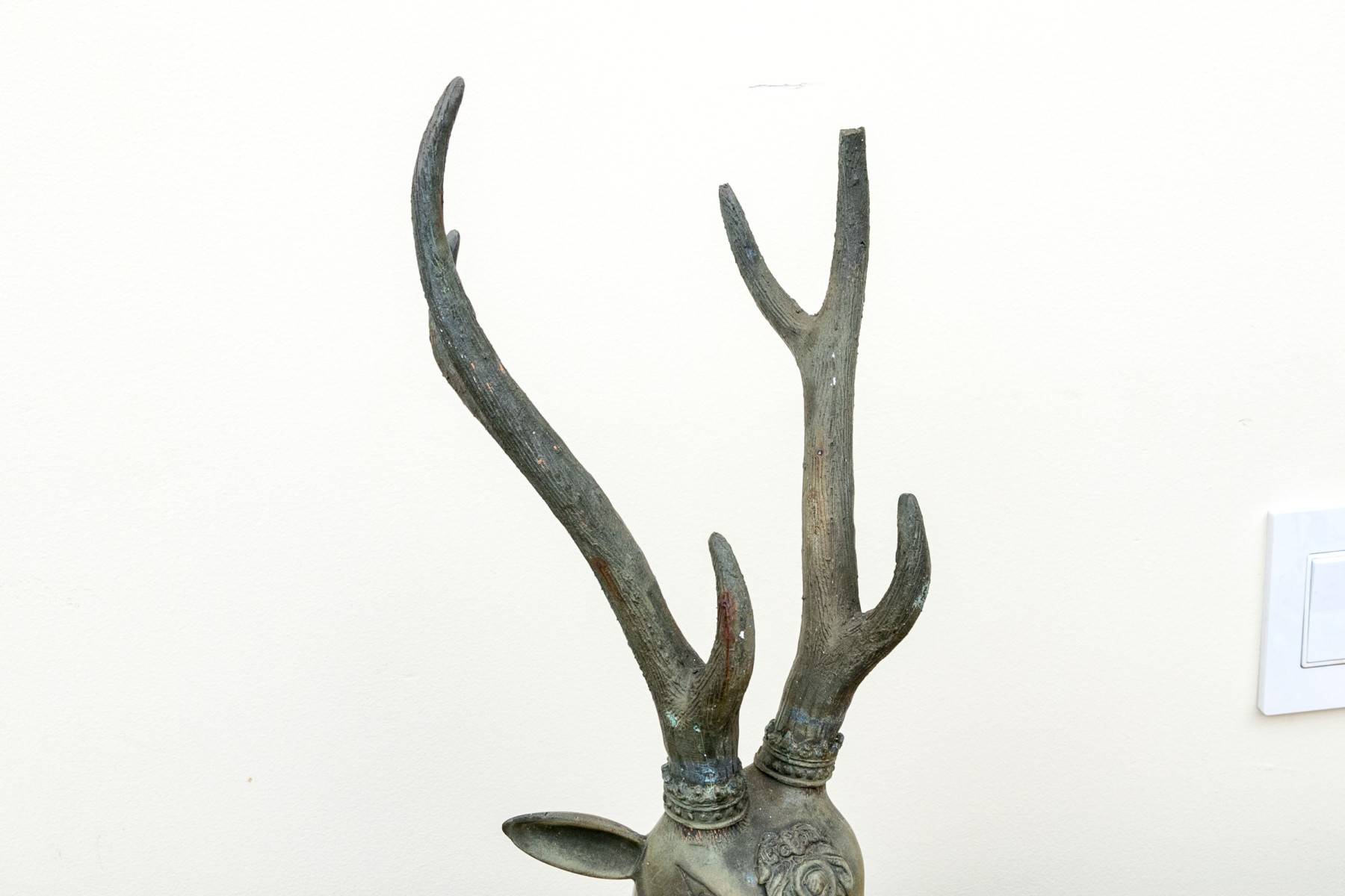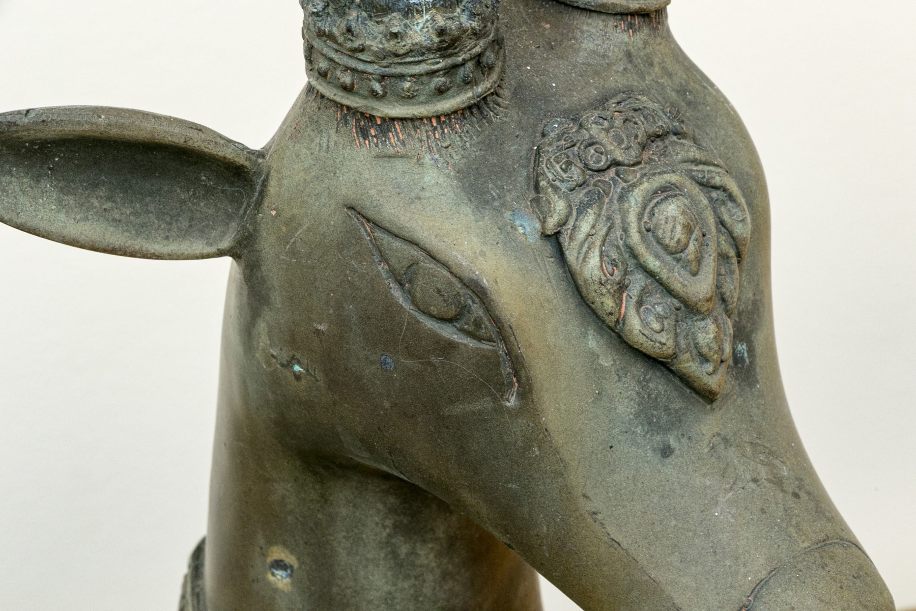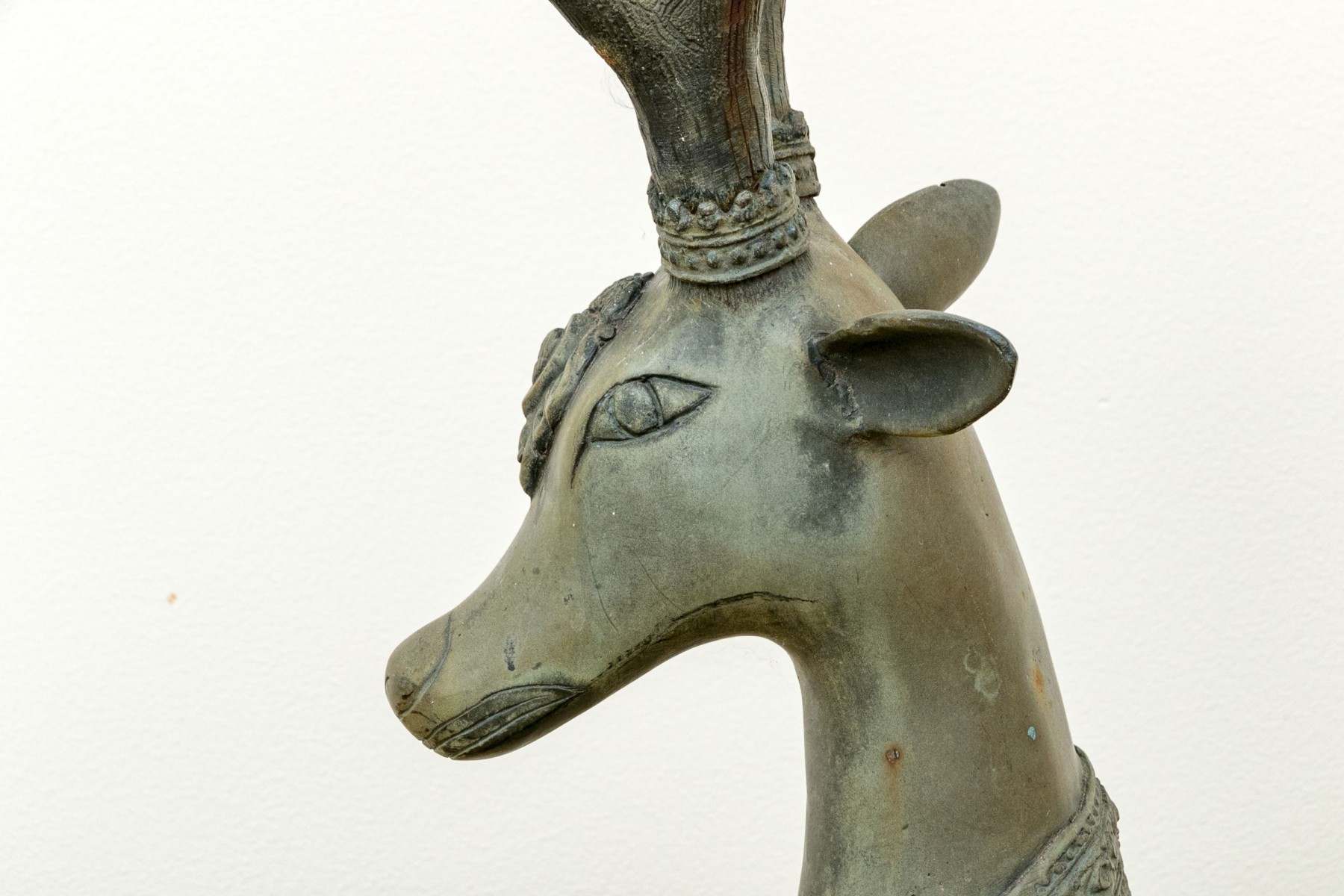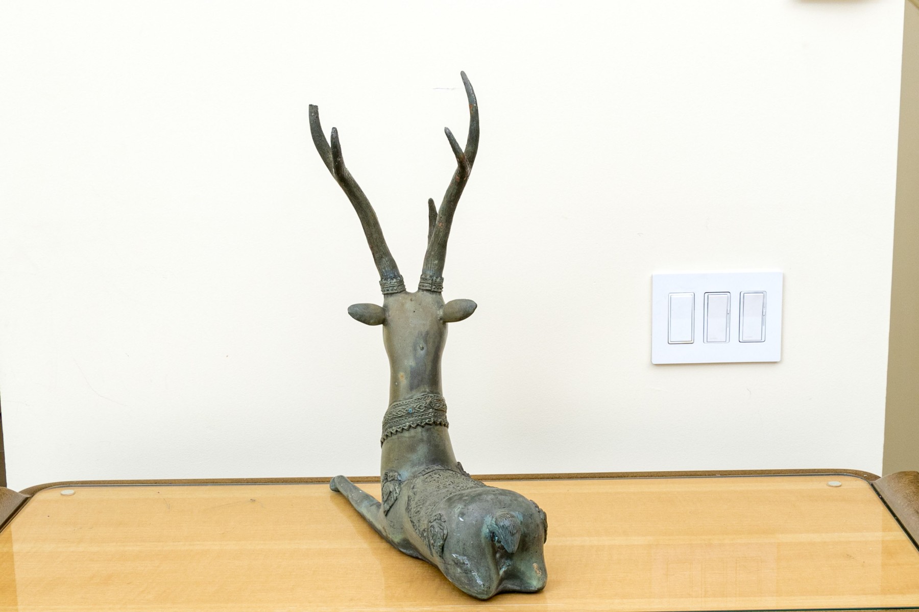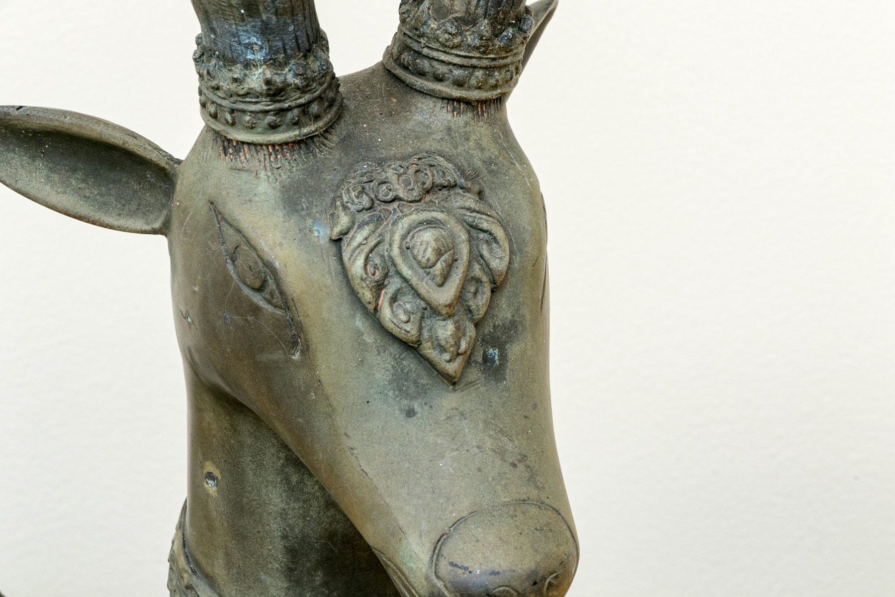 A beautiful Asian brass sculpture of a deer or antelope in a relaxed recumbent pose. Tall, impressively pointed horns are decorated with stippled bands around the bases, complimenting decorative relief on the forehead, neck, and back. Beautifully detailed and finished in an antiqued patina.